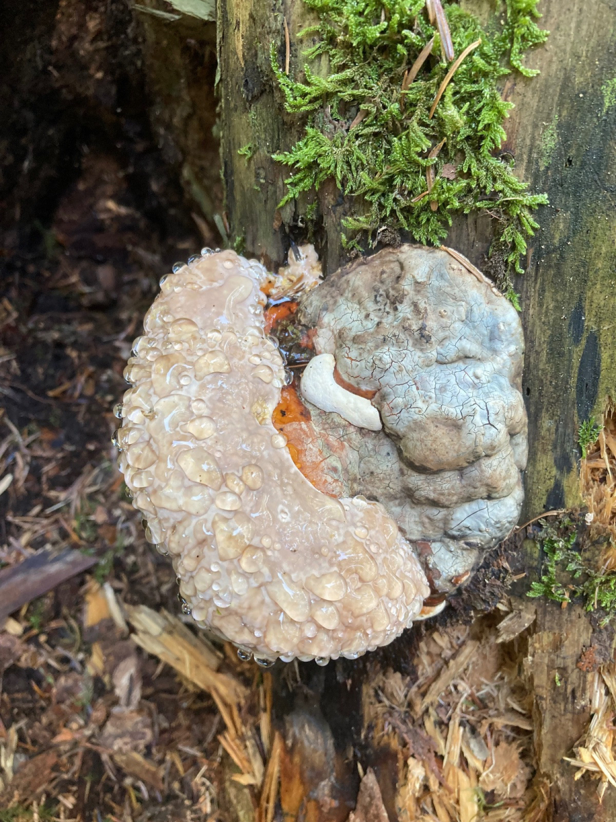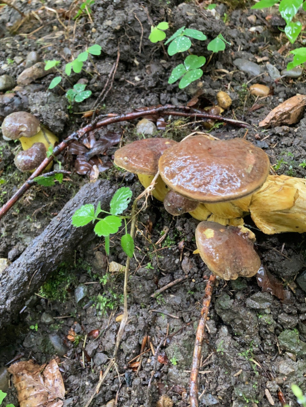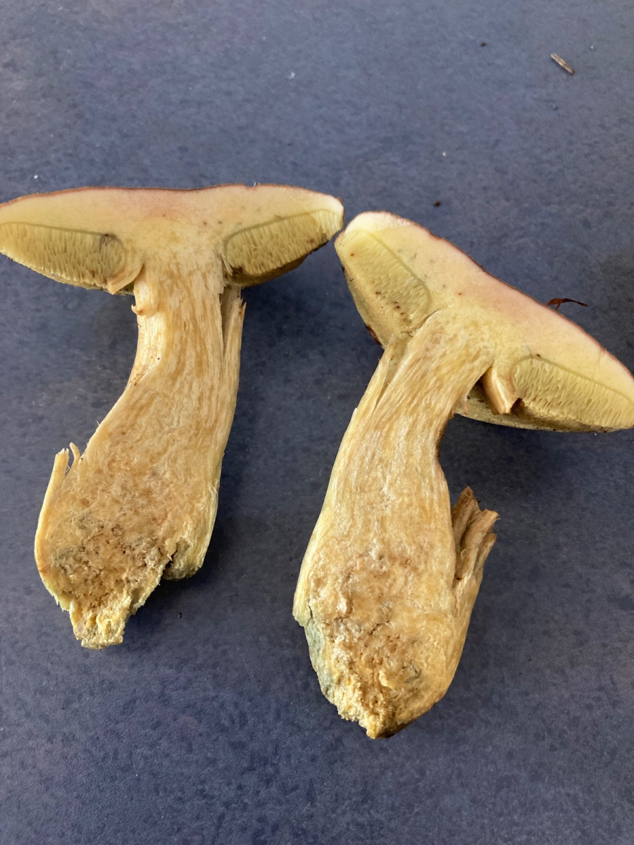 Diese Glücklichen kamen als einzige in den Genuss eines frühmorgentlichen zweiminütigen lokalen Gusses welcher nach fünf Minuten komplett verdunstet war. Vermute hier Xerocomus. Da Habitat am Bord eines reinen dichten Fichtenbestandes, tendiere ich auf Xerocomus ferrugineus? Speziell, wie die FK ineinander verwachsen sind: