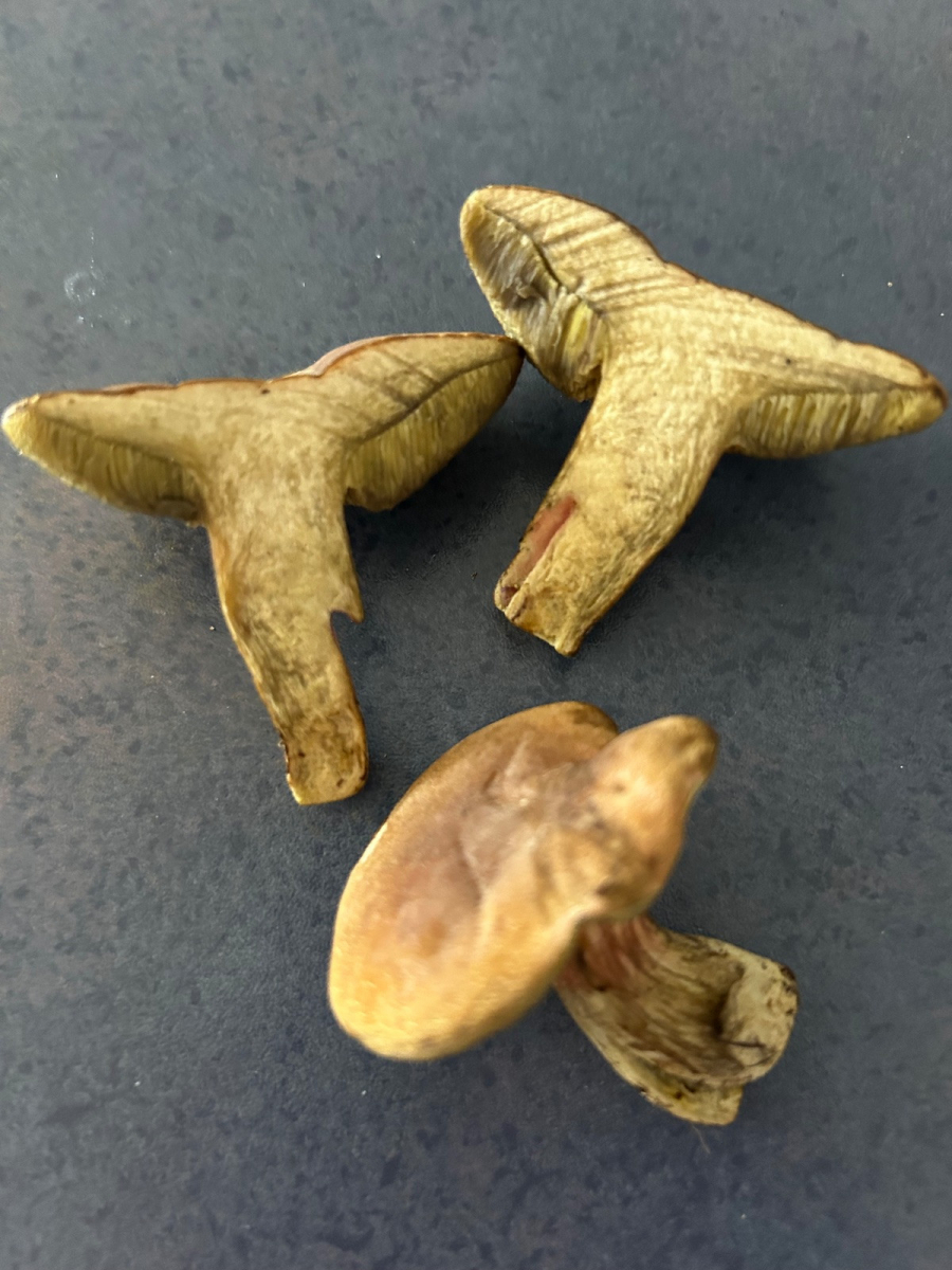 Für xerocomus communis spricht Fundort, Lammellenfarbe und Form, Fleischfarbe, Stiel ohne Netzzeichnung Geruch und Geschmack. Was mich irritierte war das doch sehr starke Blauen im frischen Schnittbild. Später verflüchtigte sich dies.