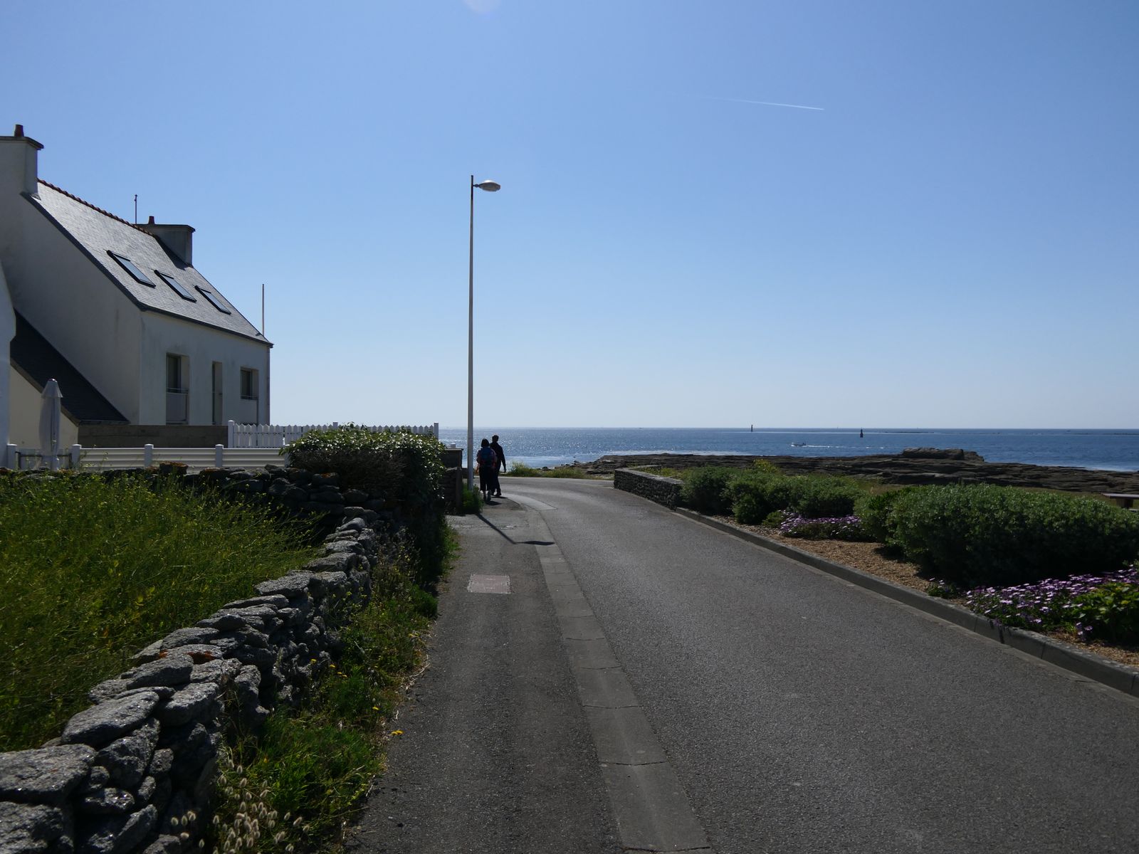 In Le Guilvinec, in der Bretagne, steht in unmittelbarer Nähe zum Meer eine hölzeren Barrikade an einem Fußweg in praller Sonne.