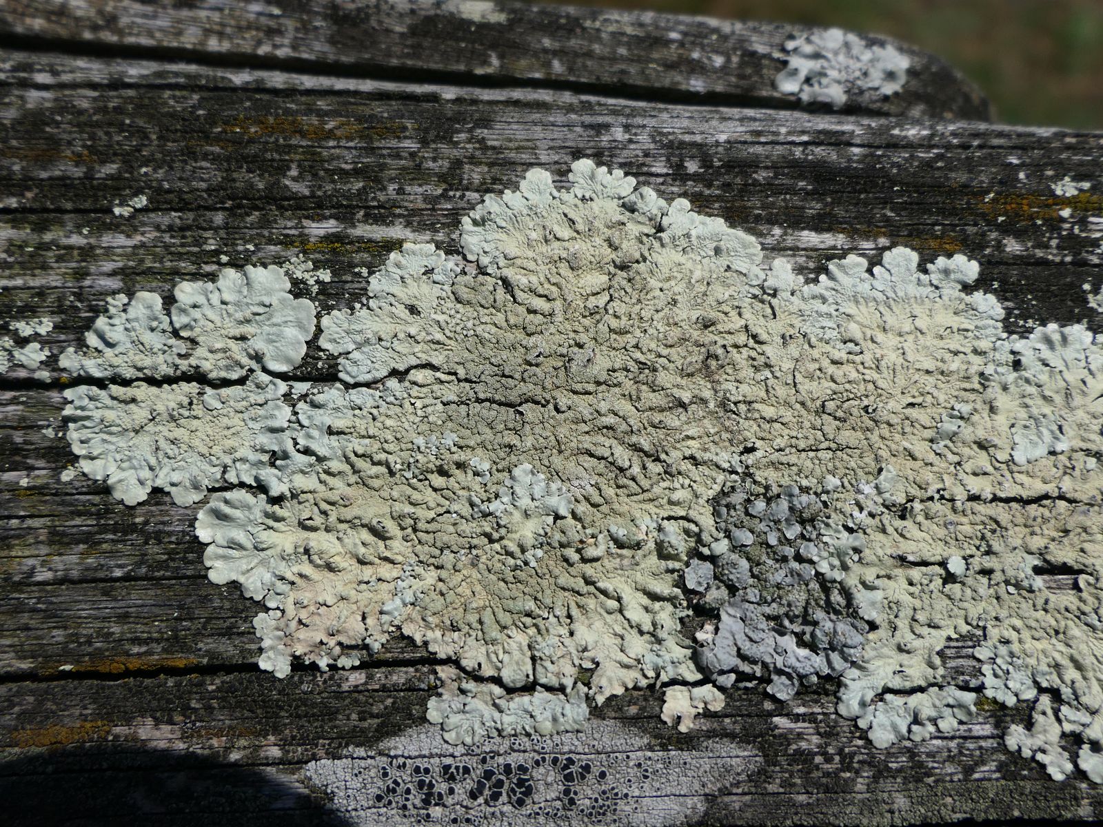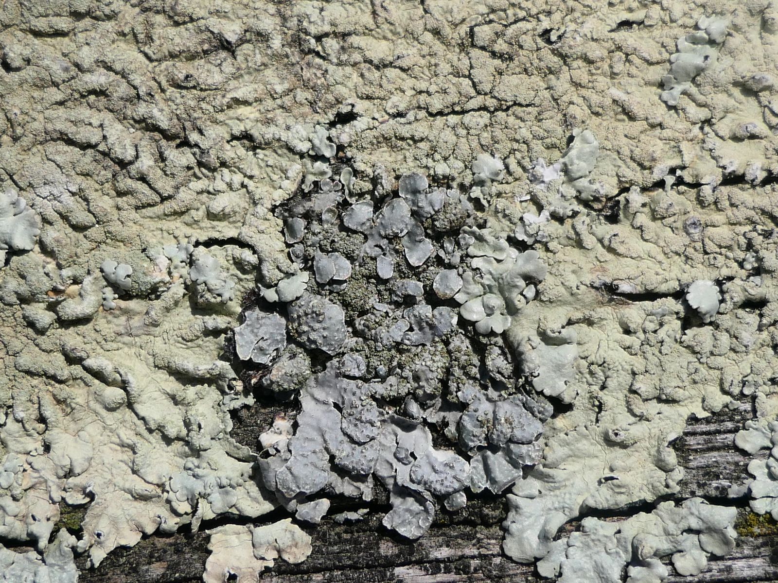 Bild 3 Blattflechten in praller Sonne auf trockenem Holz, eng anliegend: großflächig wachsend, die gelbgrüne und feinsorediöse Flavoparmelia soredians.