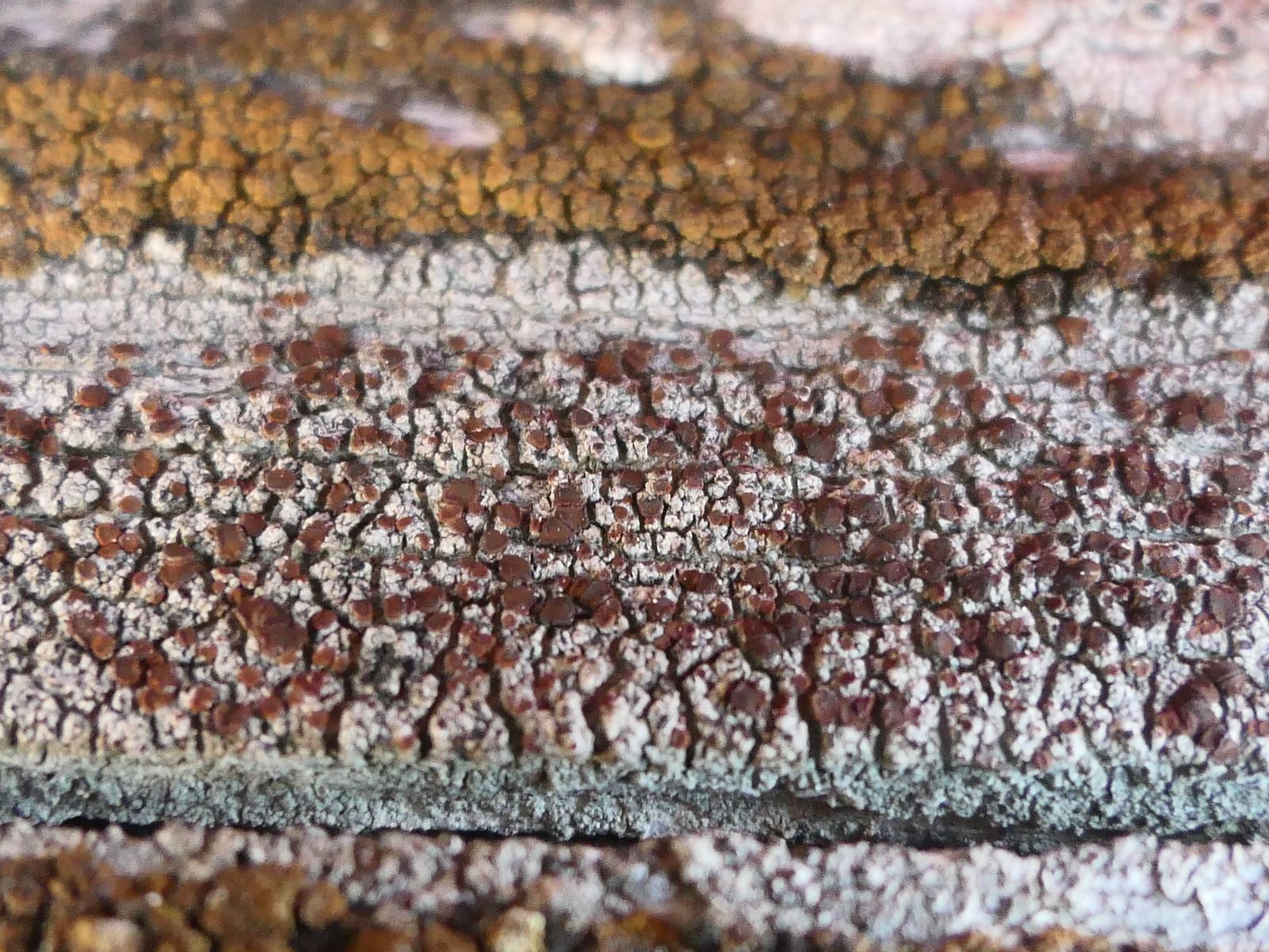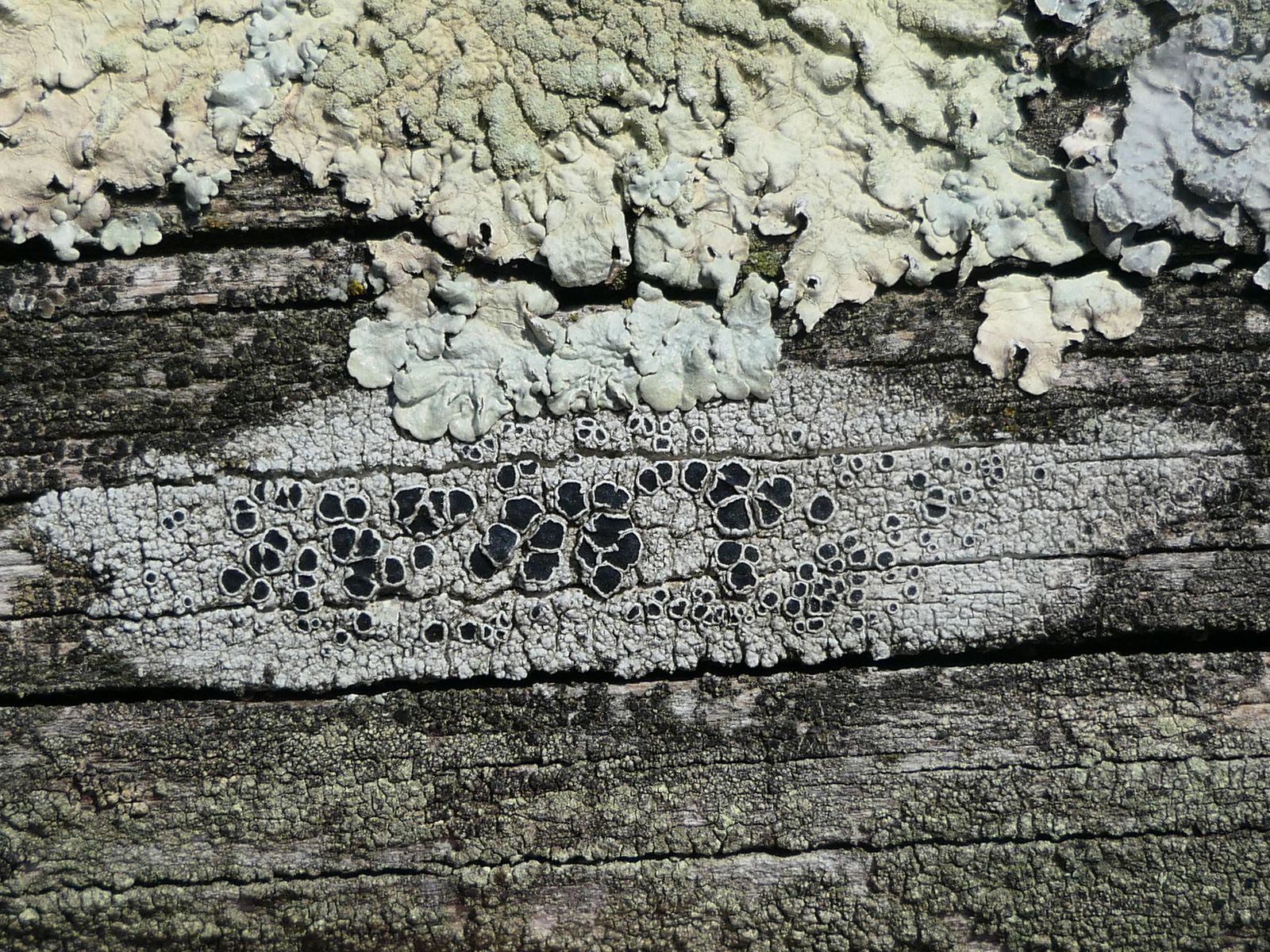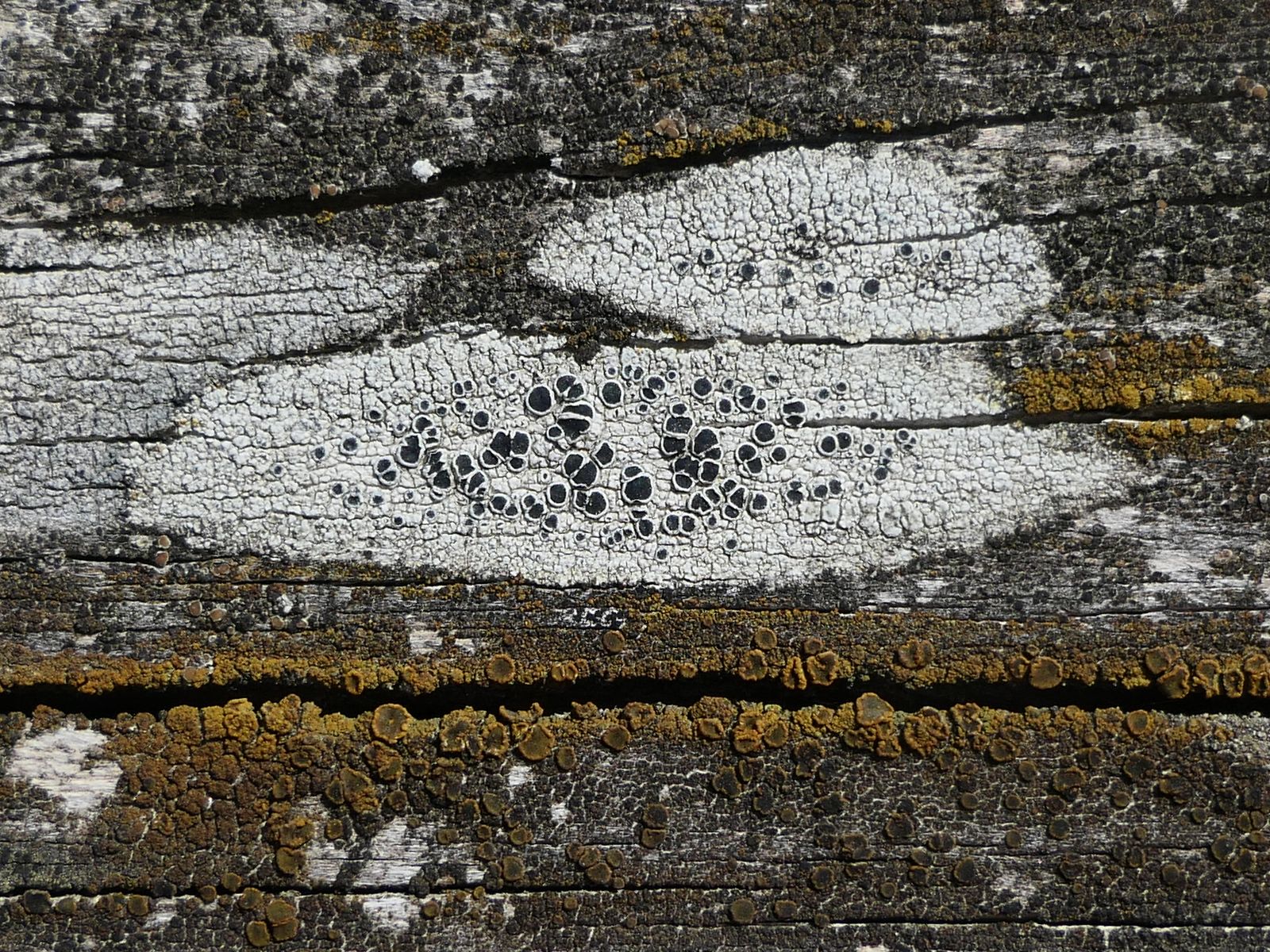 Bild 8a Tephromela atra hier mit schwarzem Vorthallus (links im Bild). Auch gelbe Krustenflechten finden sich auf dem Holzbalken.