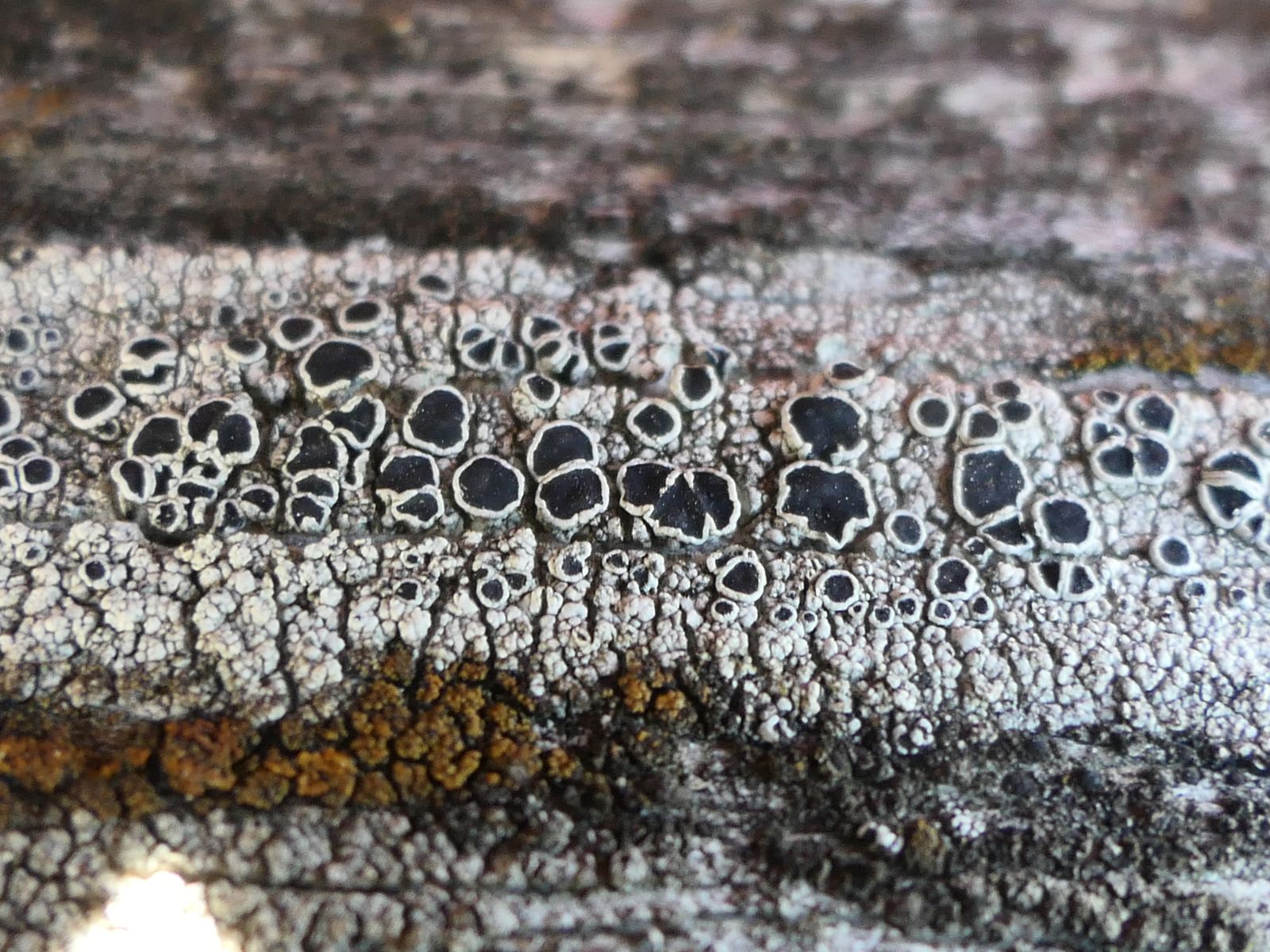 Bild 6 Neben den Blattflechten eine auffällige, lecanorine Krustenflechte mit körnig-weißem Thallus, glänzend schwarzen Apothecienscheiben mit verbeultem Rand.