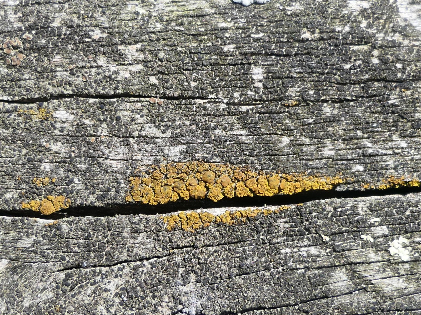 Bild 8b Stelle mit leuchtend gelbem Thallus neben Riss im Holz.