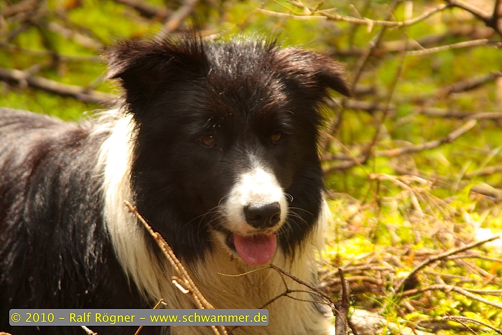 beschloss ich einen neuen Weg einzuschlagen, denn heute war sie wieder total im Jagdfieber und büxte mehrfach aus. Ist ja auch nicht verwunderlich, wenn irgendein Bekloppter mit seinem Auto auf gesperrten Wegen in den Wald fährt und nichts besseres zu tun hat, als seinen Hund eine lange Runde bellen zu lassen. Wo er denn genau stand konnte ich nicht einschätzen, aber schwups - Molly schiesst los, kein Halten mehr! Das war dann weniger schön, denn jedes Rufen ging an ihr vorüber. Also schnell den Korb abgestellt und hinterher gestürmt, dabei weiter freundlich rufend, damit sie nicht den Eindruck bekommt es würde gleich eine Schimpftirade folgen (machen wir sowieso nie). Sie blieb dann auch endlich stehen und ich nahm sie erst einmal an die Leine.