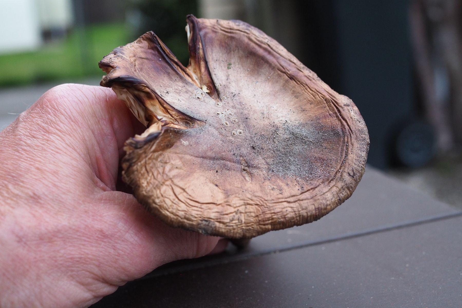 am 14. Juli habe ich auf dem Rasen bei einer Birke im Vorgarten in meiner Nachbarschaft einige Pilze gesehen, die ich nicht zuordnen kann. Ich habe einen davon mitgenommen und fotografiert. Er ist bereits etwas ins Alter gekommen aber vielleicht kann jemand weiterhelfen.