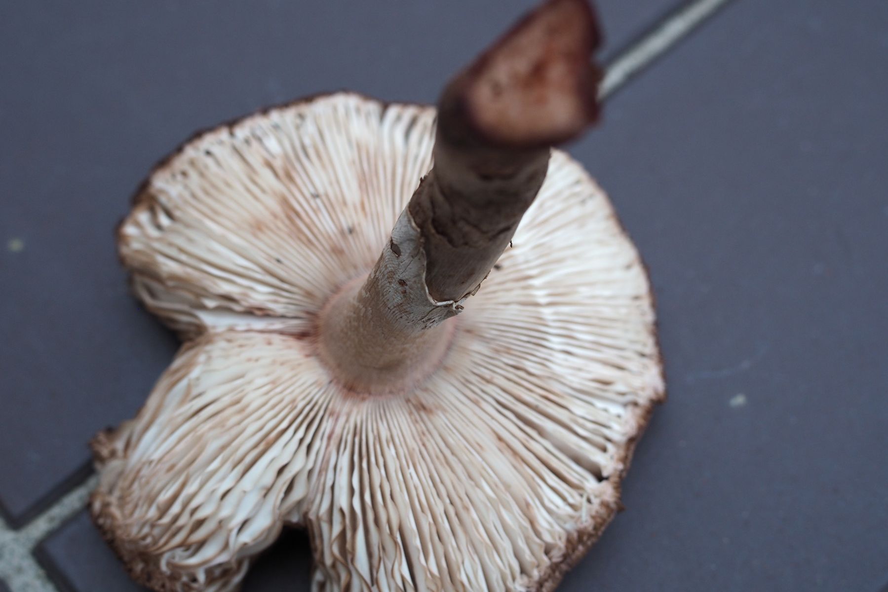 Der Stiel ist an der Spitze heller und m. E. genattert. Unterhalb des herabfallenden Ringes ist der Stiel dunkler braun. Er ließ sich leicht aus dem Hut brechen.