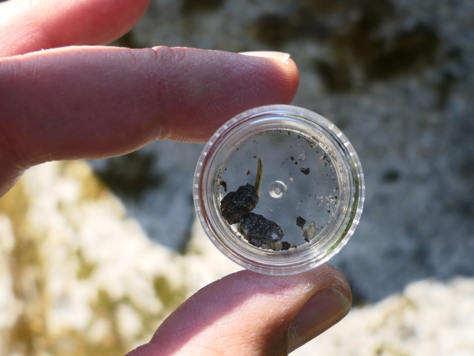 Bild 5 Zwei überwachsene Körner lassen sich aus der angewitterten Oberfläche von Hand lösen und wandern zur späteren Analyse mit.