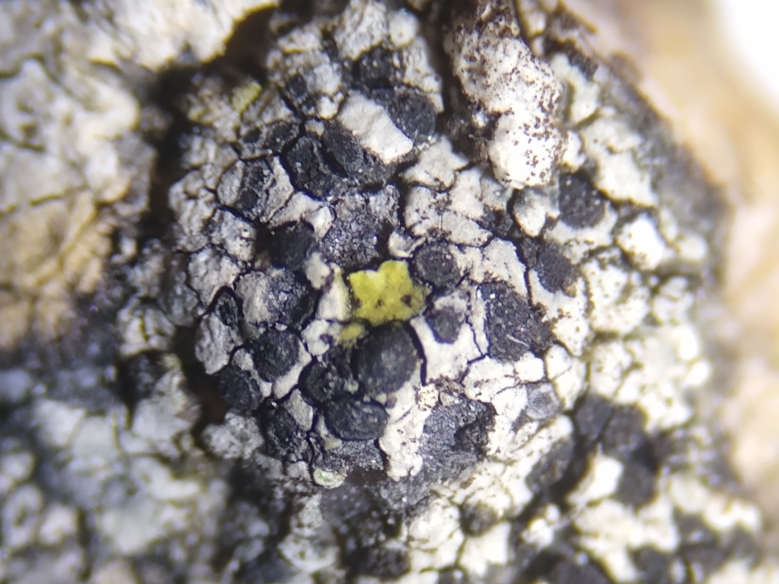 Bild 6 Lupenbild vom grauweißen, bereiften, areolierten Thallus (keine Gelbtöne!) mit eingestenkten, schwarzen (besser schwarzbraunen), lecideinen Apothecien.