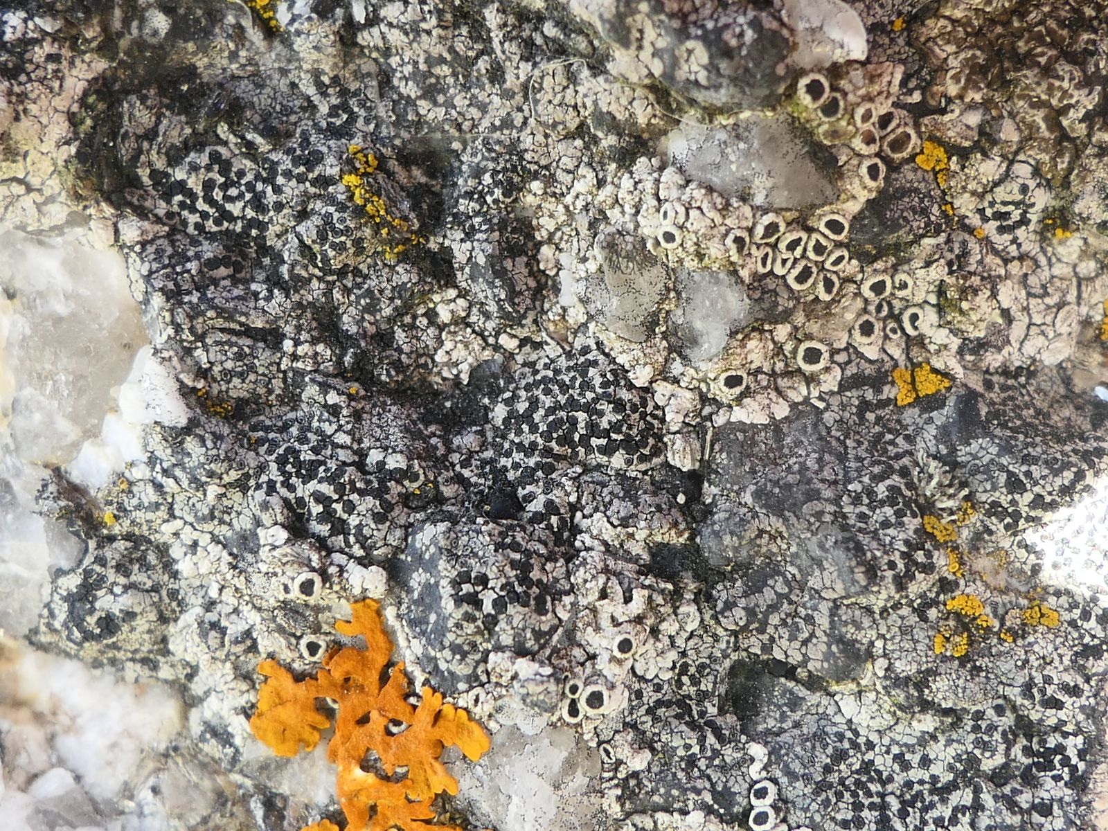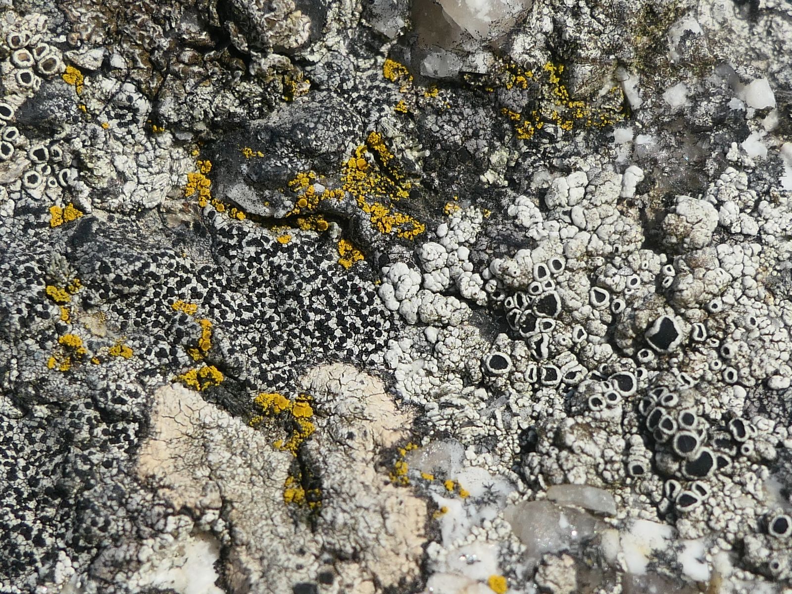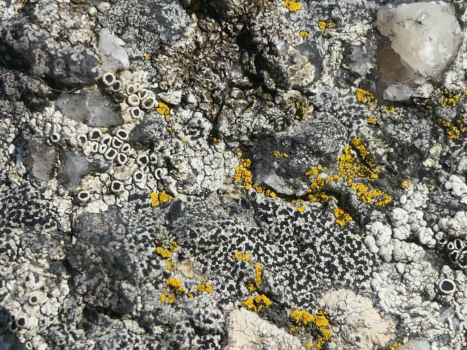 Bild 2 Flechtenmaosaik auf Granitoberfläche - auf halber Bildhöhe links der Mitte eine schwarz-weiße, fein strukturierte Krustenflechte.