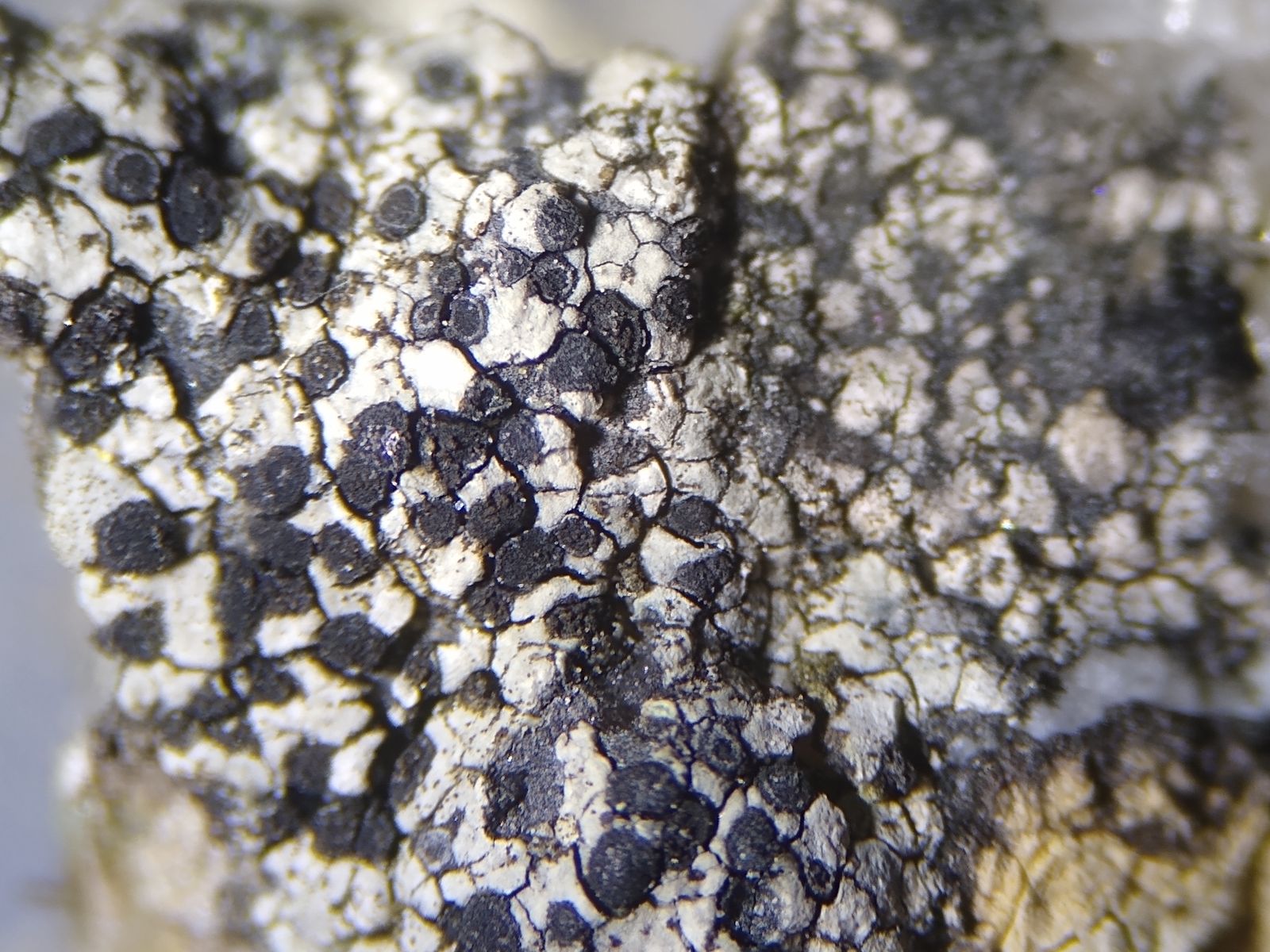 Bild 6 Lupenbild vom grauweißen, bereiften, areolierten Thallus (keine Gelbtöne!) mit eingestenkten, schwarzen (besser schwarzbraunen), lecideinen Apothecien.