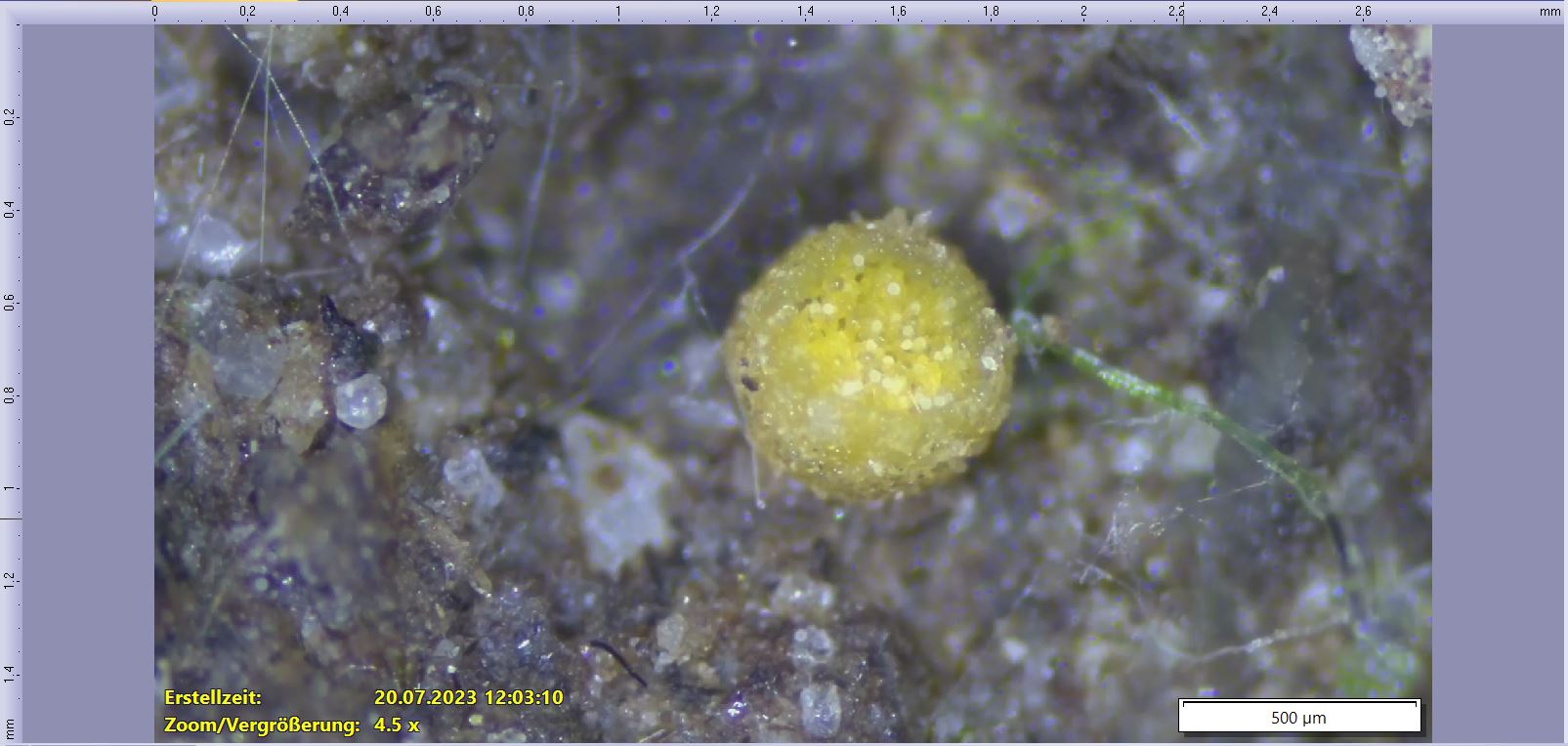 Als ich dann nochmals ĂŒber dem Stero-Mikroskop die FK begutachtete, sah ich da plötzlich zwei Interessante gelbe Punkte sehr klein <1mm. Viele Versuche hatte ich nicht zum bestimmen, weil das Material rasch weg wahr.