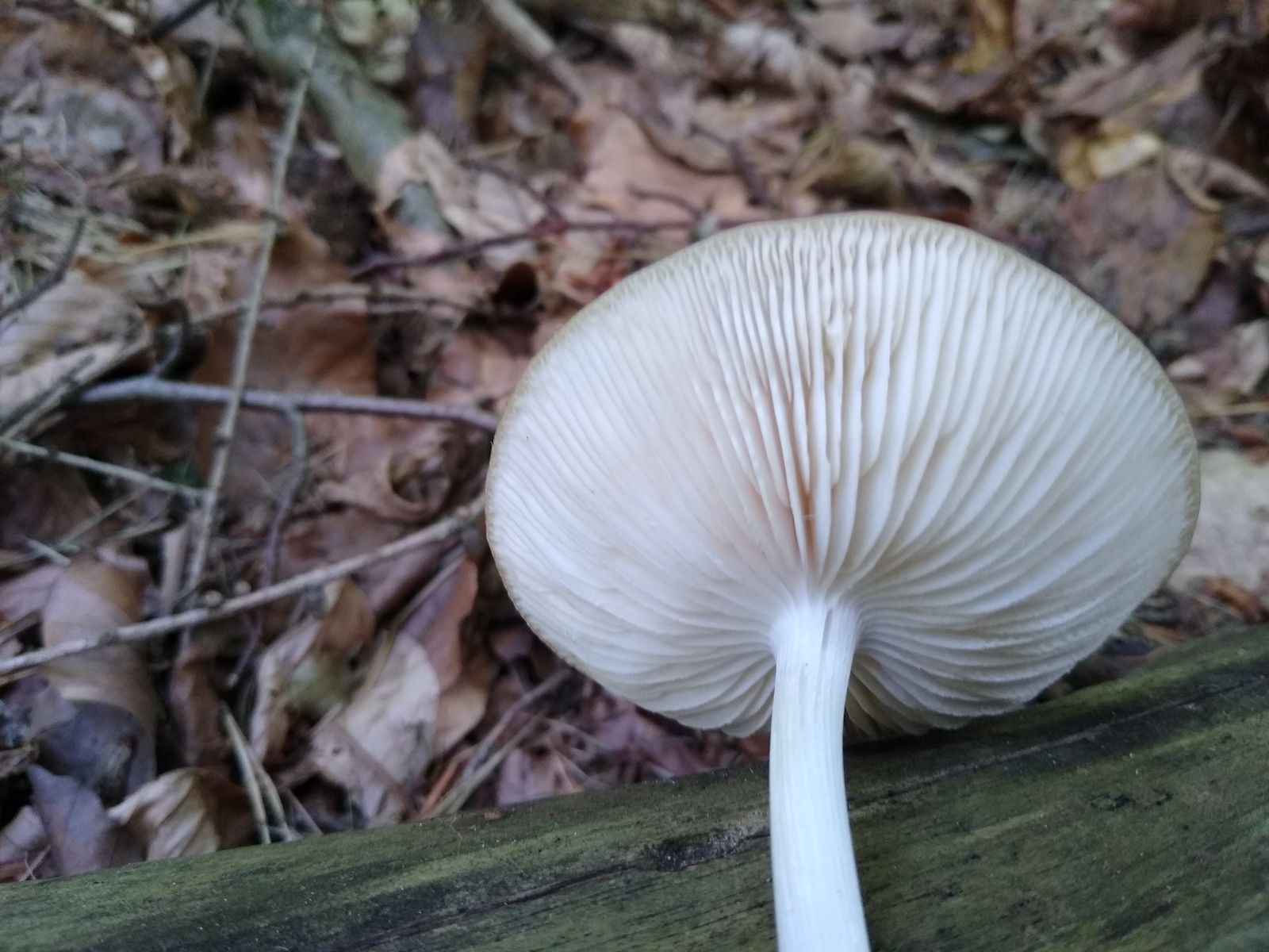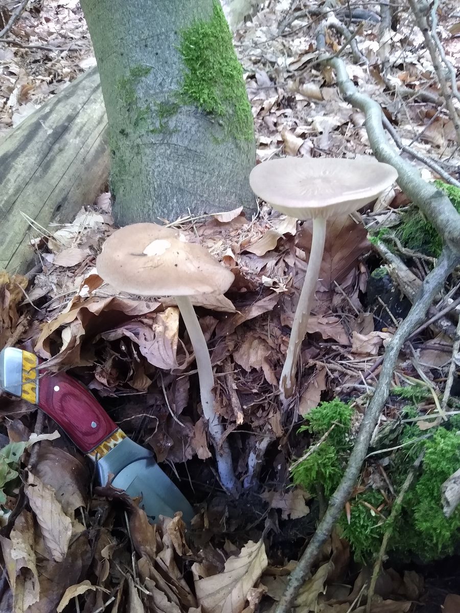 Der Pilz wuchs als verzeigtes Duo dicht an einer Rotbuche (?) aus der Laubstreu empor.
