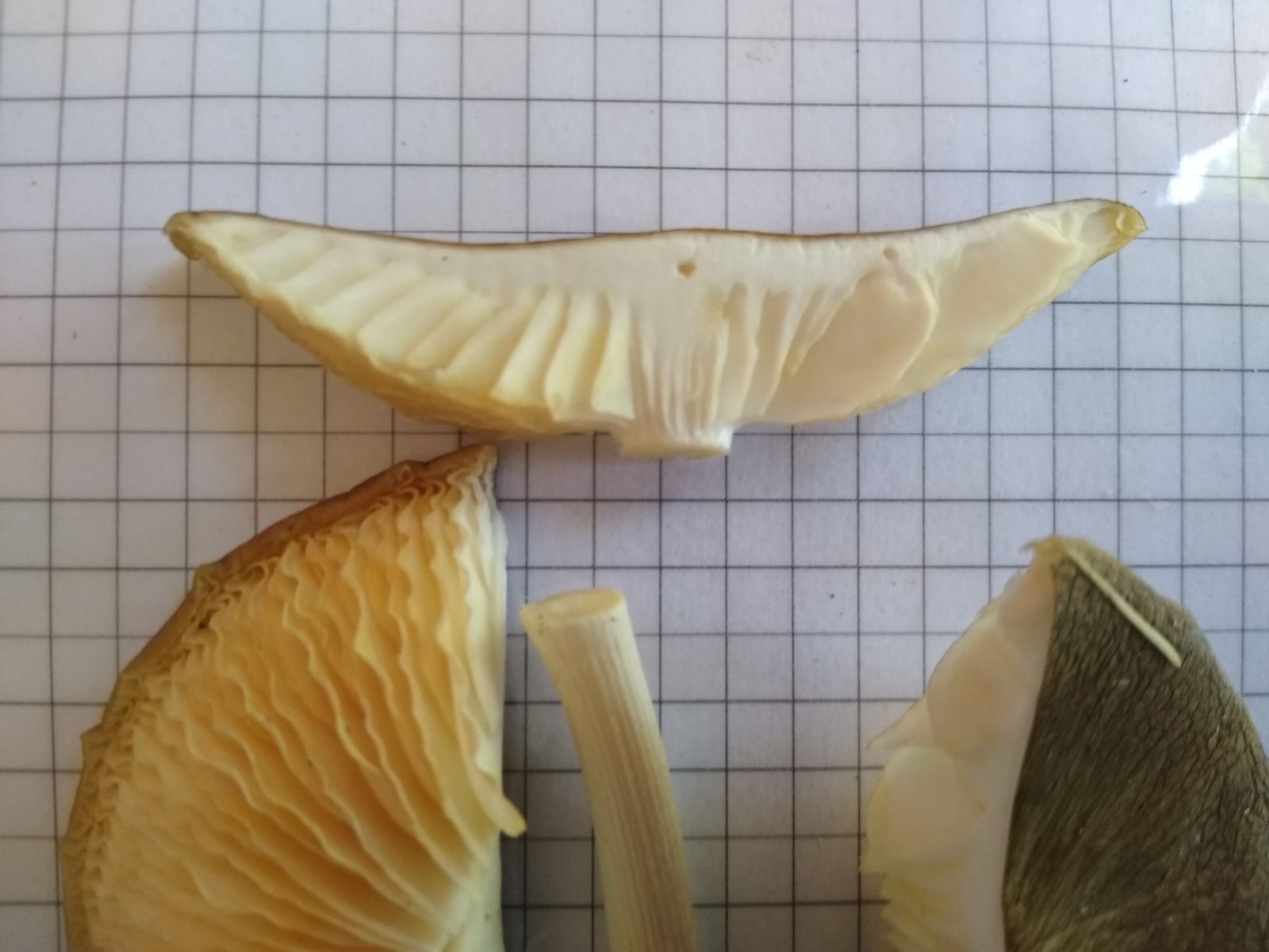 Das Mikroskopbild ist parallel zu Lamellenoberfläche gemacht, zeigt also wenn, dann Pleurozystiden.