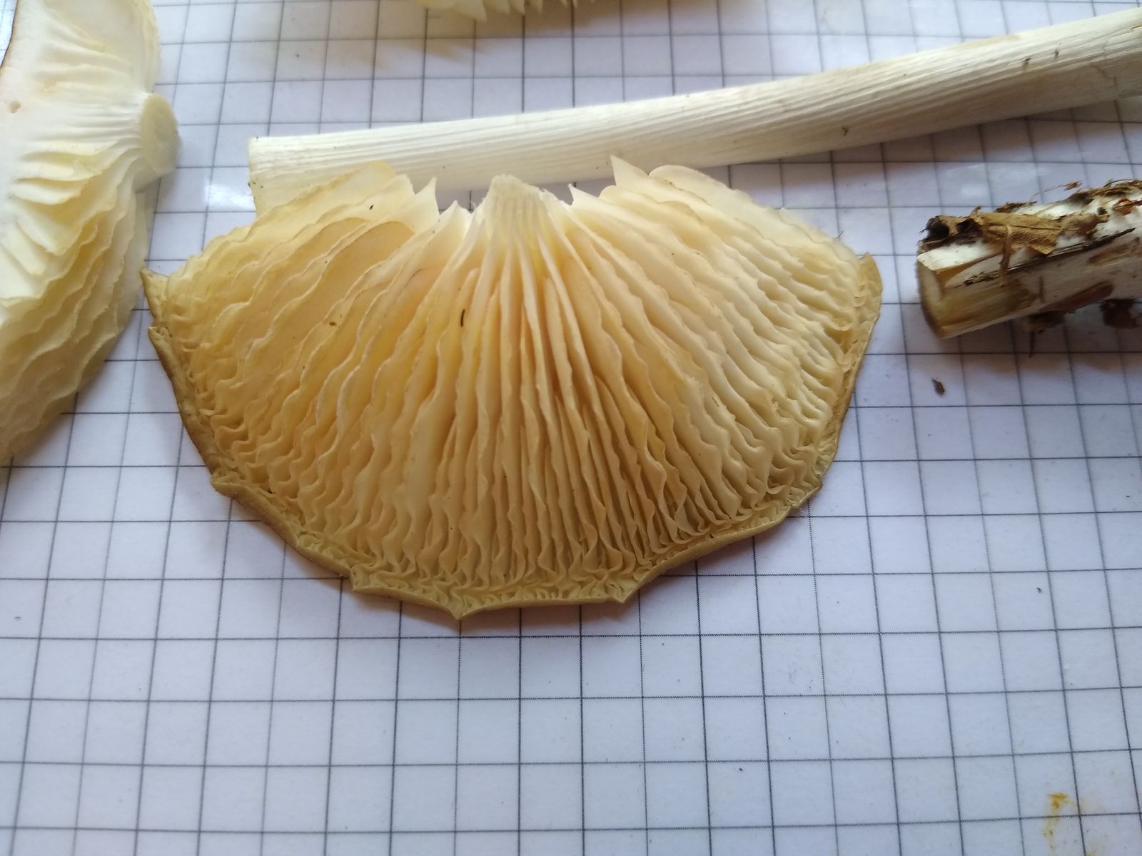 Bild 3 Lamellen weiß, orange überhaucht, weit ausgebuchtet angewachsen; Stiel verdreht fasrig, weiß, braun überhaucht und hohl