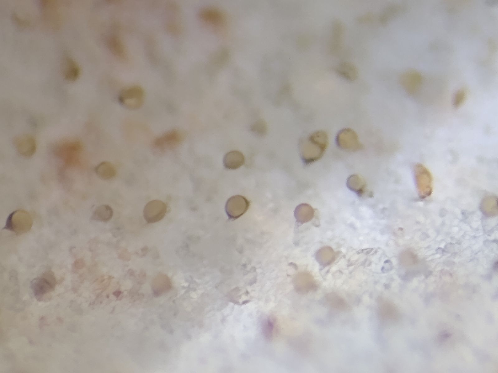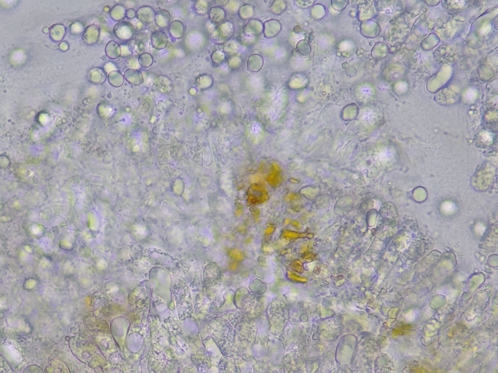 • Ich glaube, die gelb-orangen Kügelchen sind tatsächlich die passneden (angetrocknete) Pleurozystiden, wie Thorben sie gezeigt hat.