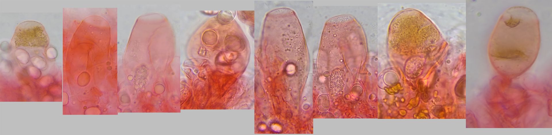 Bild 14 Bildersammlung Pleurozystiden (1000x in Wasser, mit Kongorot eingefärbt)