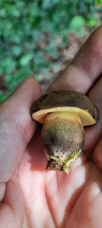 Ich denke, dass es ein düsterer Rotfußröhrling ist. Fotos anbei. In dem Wald gab es sonst viele Täublinge und Perlpilze und immer mal Rotfußröhrlinge. An zwei Stellen konnten wir sogar einige Pfifferlinge finden, was für unsere Gegend ganz im Norden/Nordwesten Deutschlands schon ungewöhnlich ist.