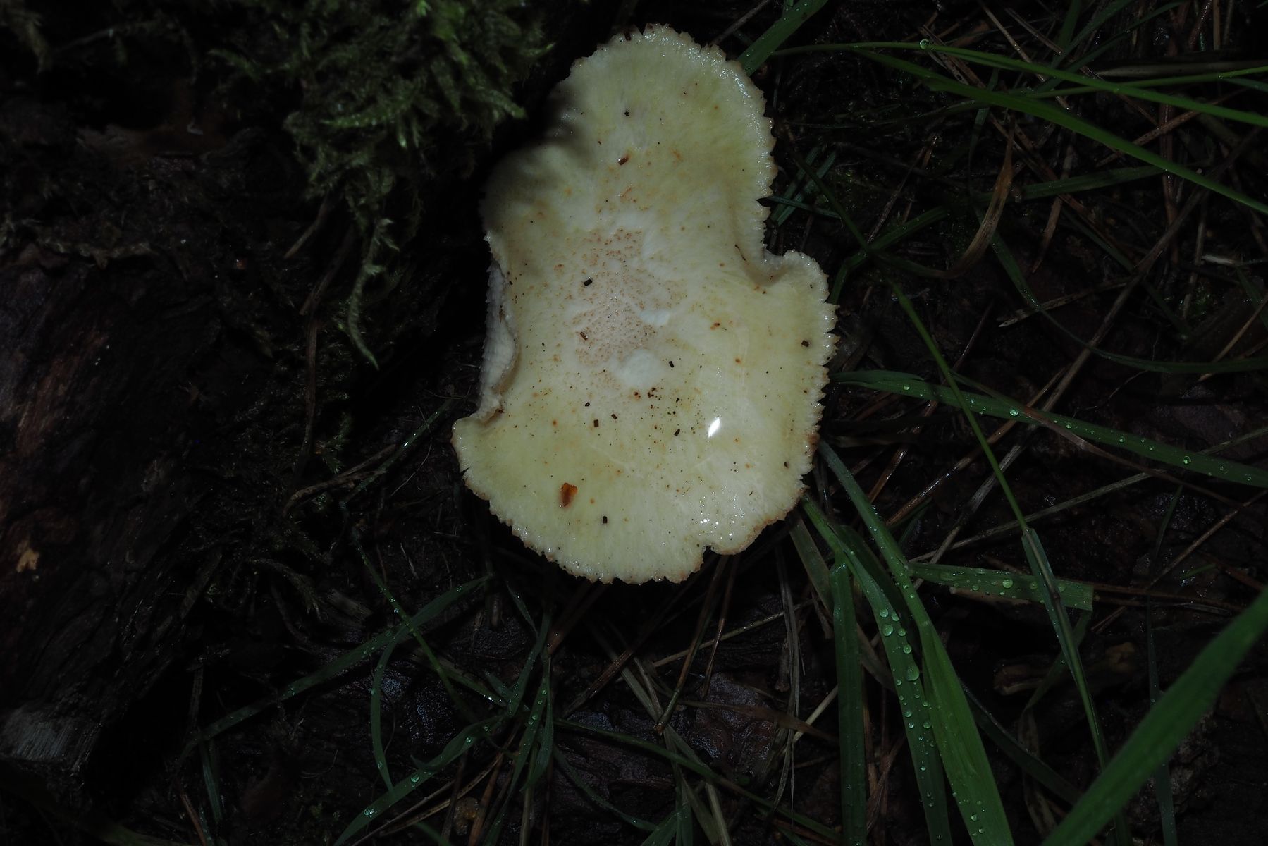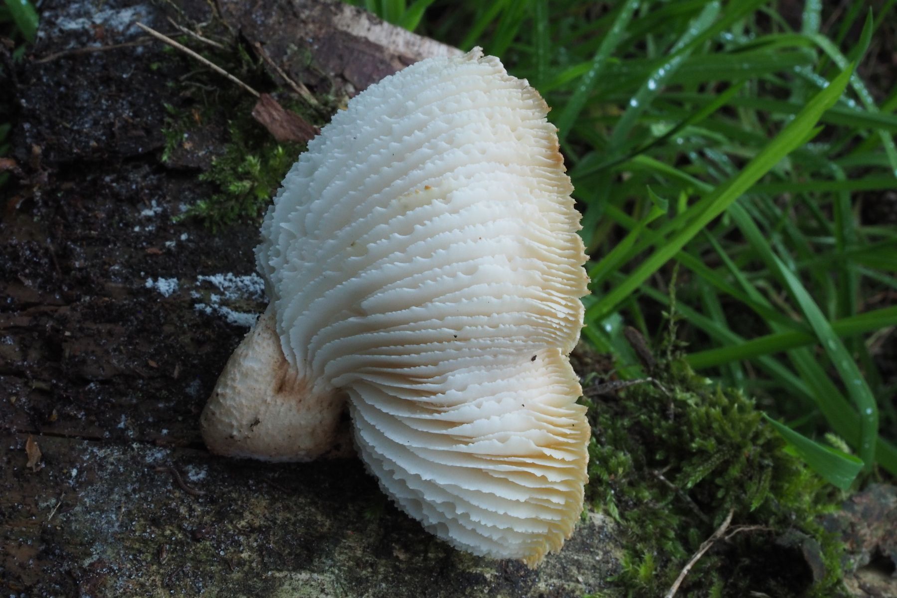 An einem feuerholzkurzen Stück Kiefernstamm ein überwiegend weißer Pilz mit auffällig stark gesägten Lamellen.