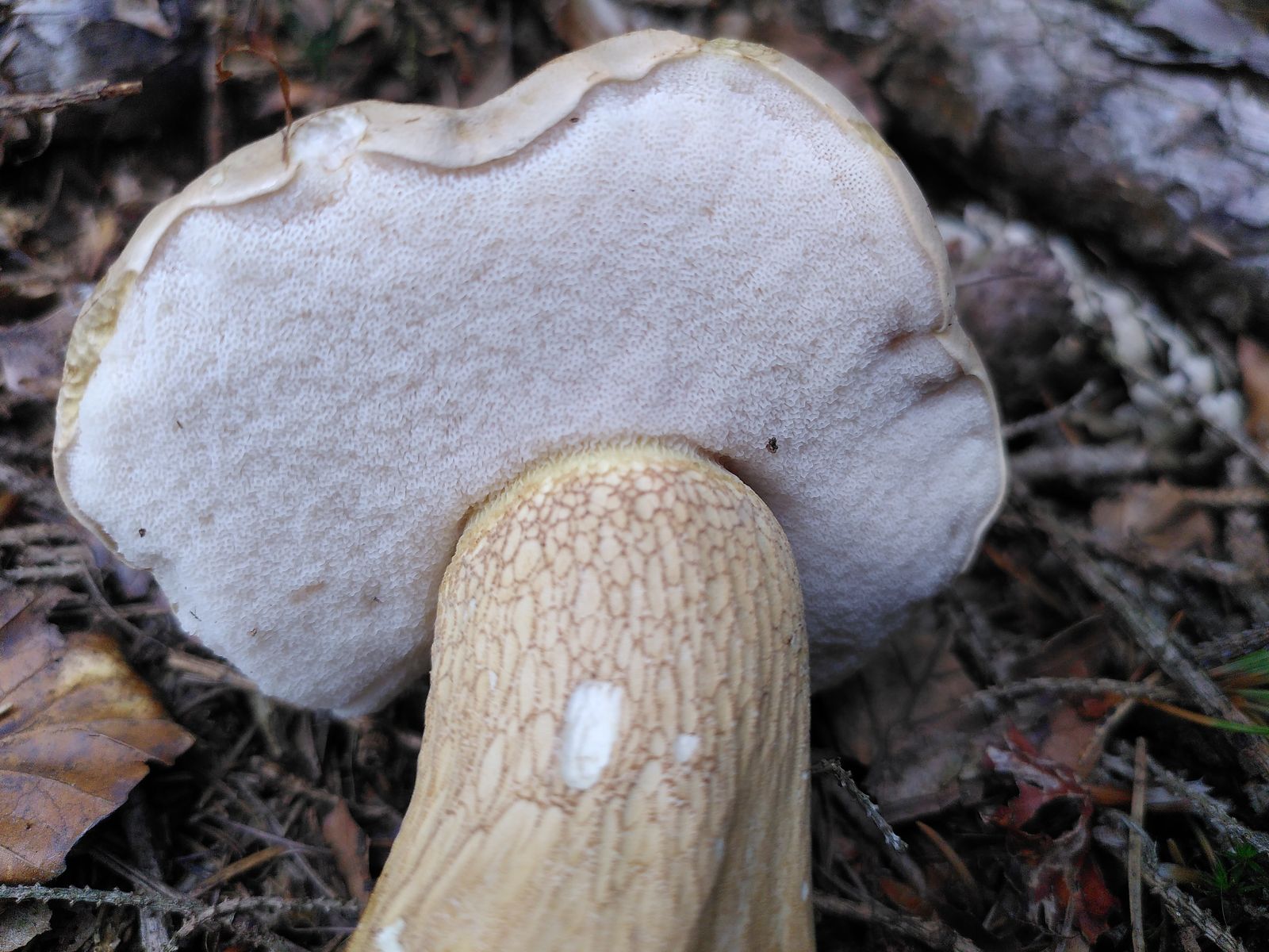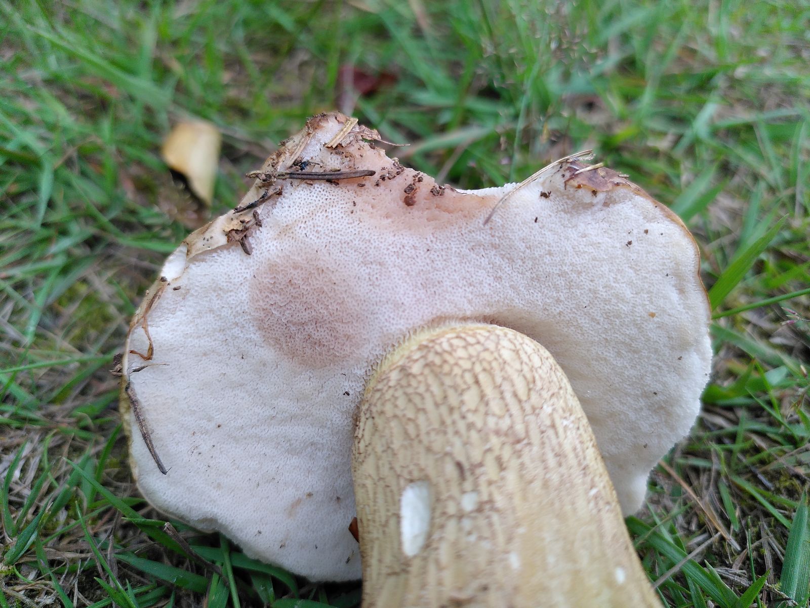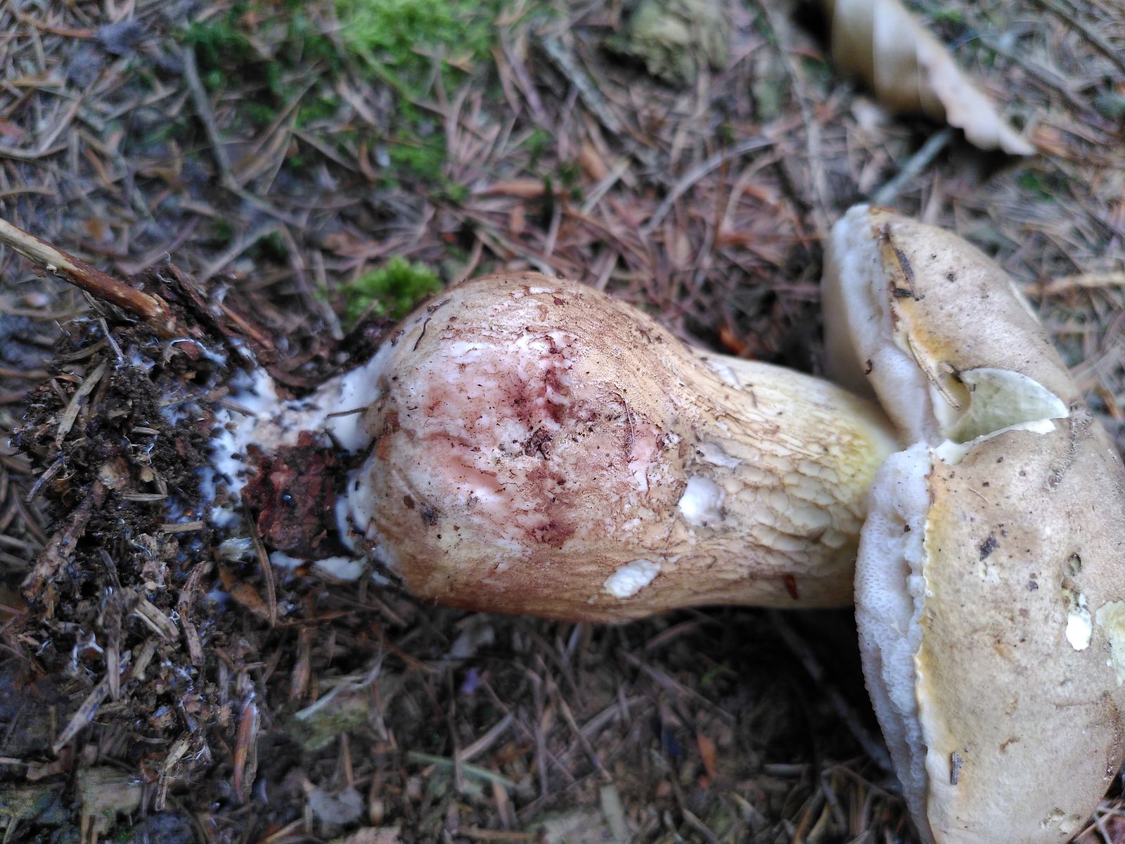 Stiel: Äußerste Stielspitze gelb und feinmaschig weiß genetzt, darunter abrupt übergehend in eine hellbraune Grundfarbe mit grobmaschigem dunkleren Netz (beim Sommersteini werden die Maschen meiner Erfahrung nach allmählich nach unten gröber ohne abrupten Übergang), Stielbasis keulig verdickt und auf Druck rosabräunlich fleckend (ist das normal? Hab ich nirgends gelesen), Basismyzel weiß