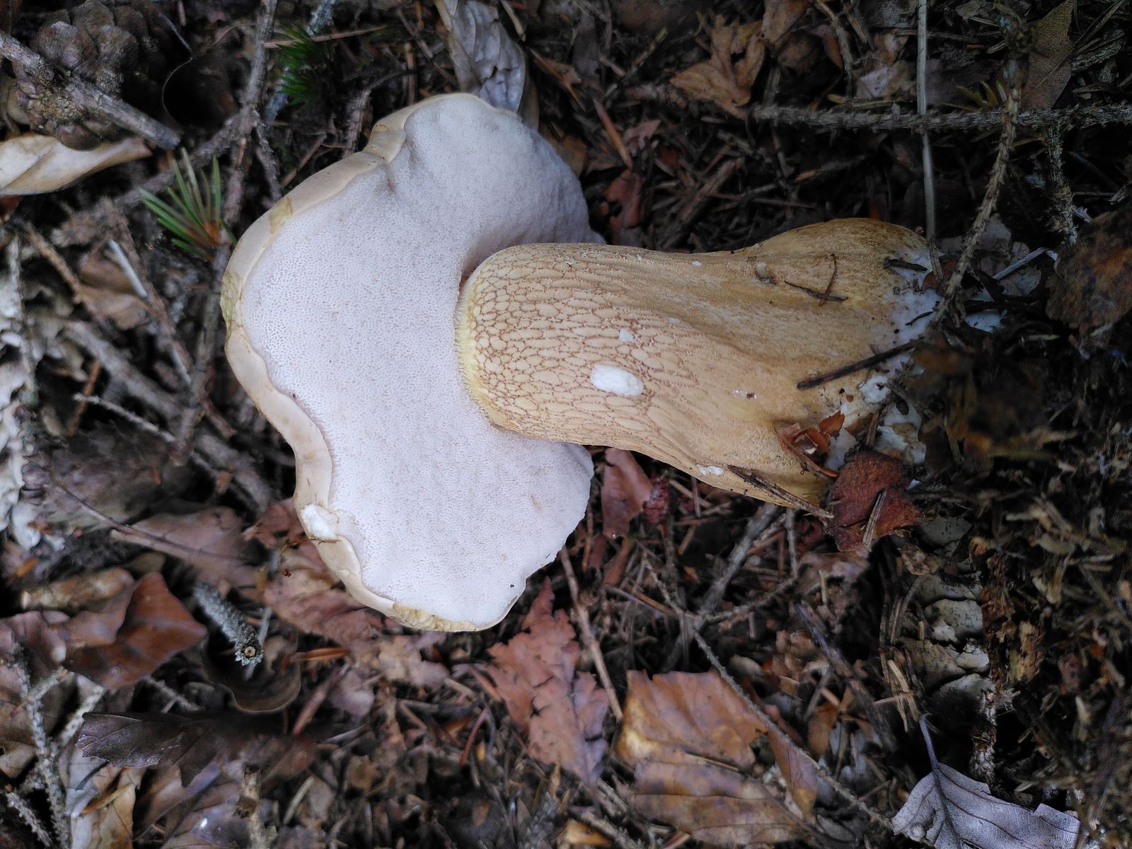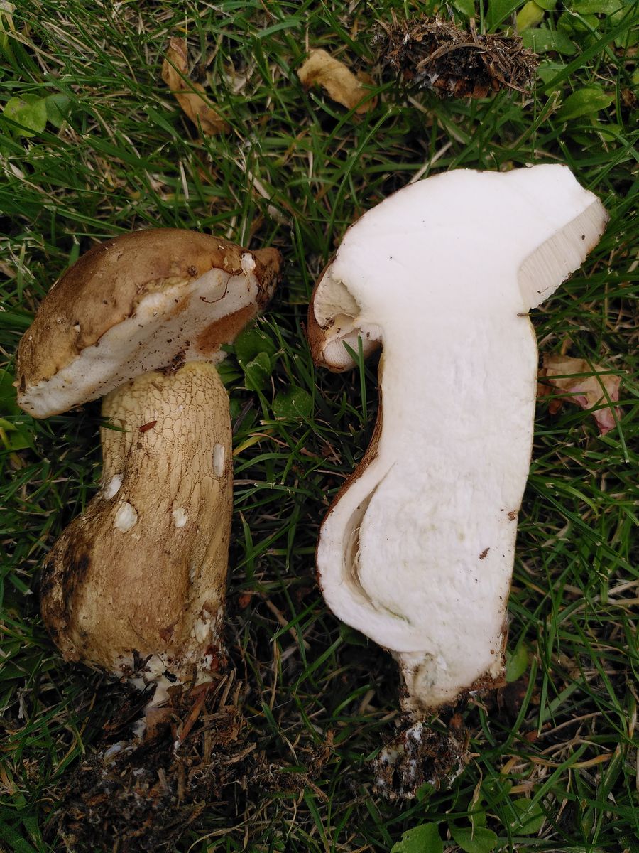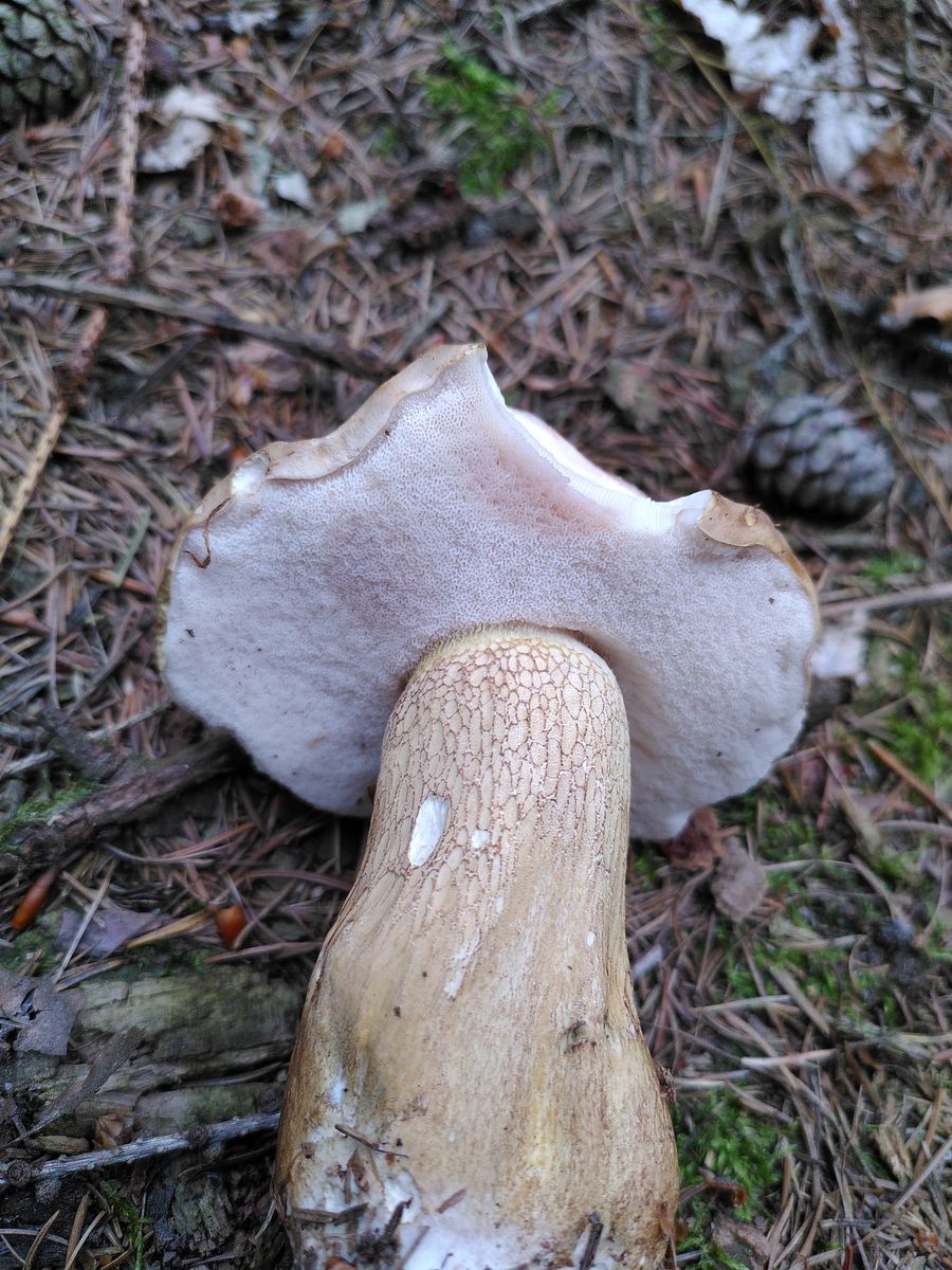 Stiel: Äußerste Stielspitze gelb und feinmaschig weiß genetzt, darunter abrupt übergehend in eine hellbraune Grundfarbe mit grobmaschigem dunkleren Netz (beim Sommersteini werden die Maschen meiner Erfahrung nach allmählich nach unten gröber ohne abrupten Übergang), Stielbasis keulig verdickt und auf Druck rosabräunlich fleckend (ist das normal? Hab ich nirgends gelesen), Basismyzel weiß