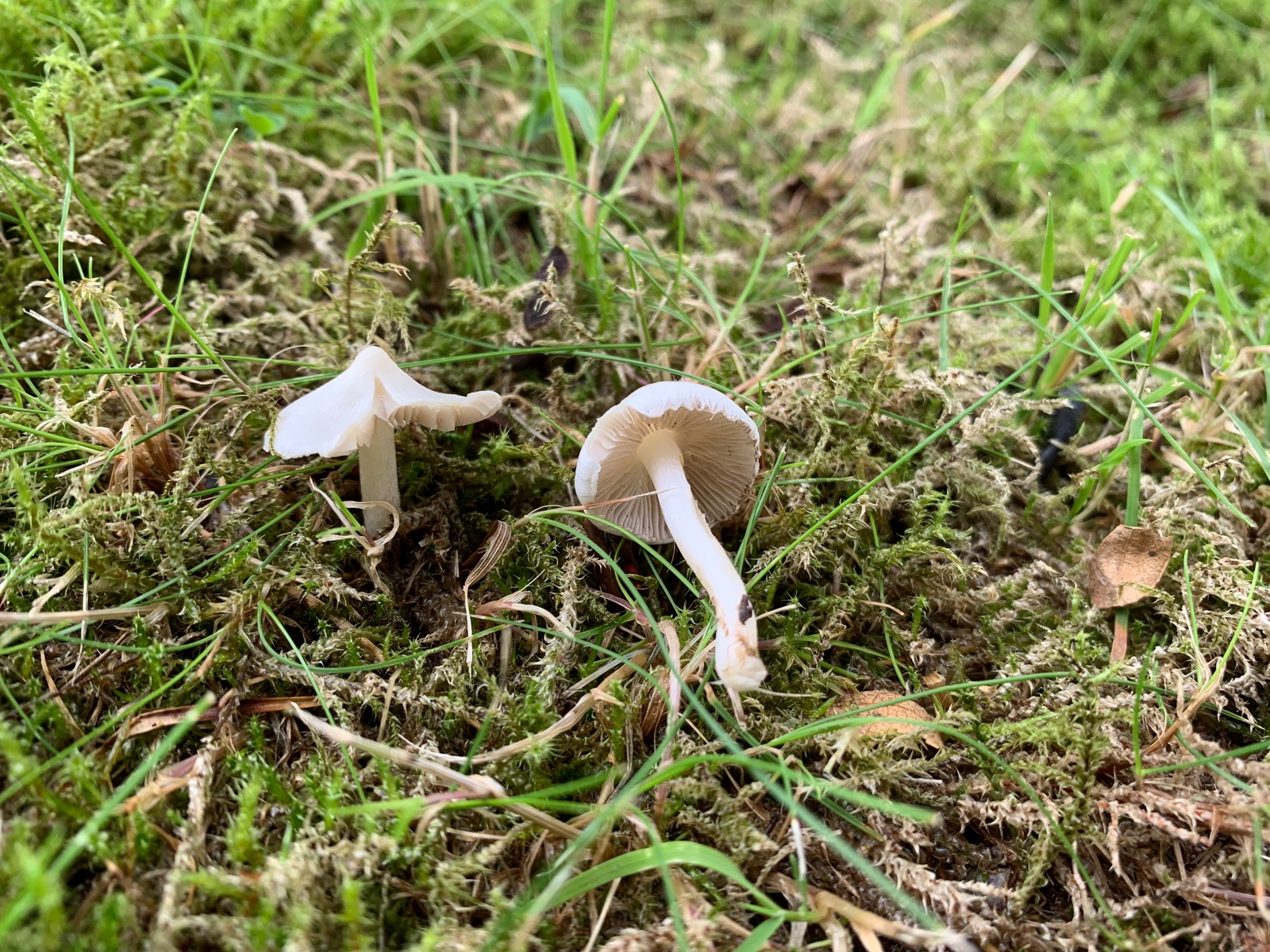 1. a) Hier wäre auch der Gegürtete Champignon Agaricus subperonata im Auge zu behalten. Ich glaube, auf Deinem Bild feine gelbbräunliche Schuppen zu erkennen – der Stadt-Champi ist allenfalls rau, hat aber keine Schuppen. Der Gegürtete kann im frühen Stadium, bevor er so richtig das Licht der Welt erblickt, noch sehr helle Schuppen haben, die später dunkel werden. Am Ring kann man die beiden Arten auch unterscheiden. Der Gegürtete ist dem Stadt-Champignon in vielem ähnlich: schiebt sich genauso massiv aus dem Gras heraus, kompakt – schwer = hohe Dichte, schnell vermadet, leicht rötend, gleiches Habitat.