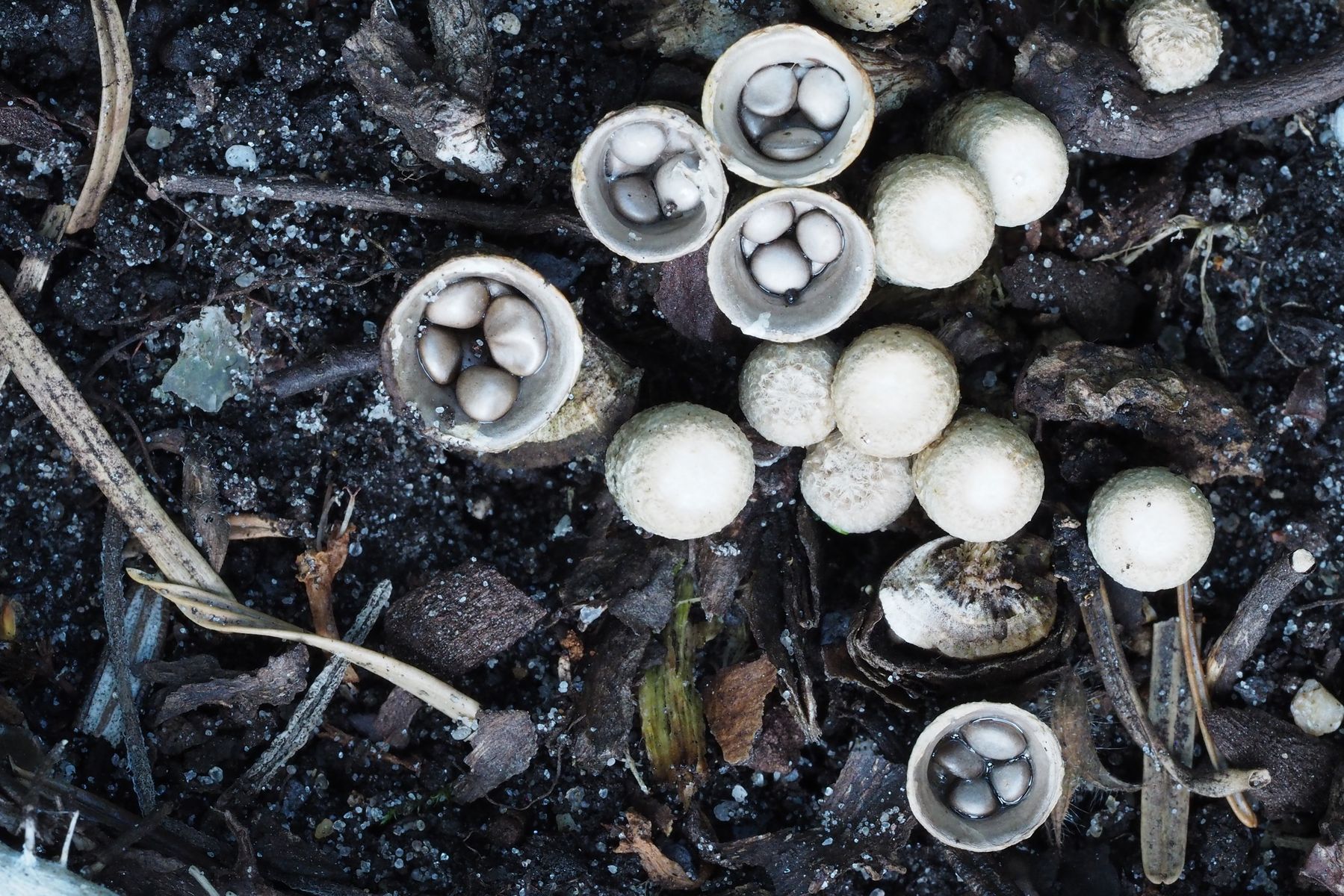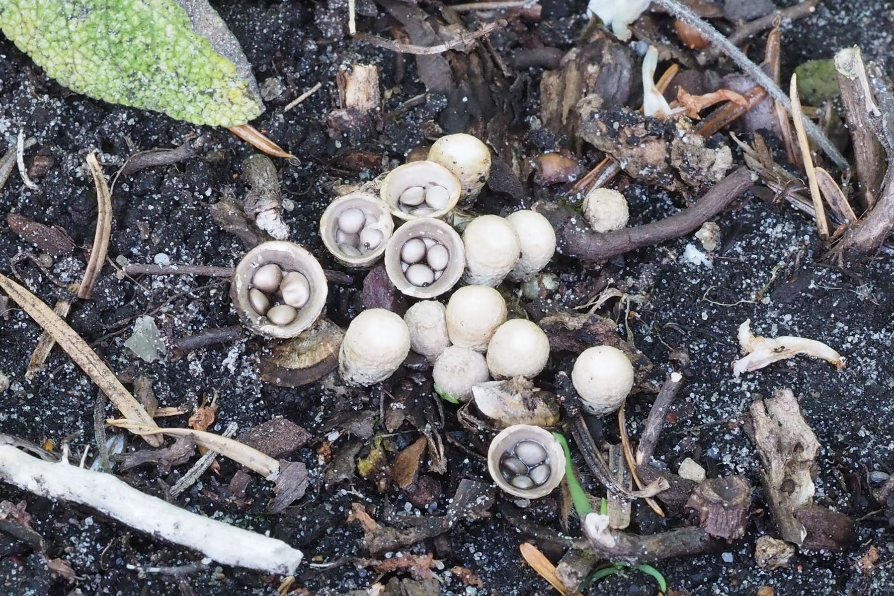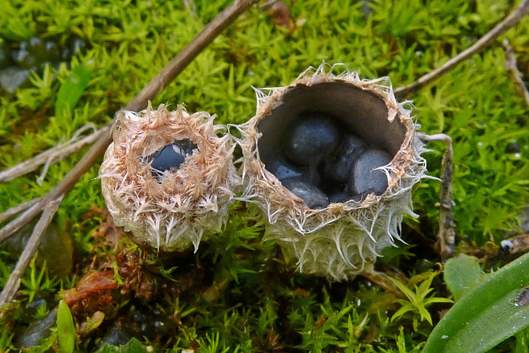 Cyathus stercoreus hat nahezu schwarze Peridiolen und ist jung auffallend struppig, wie im folgenden zu sehen.