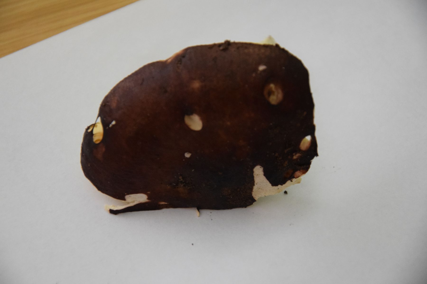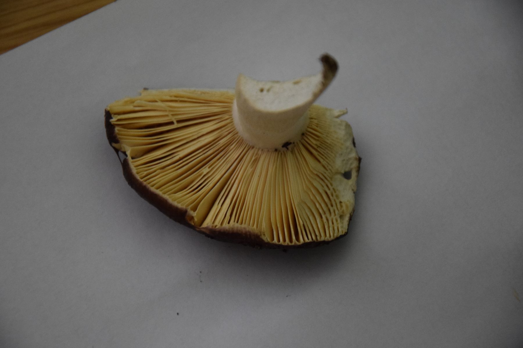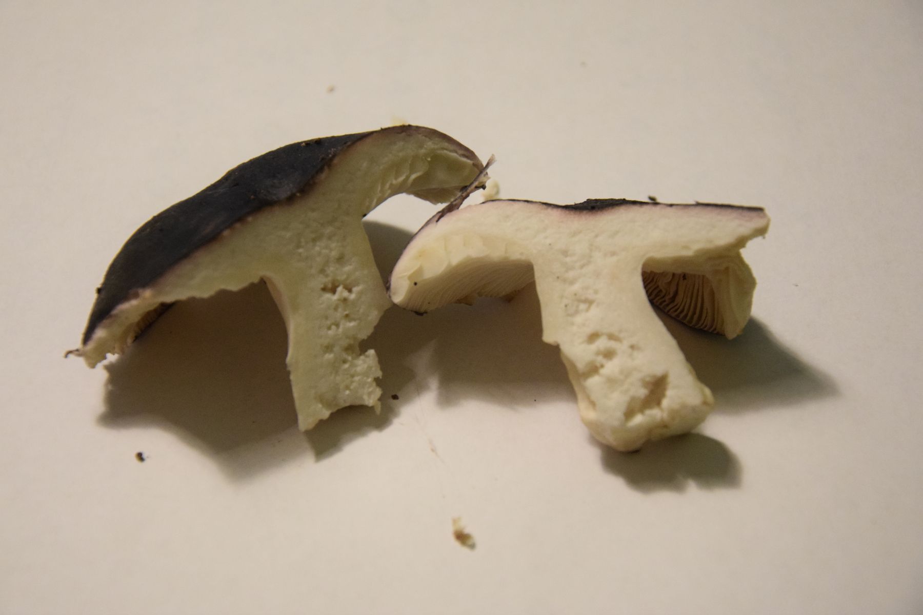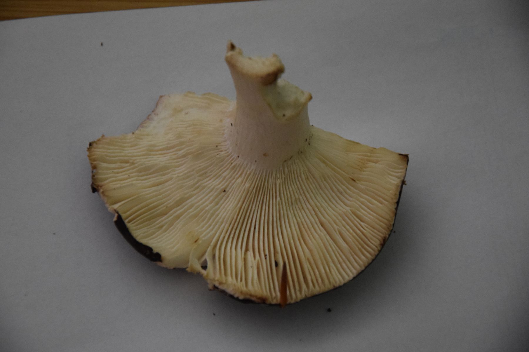 Zum ersten Pilz: Die Lamellen sind crèmefarben, der Stiel wächst wie eine Keule, die sich nach oben hin verjüngt, wird möglicherweise noch hohler als dieses Exemplar. Der Hut ist jung ziemlich braun und glänzend, weist anonsten keine Besonderheit auf, wächst also nicht spitz oder kugelig, franst aber im Alter aus das ist aber wohl bei allen Täublingen der Fall.