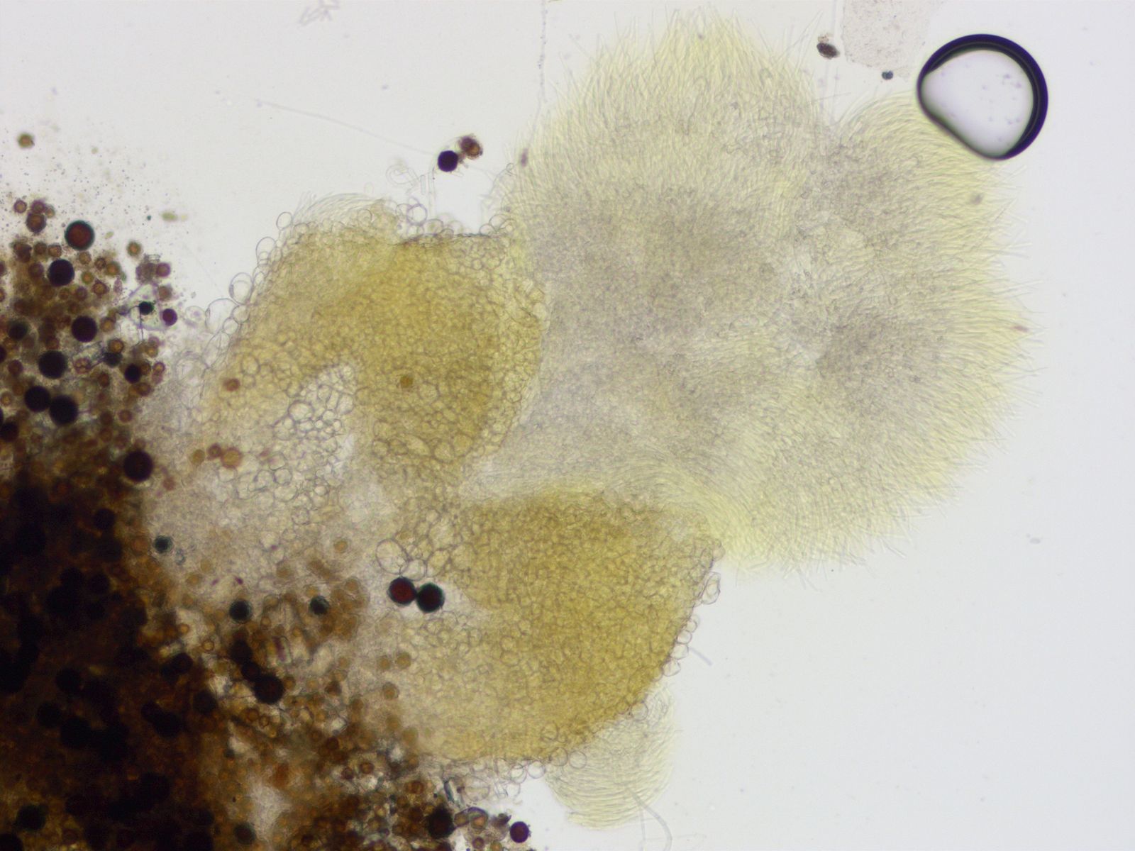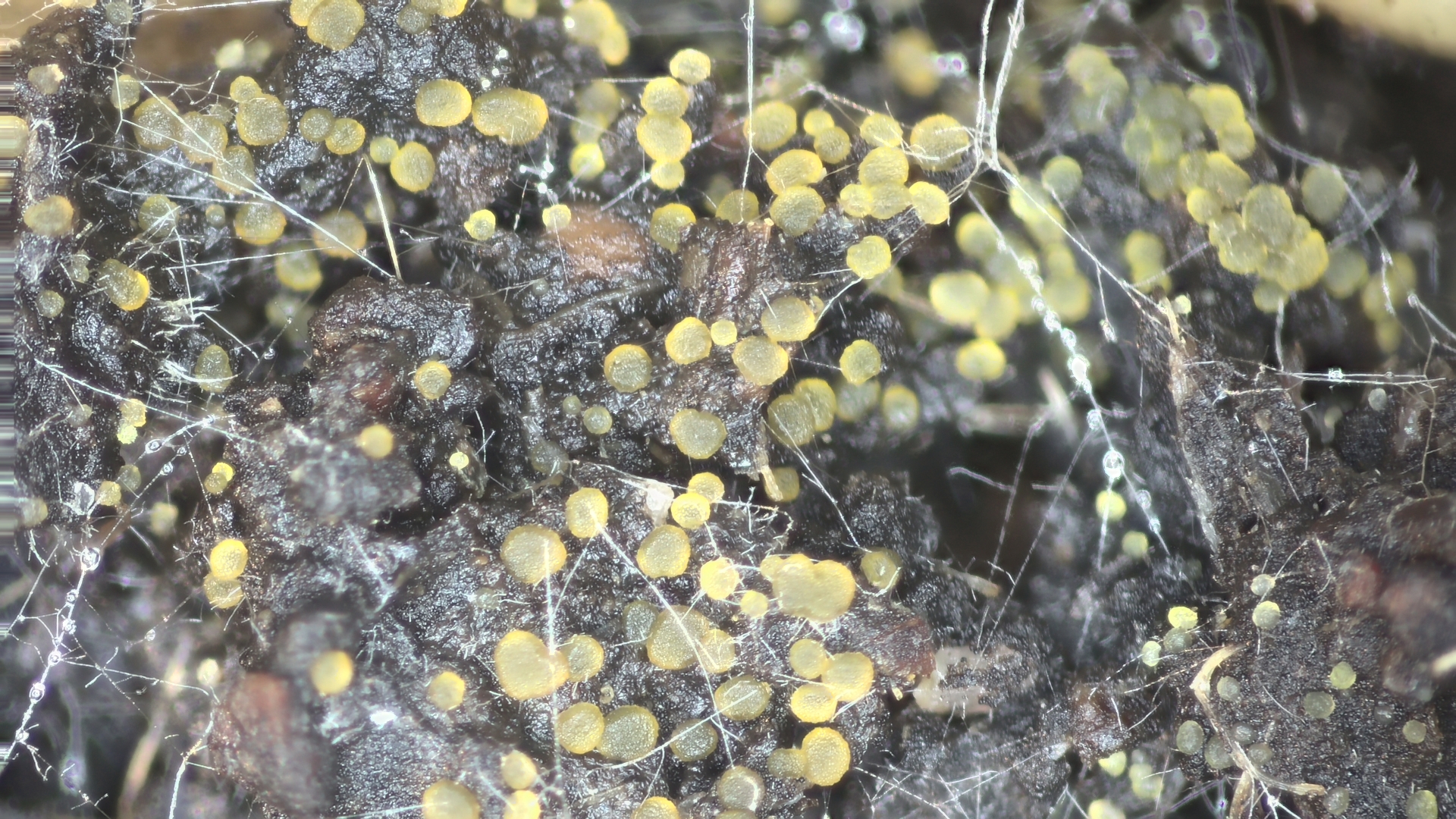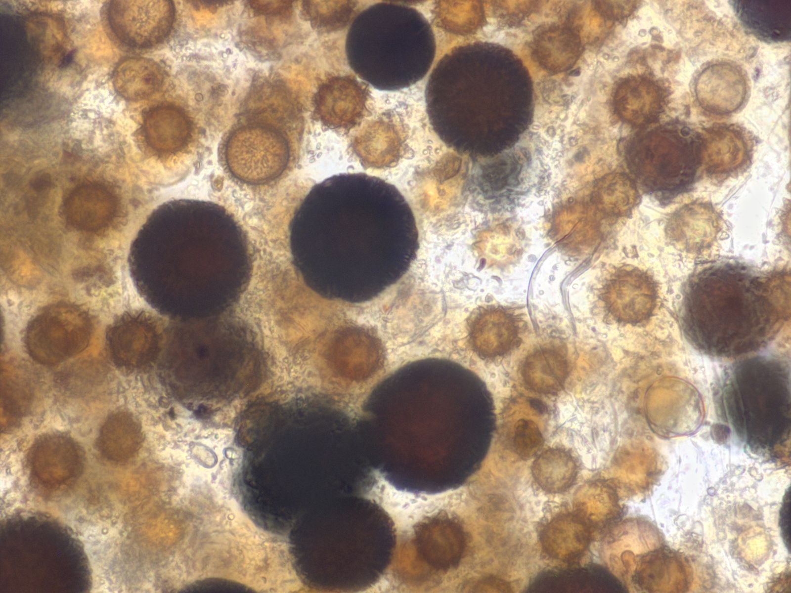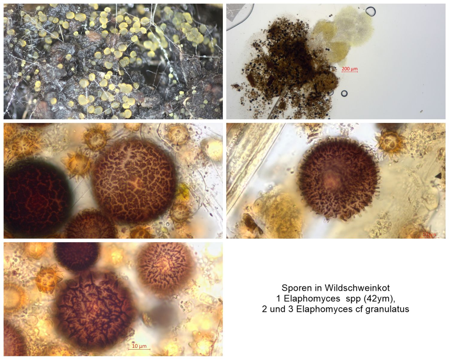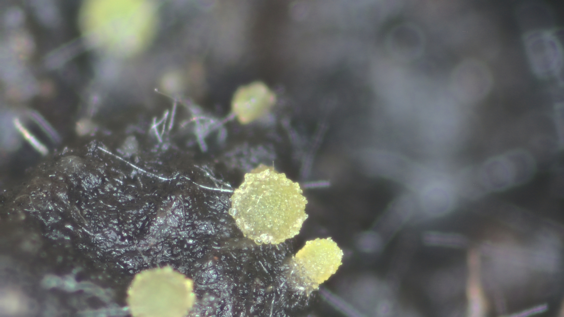 Auf Wildschweinkot, den ich seit etwa einem Monat in einer Kunststoffdose aufbewahre sind Ascoboli (crenulatus?) gewachsen. Interessant ist auch was darunter im anhängenden "Kot" im Mikroskop zu beobachten ist.