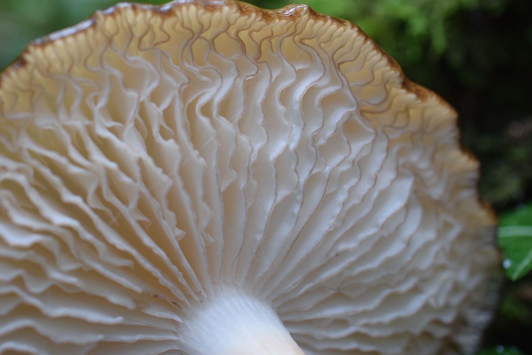 2) Hut 18 cm, trocken; Lamellen weiß, am Rand eingedellt; halb mit „Zahn“ angewachsen;