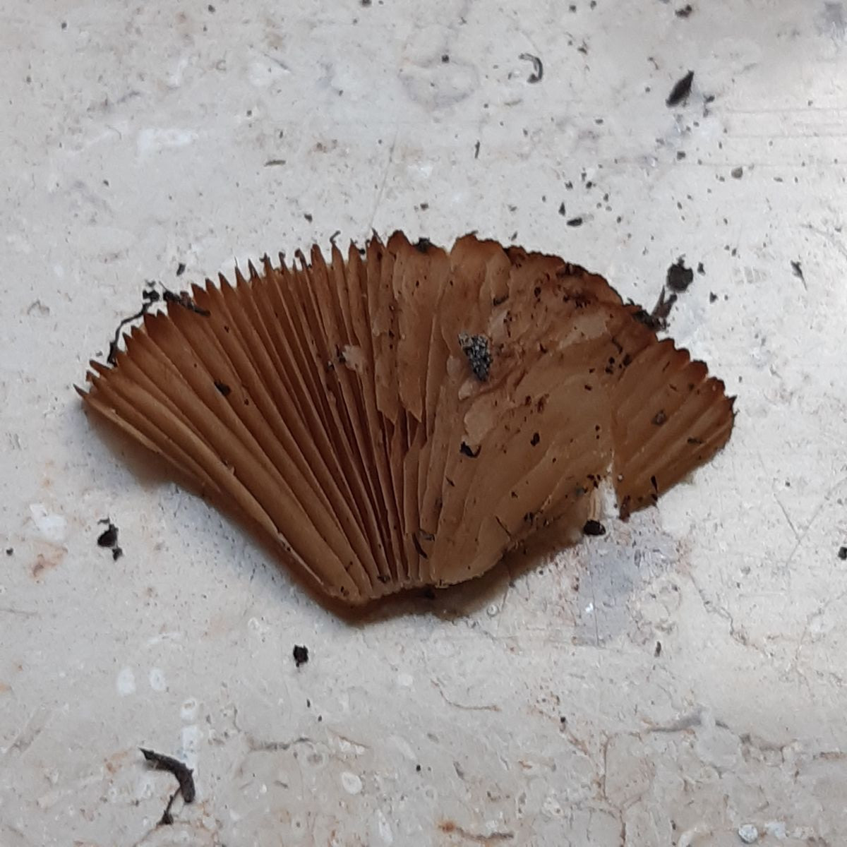 leider ist der Pilz beim Herausnehmen aus dem Blumentopf gebrochen. Hier ist das Foto der Lamellen.