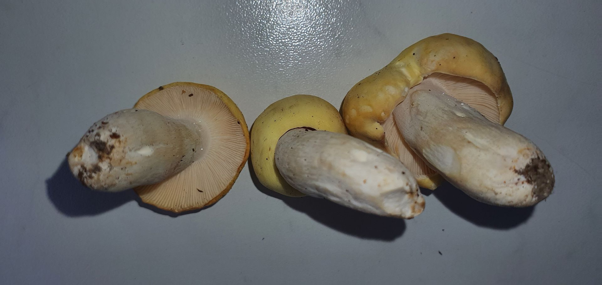 1. Vermutung R. violeipes. Einen der größeren habe ich vor Ort komplett auseinander genommen und zweimal probiert, komplett mild. Geruch recht speziell, kann es nichts wirklich zuordnen, habe so etwas nie zuvor gerochen. Huthaut leicht abziehbar, fühlte sich wie ganz dünnes Gummi an, die Huthaut, wenn sie dran ist fühlte sich an der Oberfläche wachsartig an. Lamellen brüchig. Stiel bei dem einen großen(kein Foto), wie auch bei kleineren innen wattig hohl. Der größere, wie auch ein weiterer komplett madiger am Hutrand ins violette gehend und am Stiel ebenfalls violette Töne, bei den kleineren (noch?) nicht. Wäre ein Erstfund für mich.