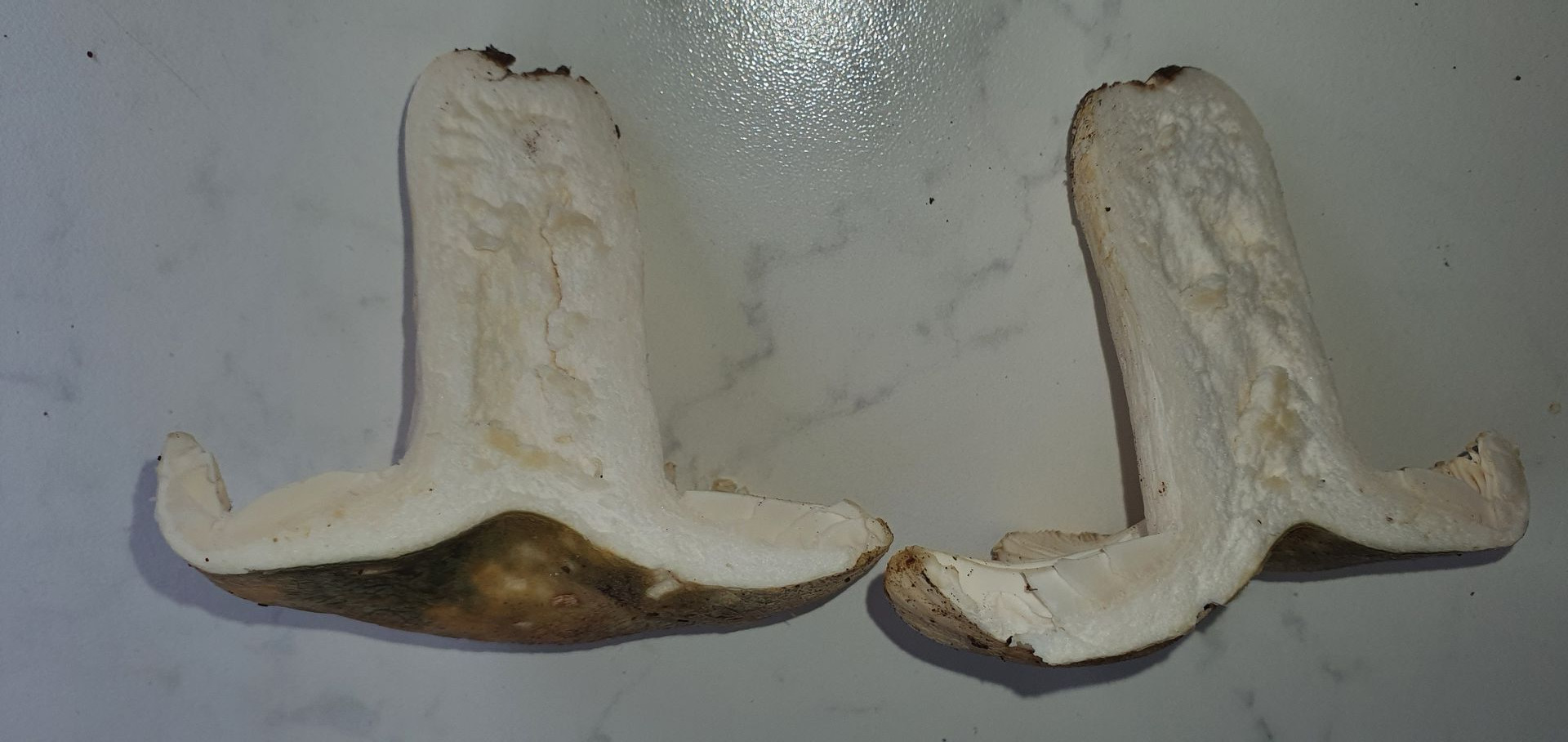 12. Der wuchs unter einer dünnen Baumwurzel raus, die in der Hutmitte wie eine Kerbe verursachte. Der FK hatte einen unglaublich dicken Stiel, habe ihn nur zur Hälfte heil raus bekommen, der Rest ist zerbrochen.