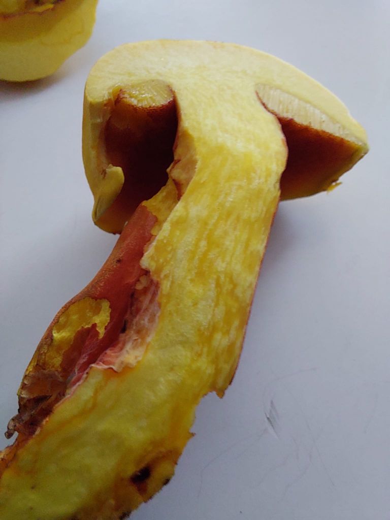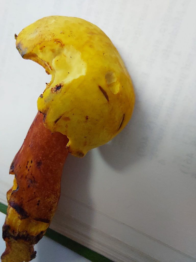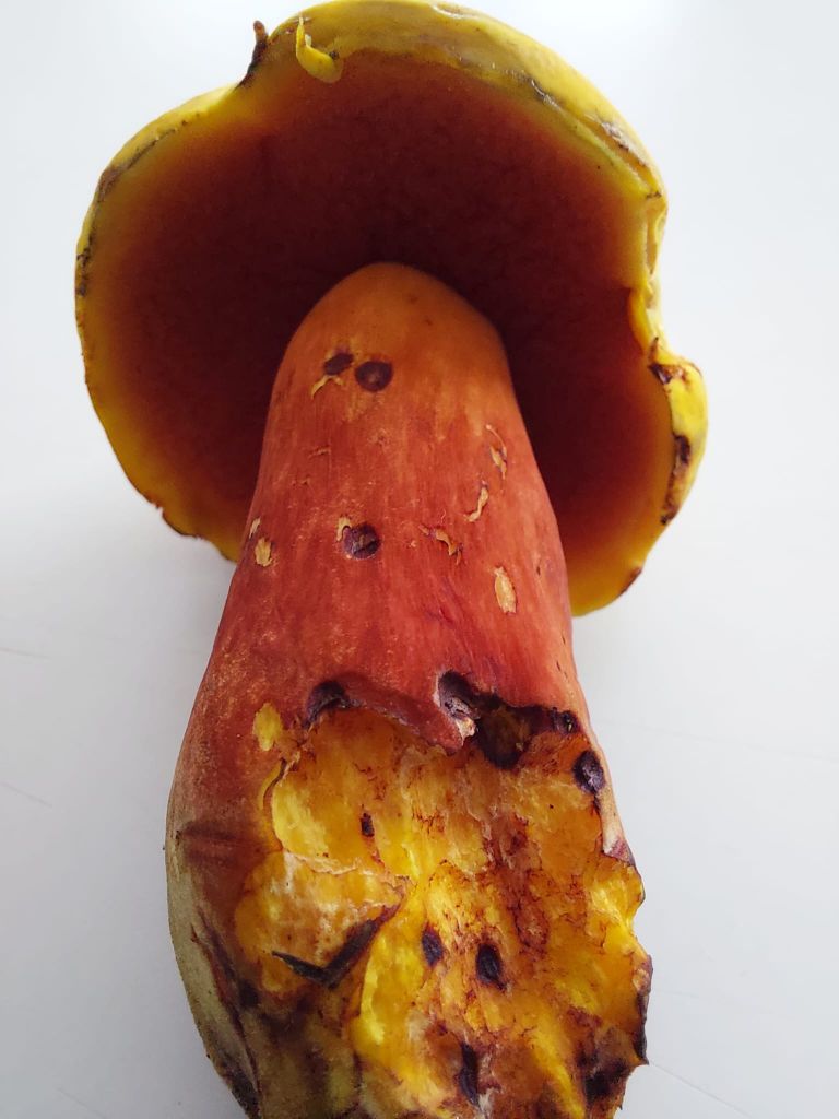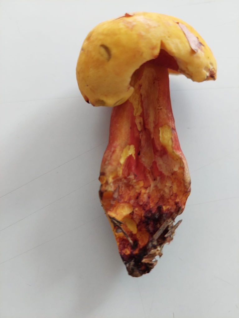Hallo, diese Pilzbilder eines rotporigen Röhrlings mit gelbem Hut und Fleisch habe ich zur Bestimmung zugestellt bekommen. Der Stiel und die Röhrenmündungen gleichen einem Flockenstieligen Hexenröhrling, das Fleisch blaut aber im Schnitt nicht.
