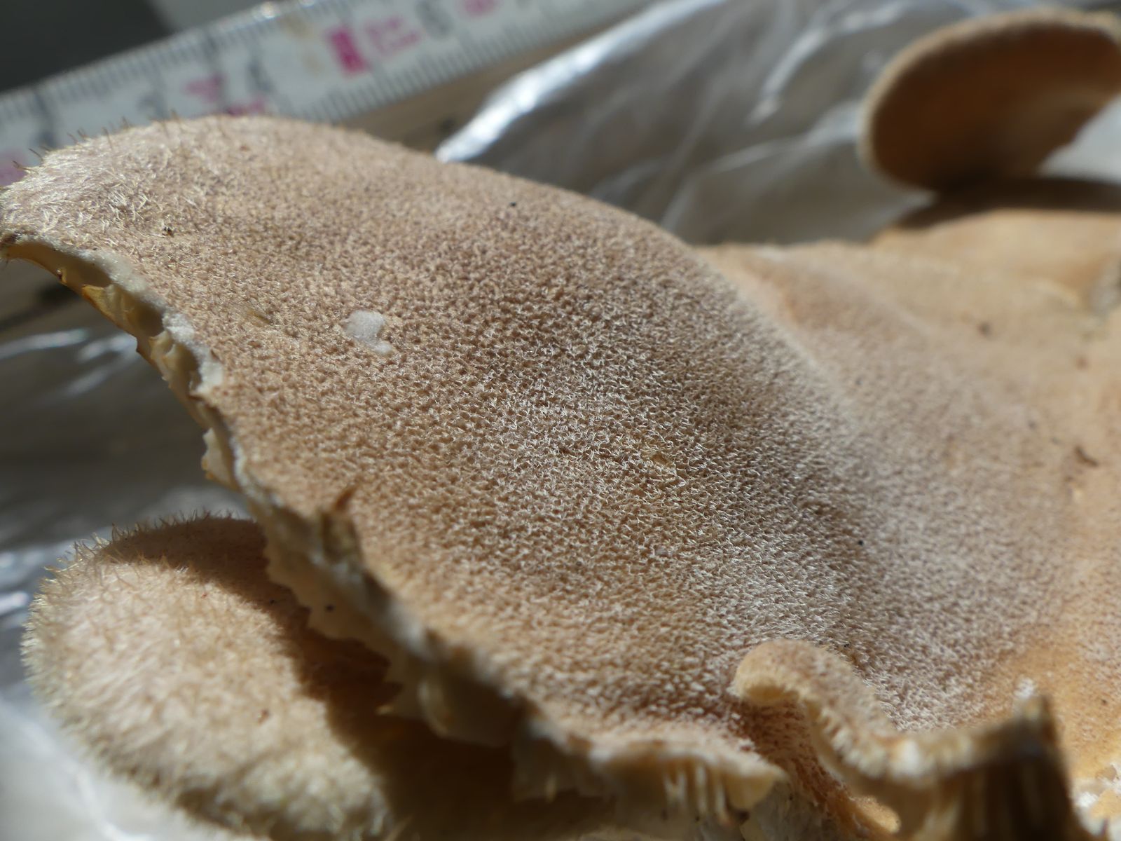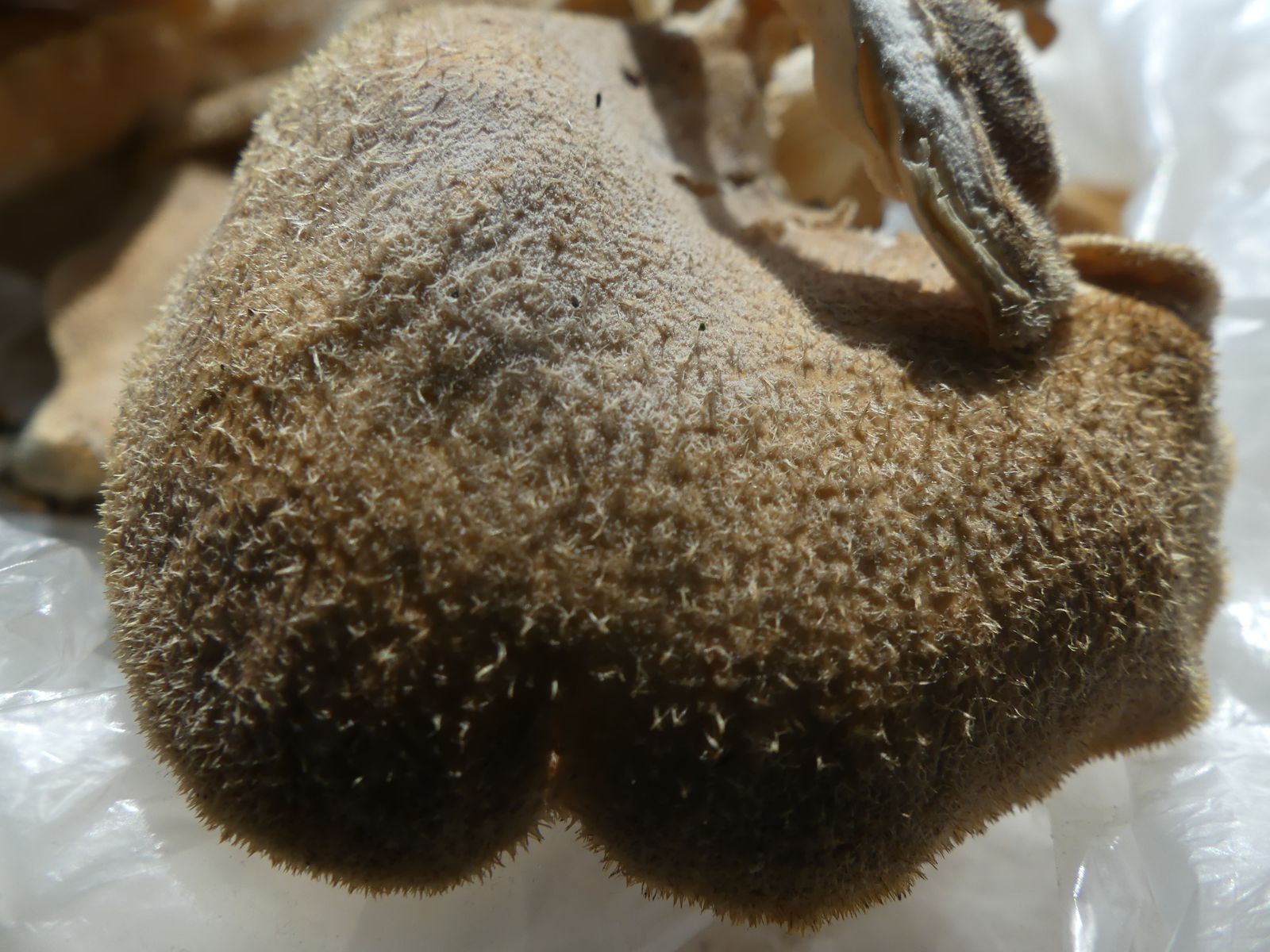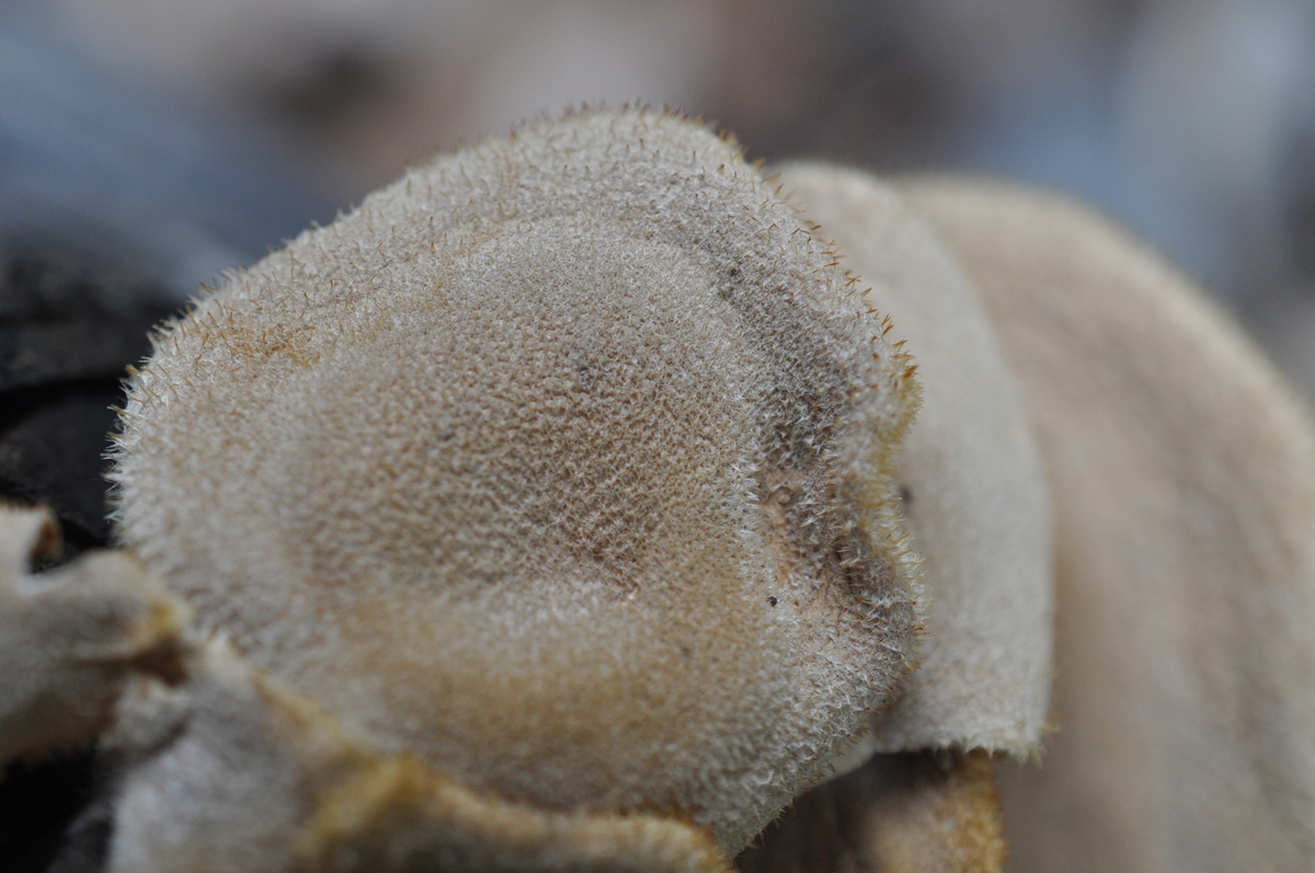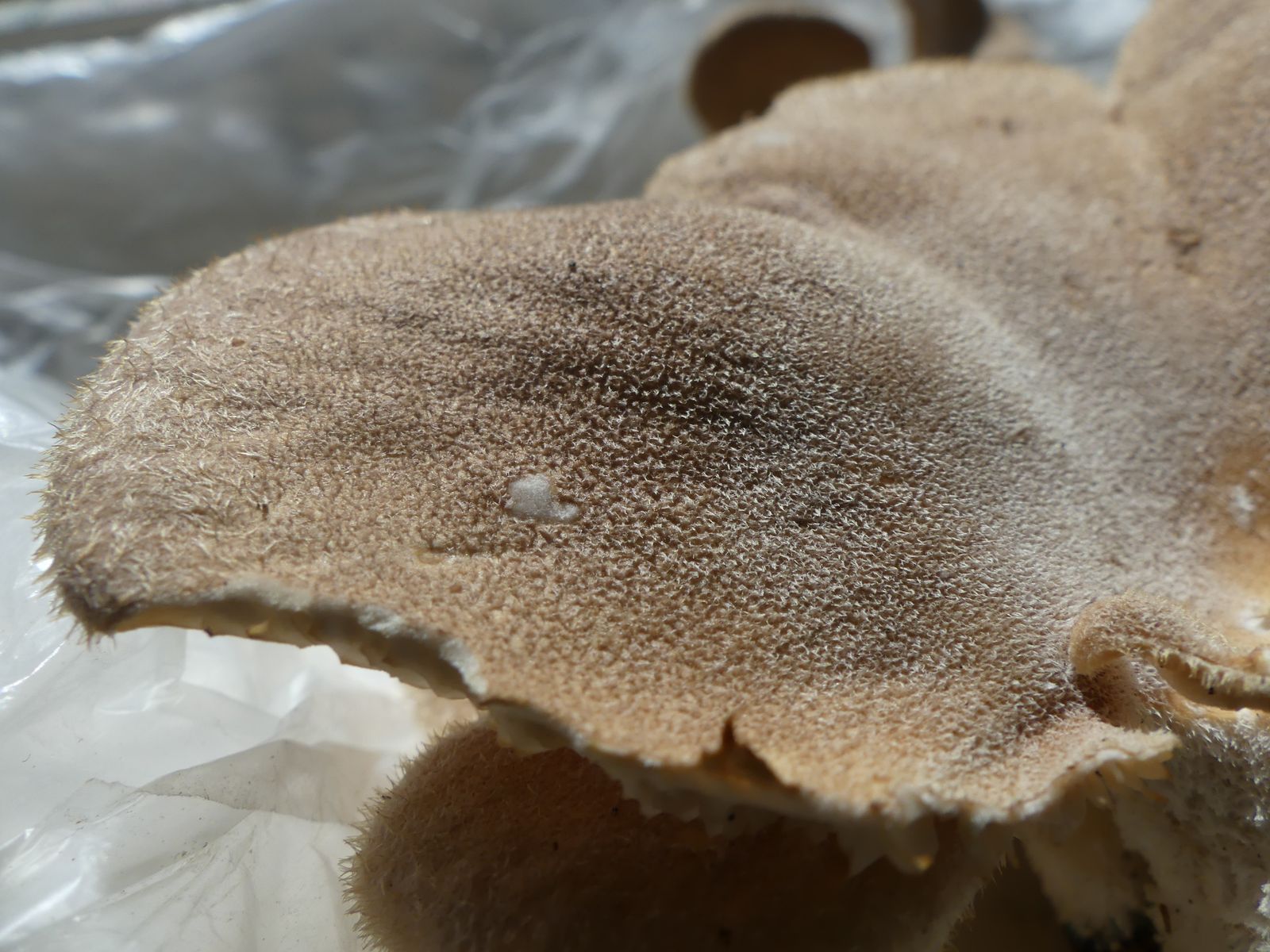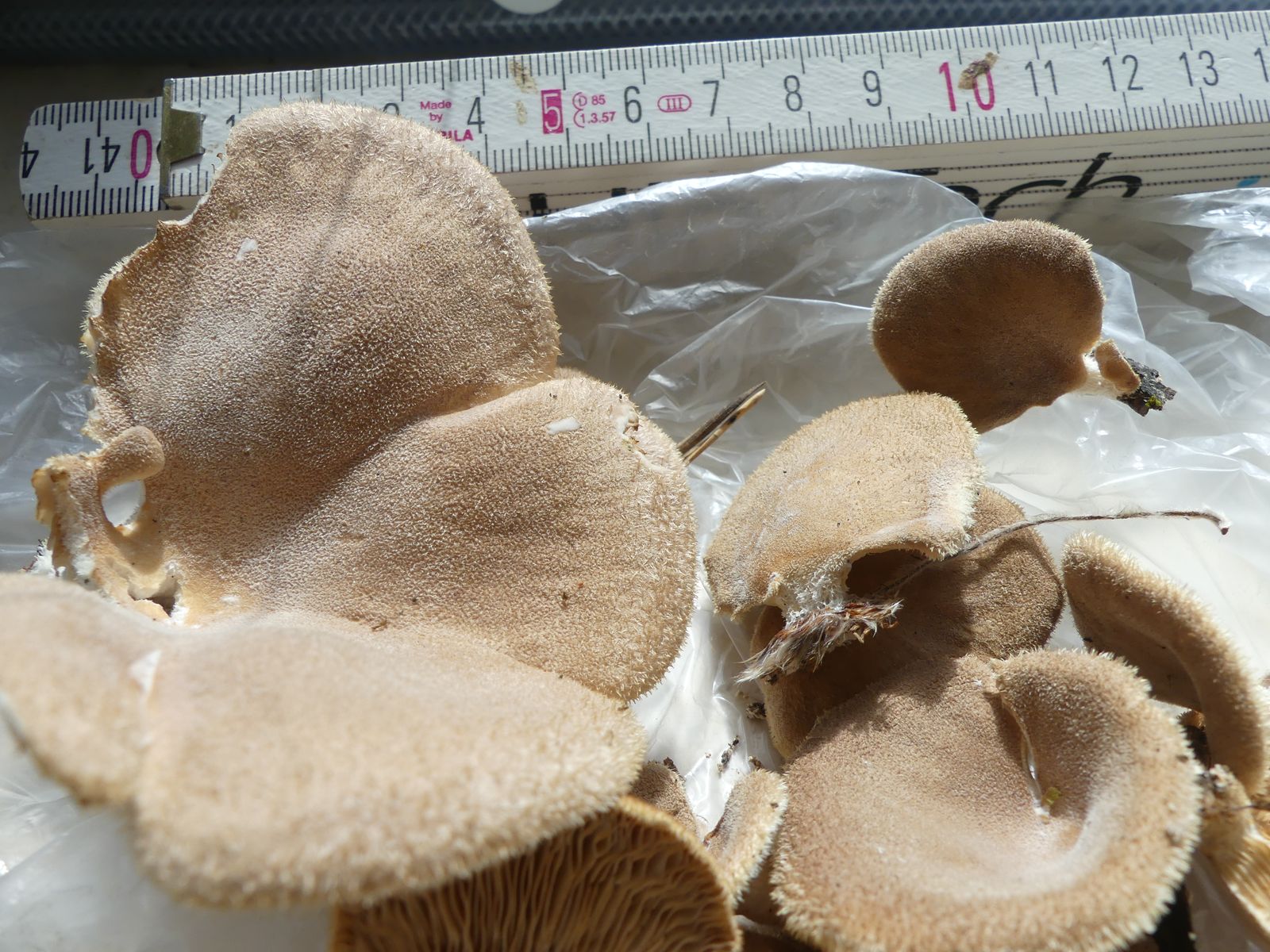 Heute habe ich diese Exemplare an einem dicken Buchenstamm gefunden, der schon ein paar Jahre im Wald liegt. Es waren einige Dutzend Fruchtkörper, die meisten nur wenige cm groß und augenscheinlich angetrocknet, da kam der Regen wohl etwas zu spät.
