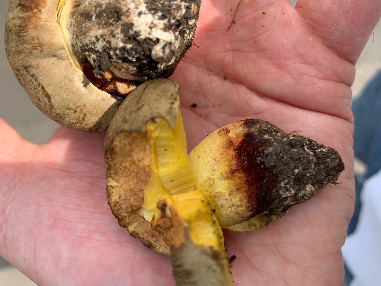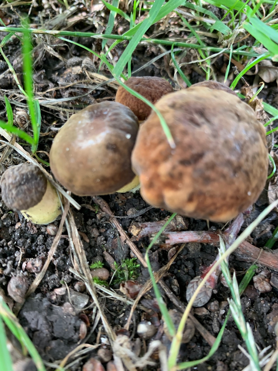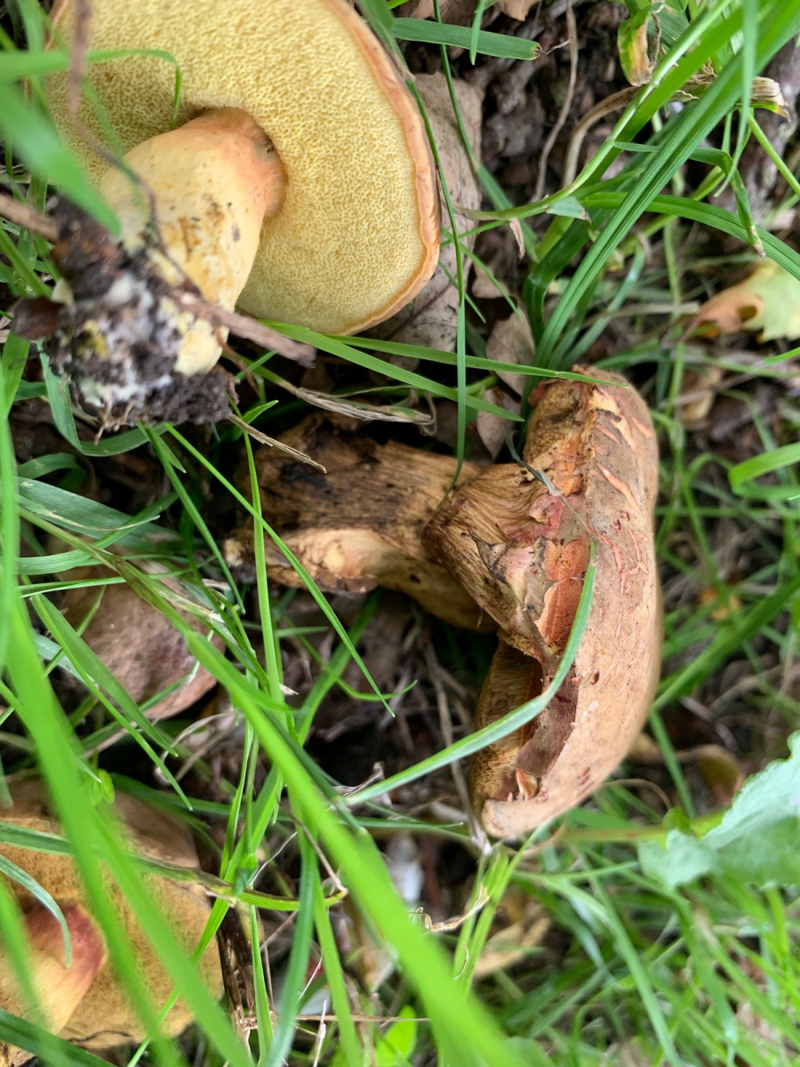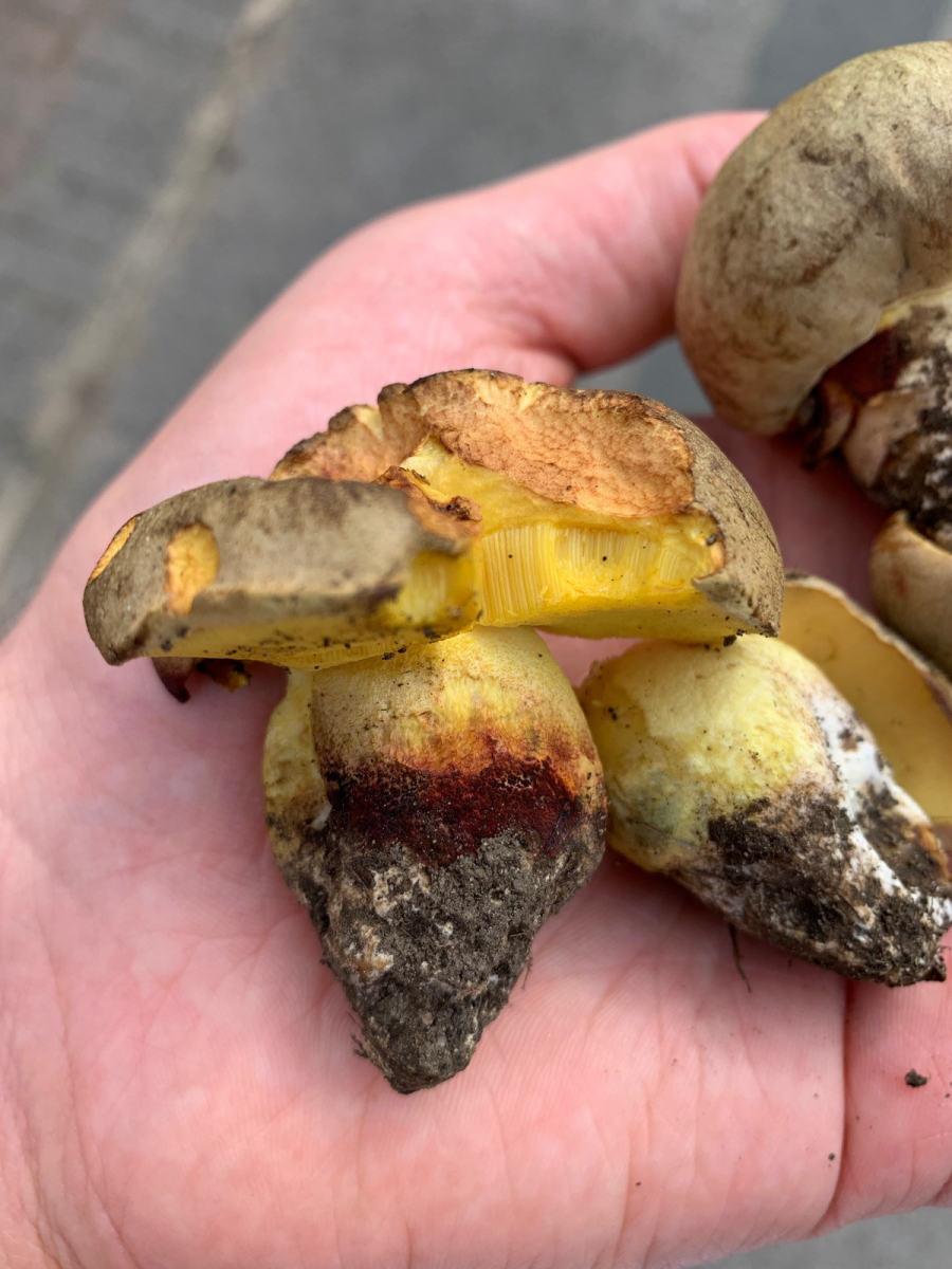 Wollte mir hier mal einen Röhrlingsfund bestätigen lassen, der zwar vielleicht für Süddeutschland, aber keinesfalls für Nordengland trivial ist. Fundort in Vollsonne neben einer großen Alleeeiche, dort drückten sich bestimmt 15 graue Knubbel aus der Erde. Dachte da natürlich sofort an Wubi, aber die Farbe passte nicht ganz und ein durchgeschnittenes Exemplar blaute nicht und hatte kein Netz. Geruch meines Empfindens nach sehr nah am Karboli in der Stielbasis. Das sollte doch der Fahle Röhrling sein, der gilt in England und erst recht im Norden als ziemlich selten. Einer färbte außen am Stiel blaugrün, das habe ich auf äußere Einflüsse geschoben.