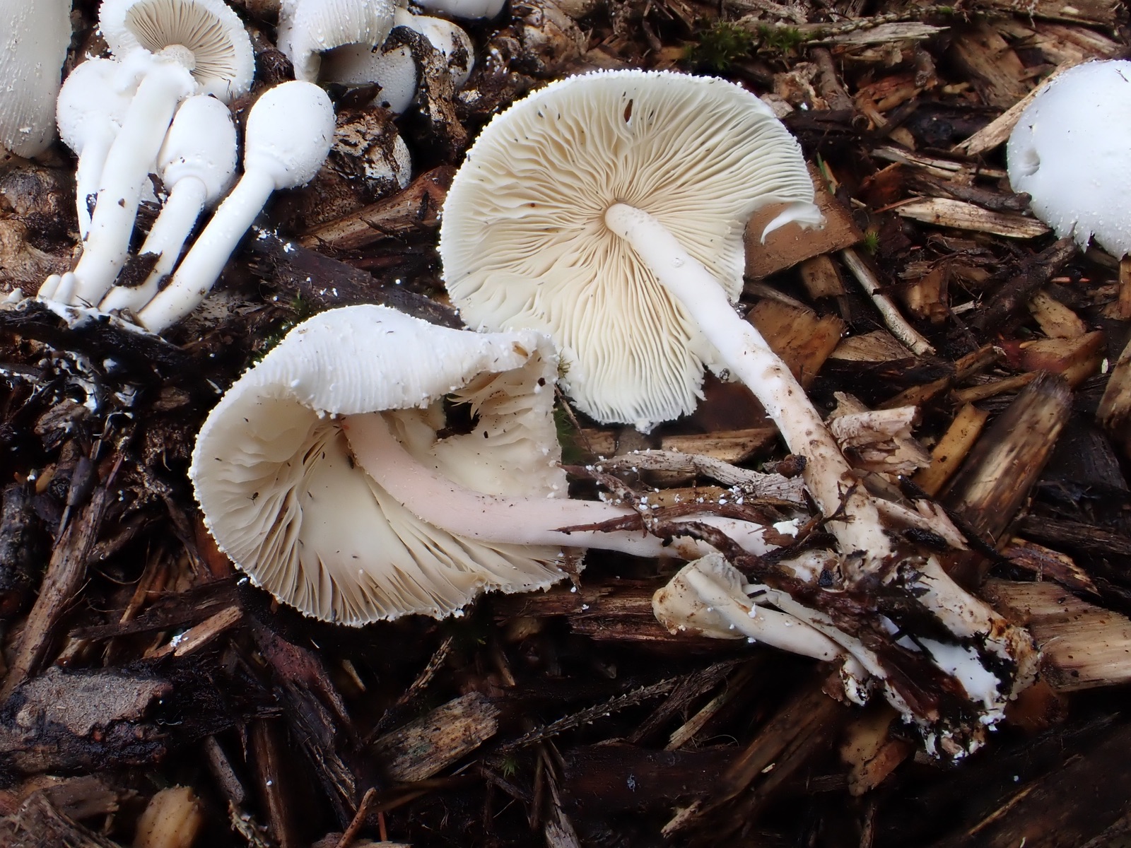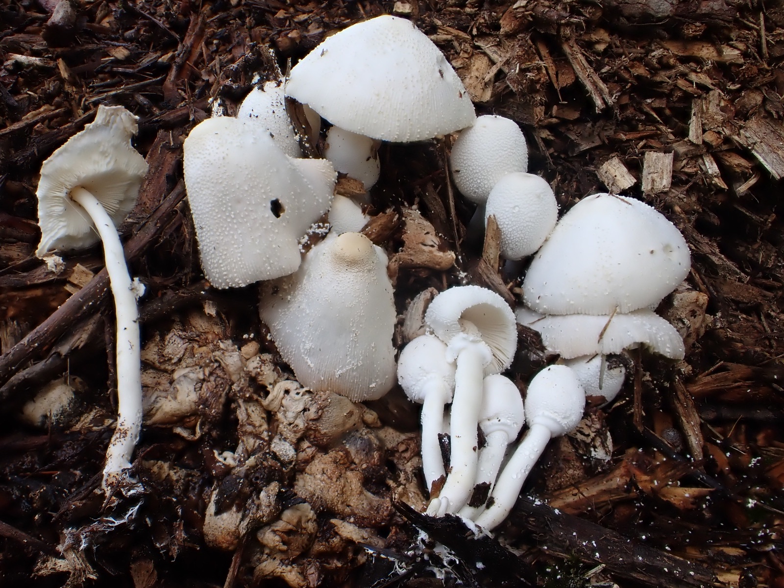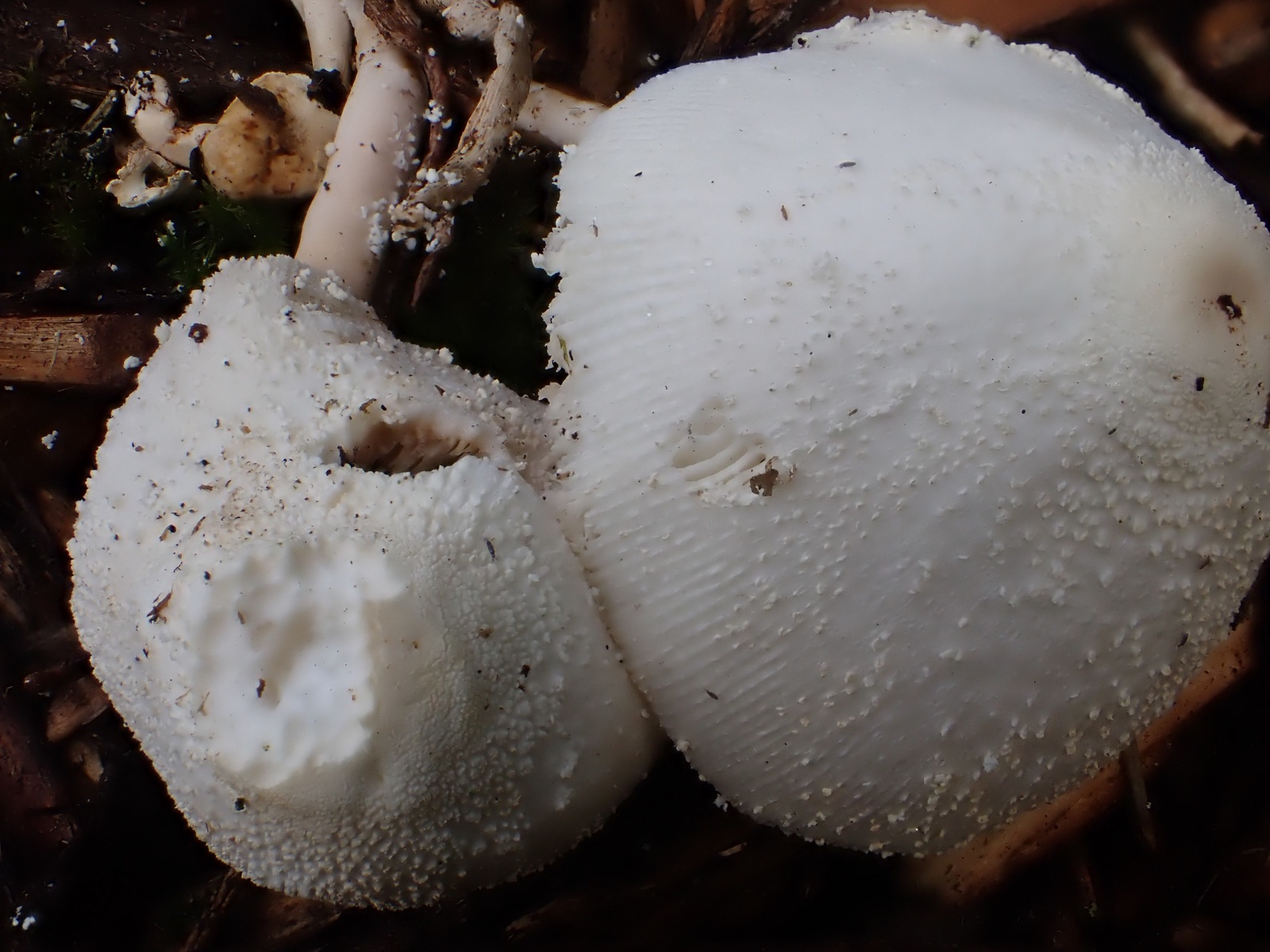 gestern auf einem Hachschnitzelhaufen. Rein weiß, fein bemehlt, Geruch leicht unangenehm schirmlingsartig. Insgesamt recht fragil. In der engeren Wahl: L. cretatus/cretaceus und L. cepistipes. Ersterer hat deutlich kräftigere Beflockung, zu letzterem passt zwar die Beflockung, aber zwiebelfüßig ist er nicht wirklich.