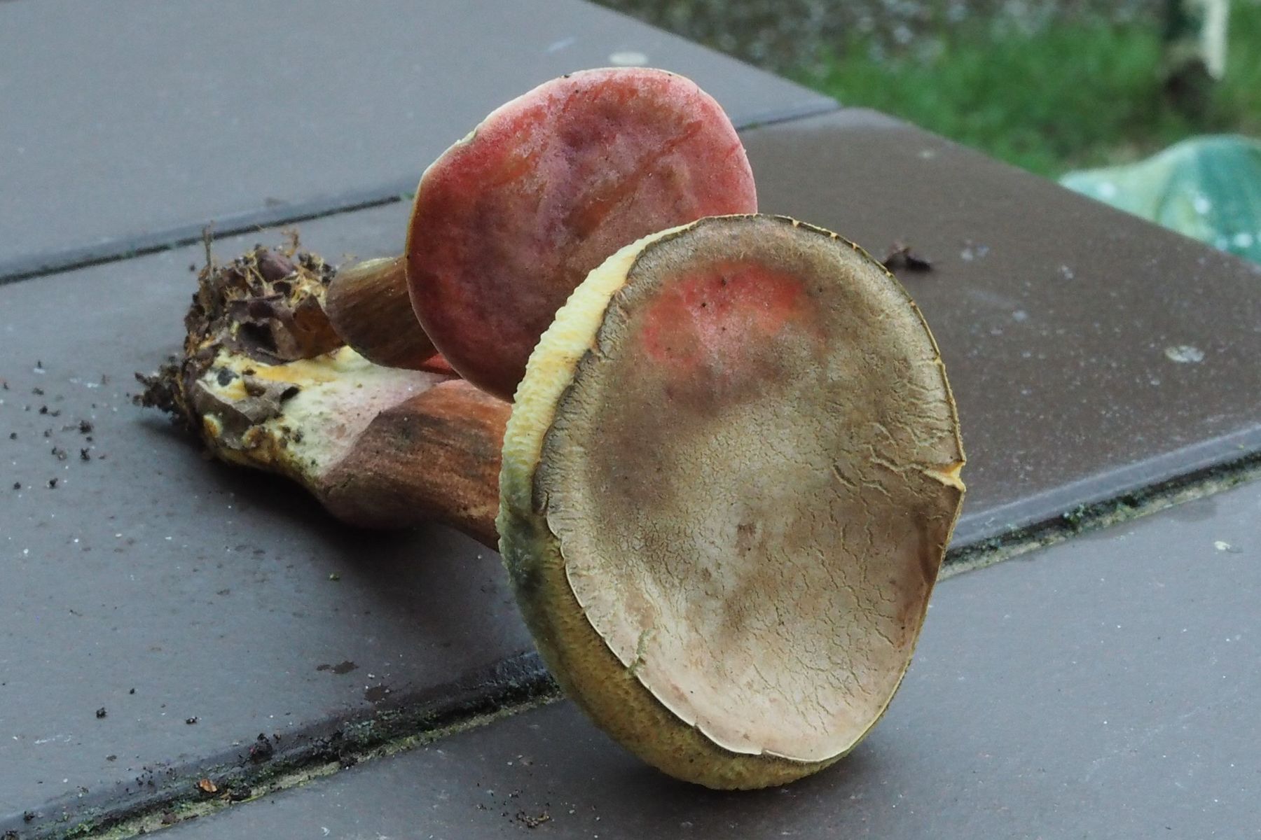 A: Am 20. Juli im Garten meiner Tochter auf Rasen in der Nähe von Birke und Eiche. Hut trocken und samtig. Röhren angewachsen, leicht herablaufend und gelb, Hutfleisch hellgelblich, Stielbasis gelblich, sonst gelblich rotbräunlich überhaucht, Stielfleisch gelblich bis hellgelblich. Weder auf Druck noch Schnitt blauend.