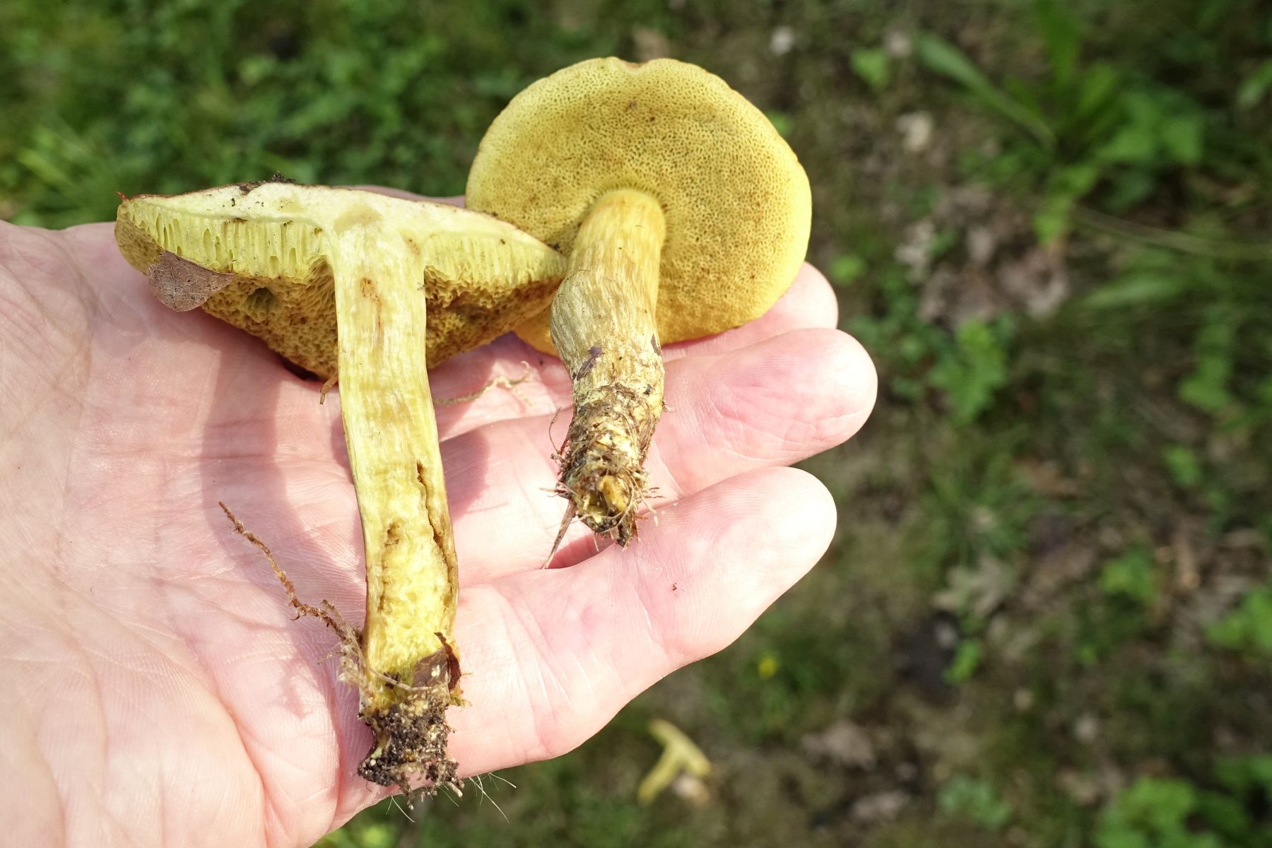 Am 29. Juli auf einem Spielplatz im Gras unter Eichen gefunden. Hut trocken, braun samtig mit gelben Röhren, frei stehend. Stiel gelb, bräunlich überhaucht. Weder auf Druck noch im Schnitt blauend.