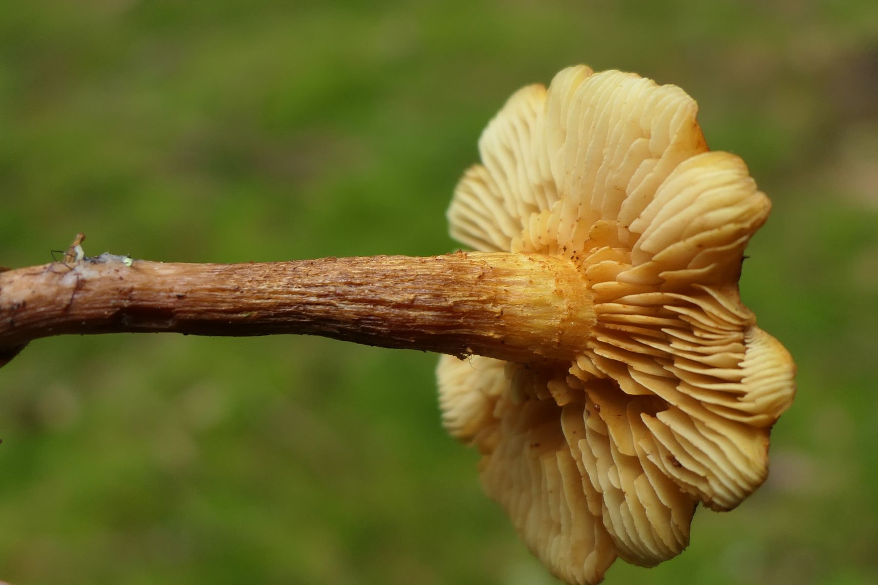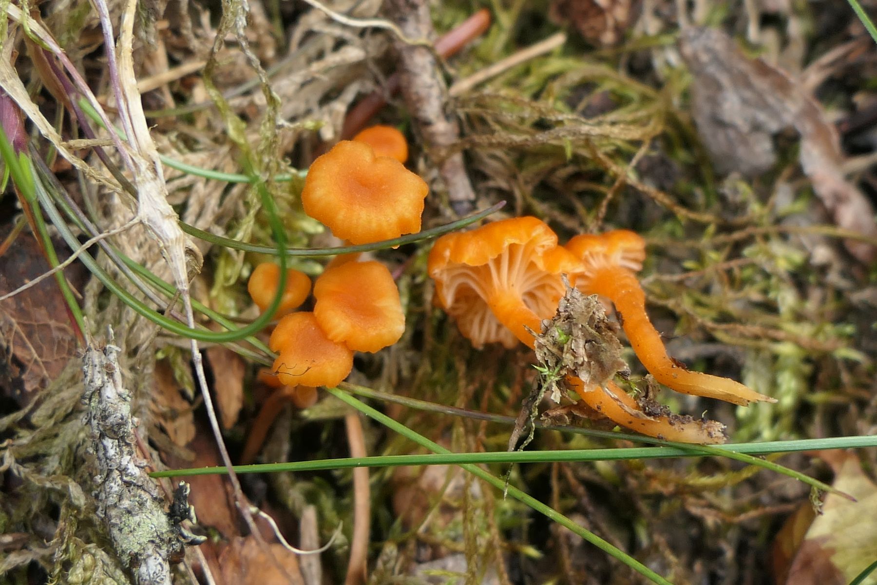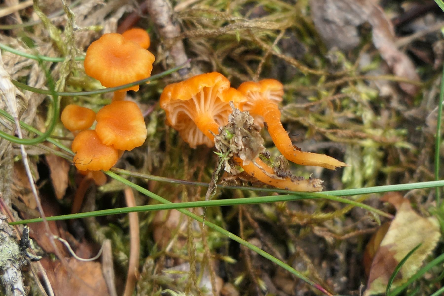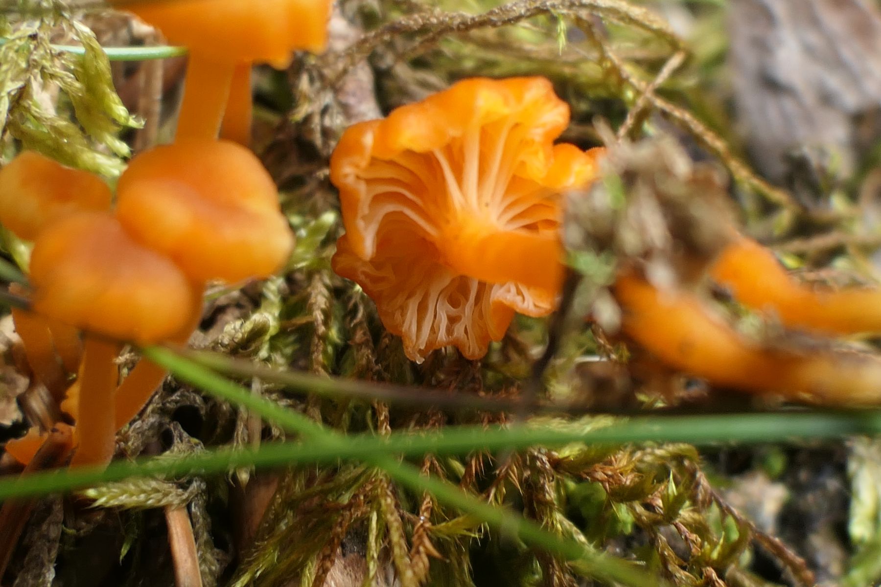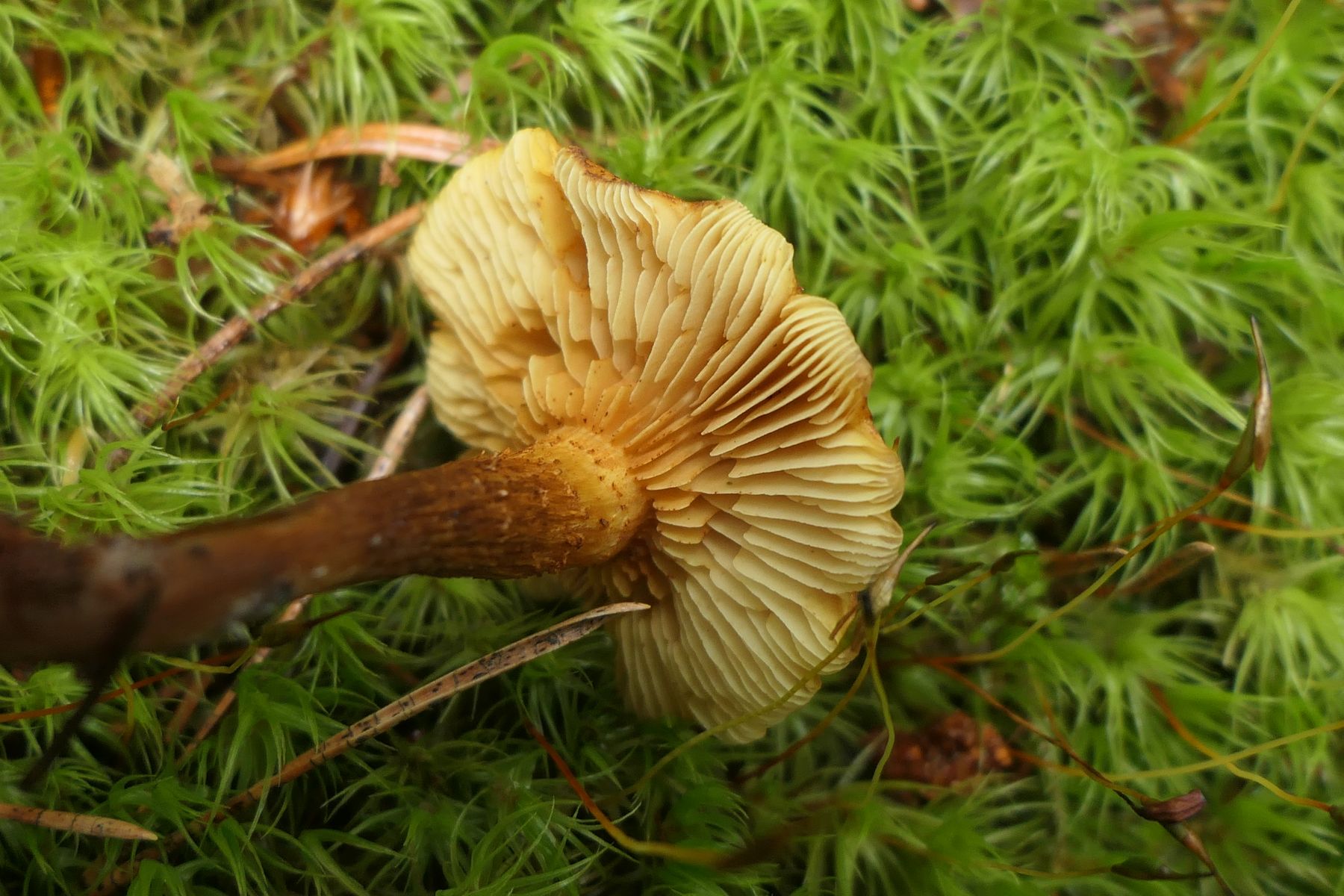04: Etwas auf dem Schlauch stehe ich bei folgendem Fund. Kleine Fruchtkörper gesellig (ca. 1,5cm). Aber irgendwie zu "kräftig" für Rickenella fibula. Den kenne ich irgendwie vom Hut auch anders. Für Cantharellus nicht passend, auch zu klein, erinnern an diese die kräftigen, fast leistenartige Lamellen. Irgendeine gelbe Omphalina? Auf vergrabenem Holz? Hut eher matt, nicht klebrig, Stiel auch nicht. Wie gesagt, ich stehe auf dem Schlauch und ein Mikroskop steht mir hier nicht zur Verfügung: