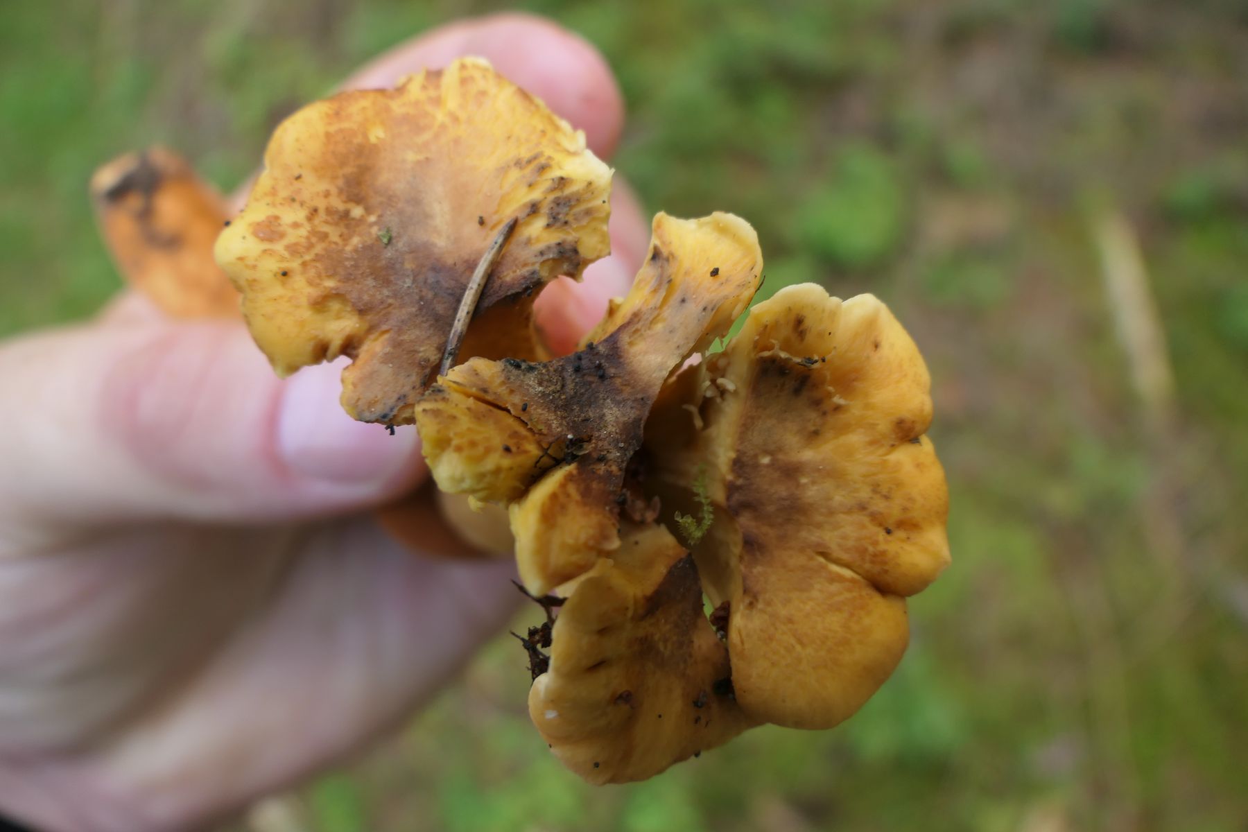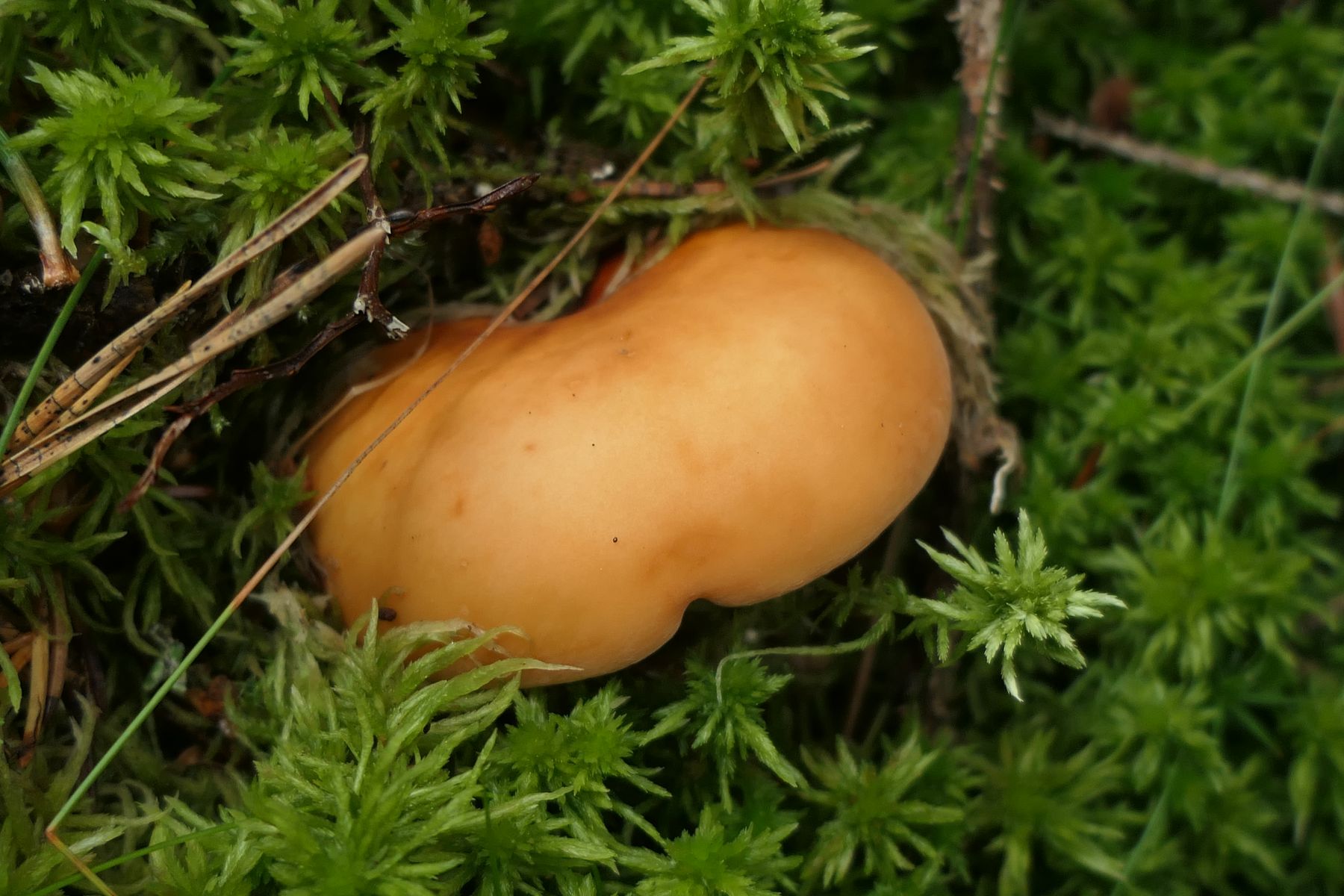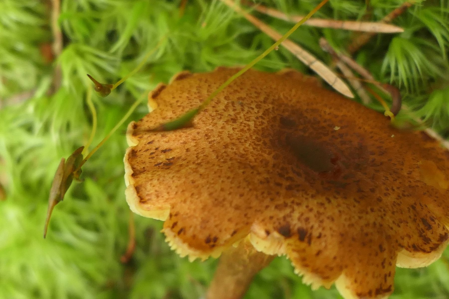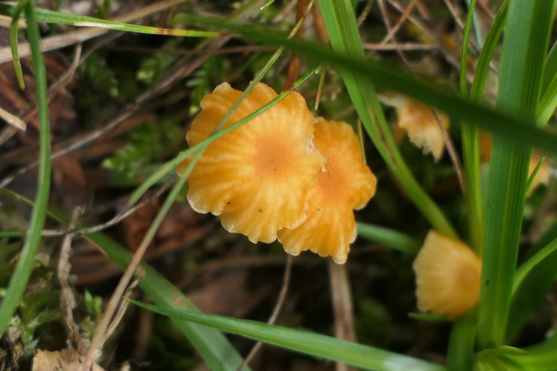 04: Etwas auf dem Schlauch stehe ich bei folgendem Fund. Kleine Fruchtkörper gesellig (ca. 1,5cm). Aber irgendwie zu "kräftig" für Rickenella fibula. Den kenne ich irgendwie vom Hut auch anders. Für Cantharellus nicht passend, auch zu klein, erinnern an diese die kräftigen, fast leistenartige Lamellen. Irgendeine gelbe Omphalina? Auf vergrabenem Holz? Hut eher matt, nicht klebrig, Stiel auch nicht. Wie gesagt, ich stehe auf dem Schlauch und ein Mikroskop steht mir hier nicht zur Verfügung: