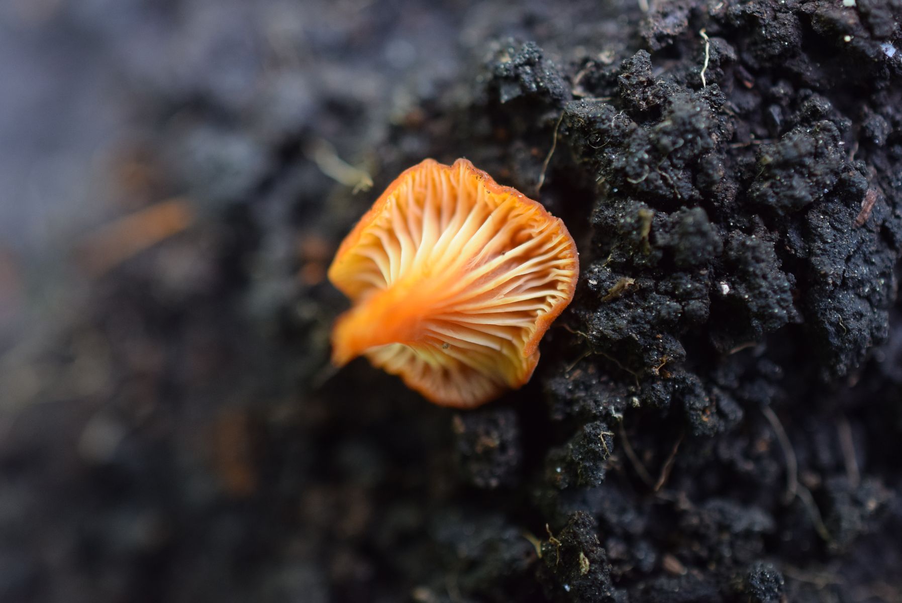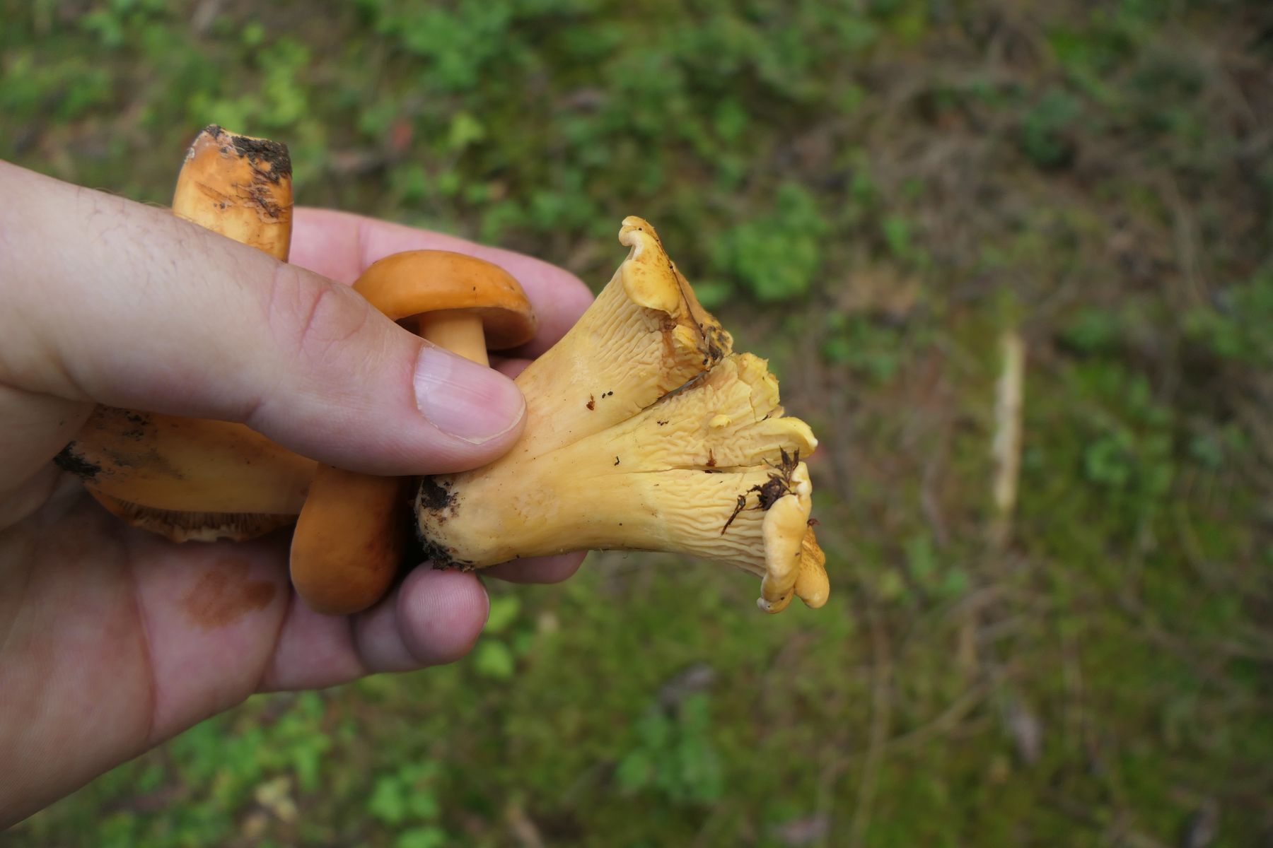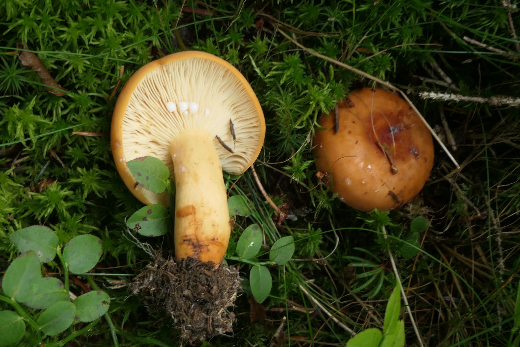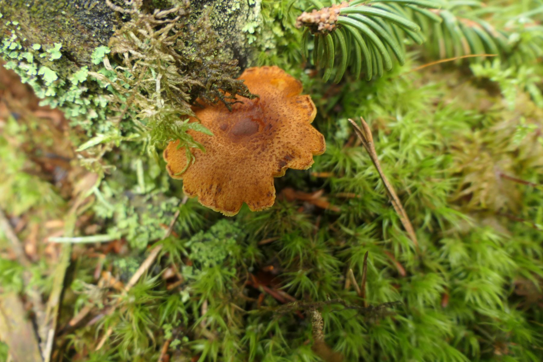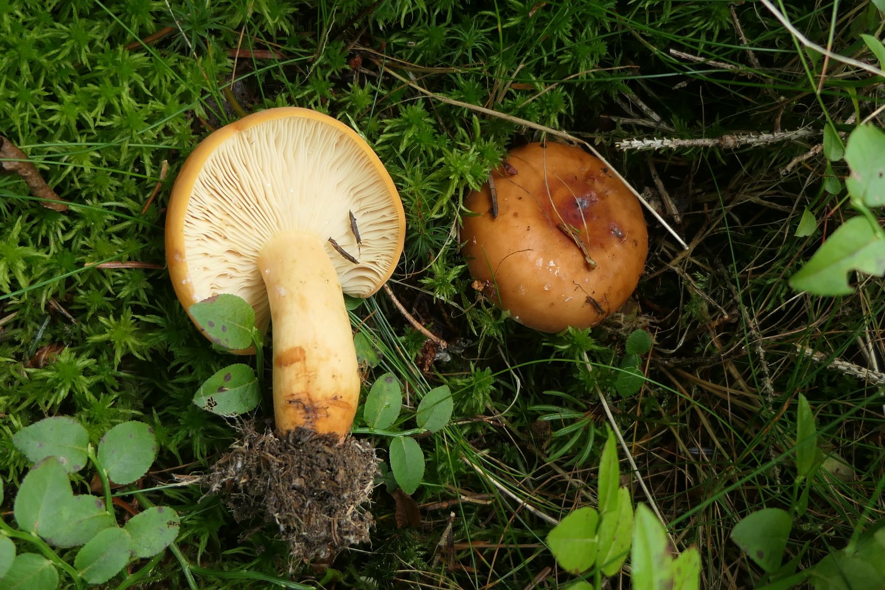 04: Etwas auf dem Schlauch stehe ich bei folgendem Fund. Kleine Fruchtkörper gesellig (ca. 1,5cm). Aber irgendwie zu "kräftig" für Rickenella fibula. Den kenne ich irgendwie vom Hut auch anders. Für Cantharellus nicht passend, auch zu klein, erinnern an diese die kräftigen, fast leistenartige Lamellen. Irgendeine gelbe Omphalina? Auf vergrabenem Holz? Hut eher matt, nicht klebrig, Stiel auch nicht. Wie gesagt, ich stehe auf dem Schlauch und ein Mikroskop steht mir hier nicht zur Verfügung: