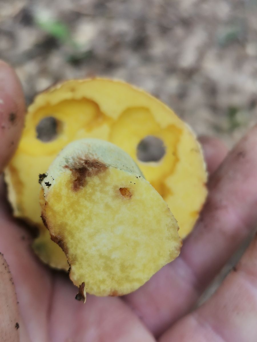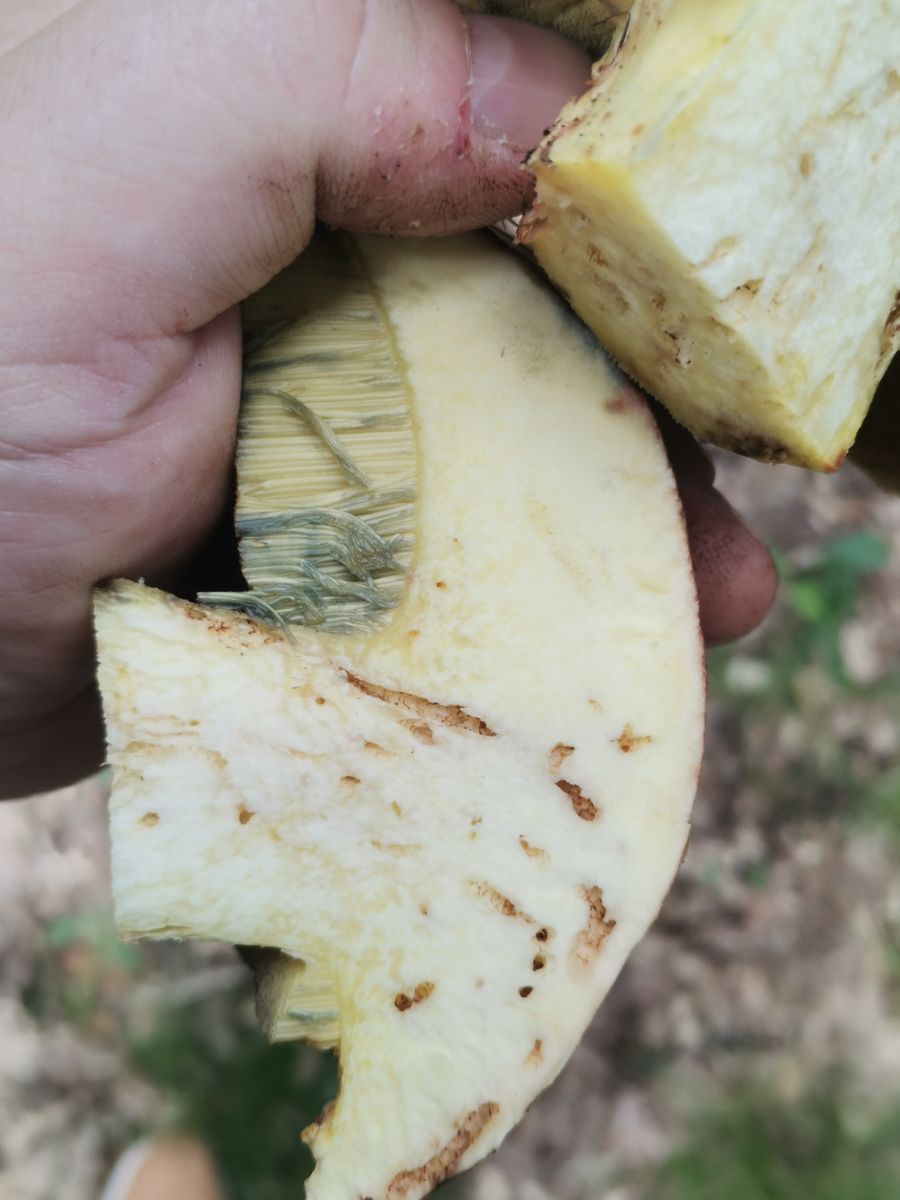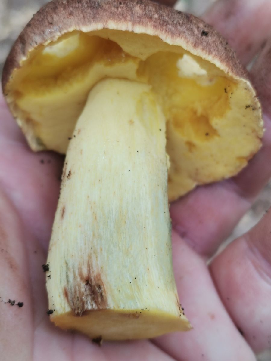 Warum schneidest du den ganzen Stiel ab, wenn du einen Pilz bestimmen willst? Schnittbild gibts auch keins. Ich meine, ein gelbes Netz an der Stielspitze zu sehen, und halte daher Butyriboletus für nicht unwahrscheinlich, weiter geh ich aber nicht.
