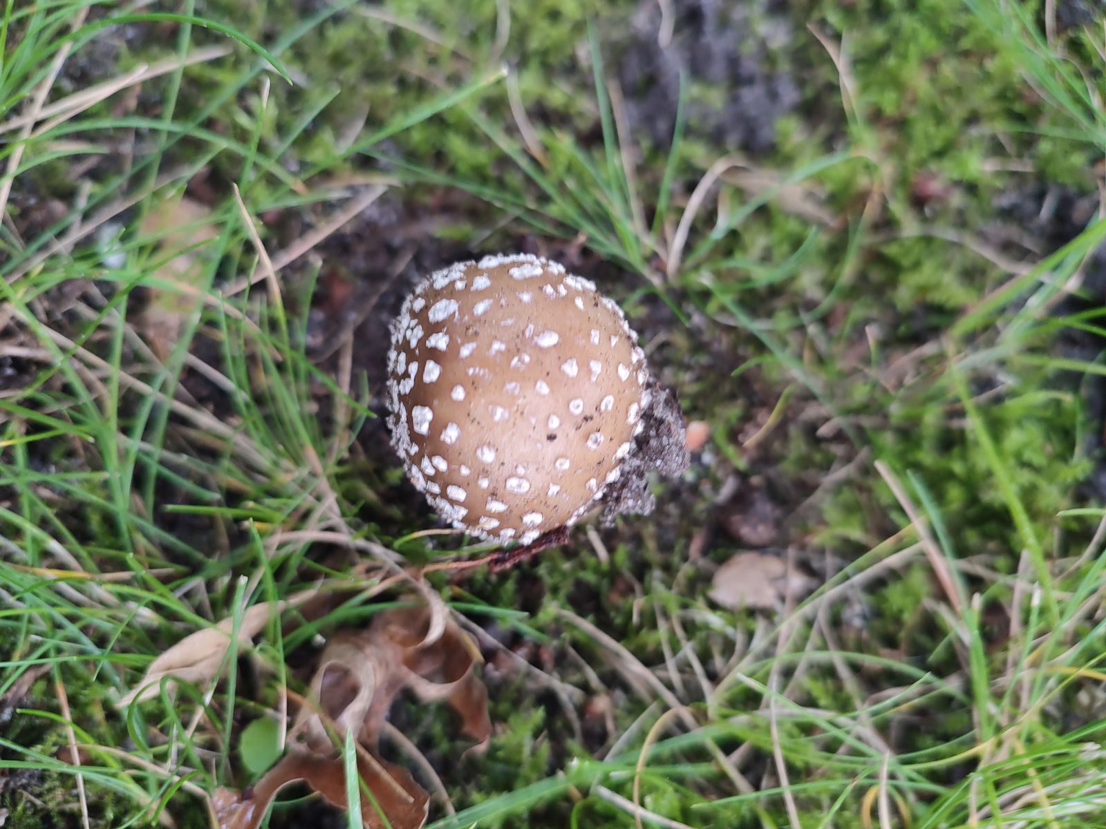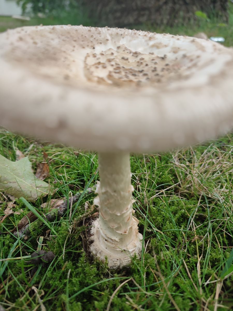 Von der Straße aus habe ich sie aus dem Augenwinkel entdeckt und natürlich auf eine Gruppe Perlpilze gehofft. Nachdem ich nirgends auch nur den Ansatz einer Rötung feststellen konnte, schloss ich selbige aus. Den Ring hätte ich dafür natürlich auch trotzdem gern gesehen.... Die dicke Knolle mit dem "Absatz" zum Stiel hin, den Bergsteigersöckchen haben mich dann zum Panther tendieren lassen. Wobei mir der Ring doch gefehlt hatte. Allerdings sieht der Jüngling auf dem Fotot von oben, von der Farbgebung her auch wirklich wie ein Bilderbuchpantherpilz aus. Grau mit weißen Flöckchen. Interessant zu sehen wie die älteren Exemplare immer heller werden.