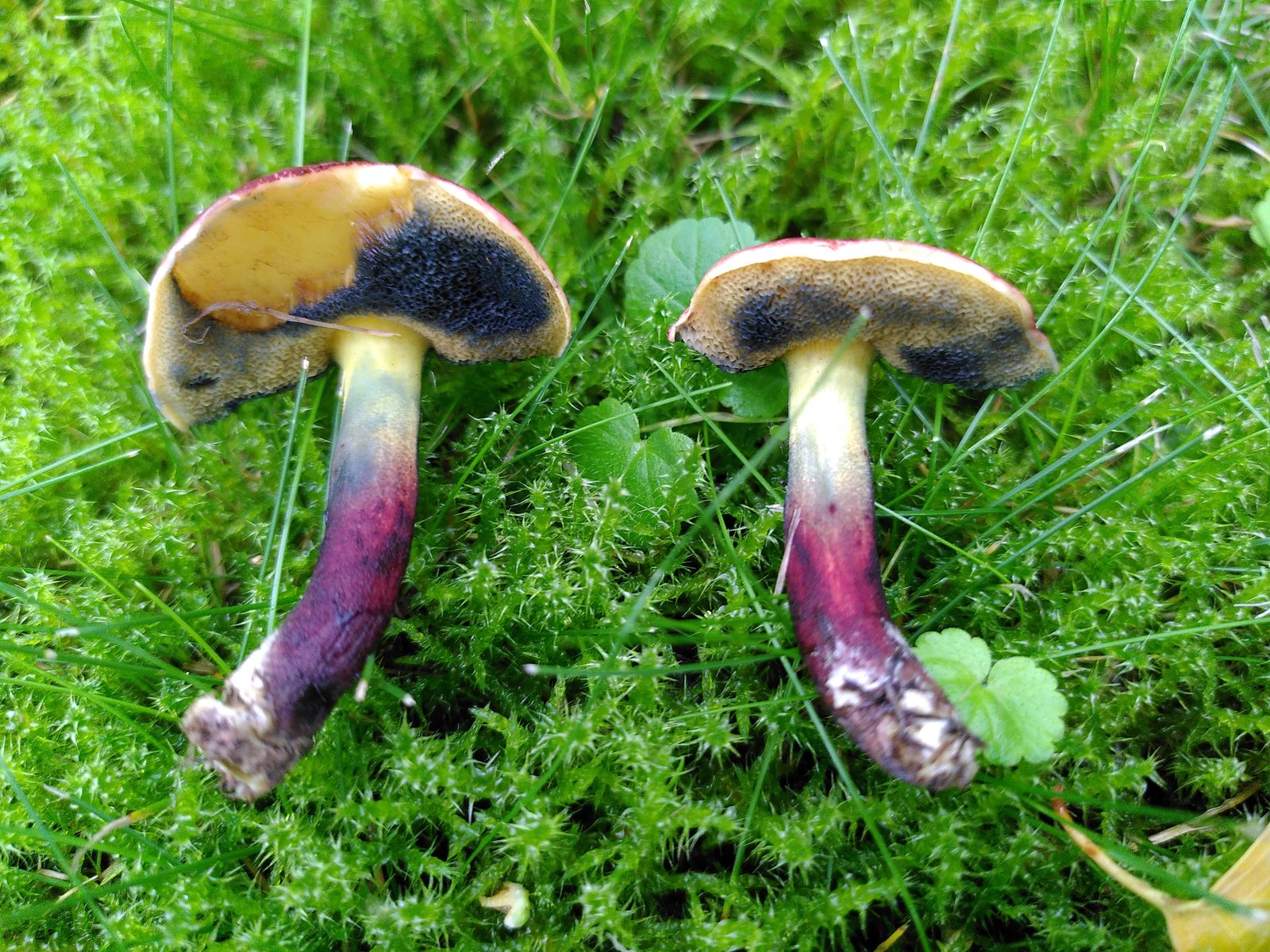 in einem Park, wo quasi ausschließlich Birke als Mykorrhizapartner in Frage kommt, konnte ich diesen interessanten, stark blauenden Filzröhrling finden. Wegen des Vorkommens an Birke glaube ich eher an X. fennicus als an X. cisalpinus. Zur Zeit lasse ich noch einen FK aussporen, um zu prüfen, ob die Sporen truncat sind. Was meint ihr zu dem Fund?
