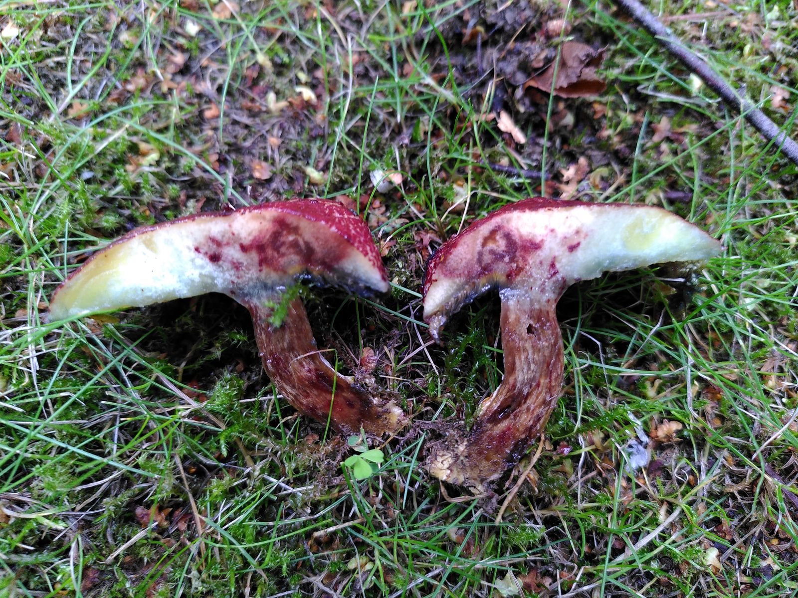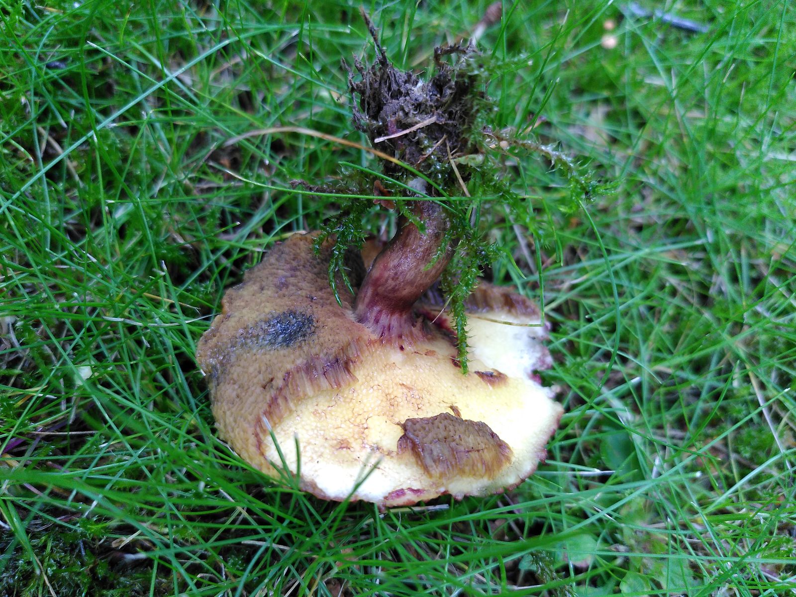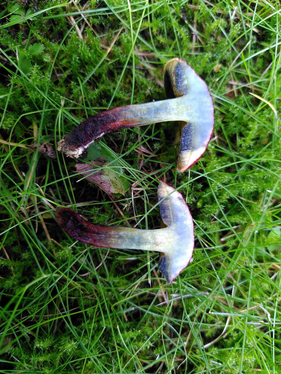 in einem Park, wo quasi ausschließlich Birke als Mykorrhizapartner in Frage kommt, konnte ich diesen interessanten, stark blauenden Filzröhrling finden. Wegen des Vorkommens an Birke glaube ich eher an X. fennicus als an X. cisalpinus. Zur Zeit lasse ich noch einen FK aussporen, um zu prüfen, ob die Sporen truncat sind. Was meint ihr zu dem Fund?