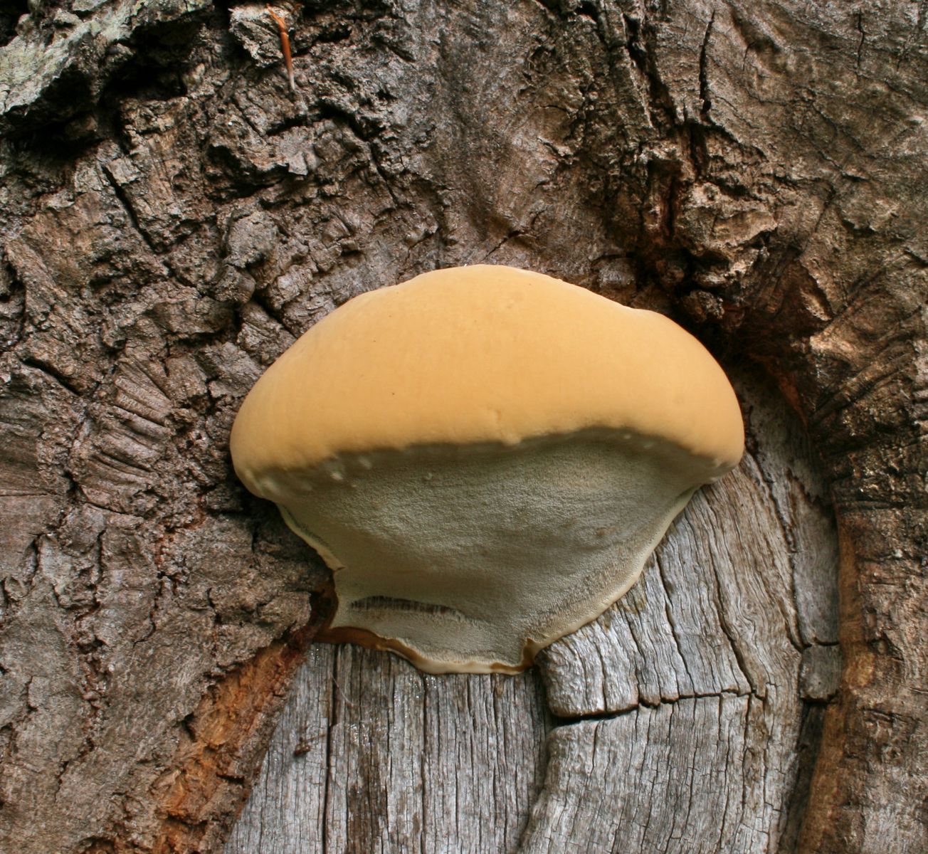 Ich habe einen ähnlichen Lackporling an Eiche seit 2,5 Wochen in Beobachtung. Anfangs war es nur ein hellgelber, breiter Wulst. Inzwischen hat er eine "Haut" bekommen, die sich aber locker eindrücken lässt – dann tritt "Saft" aus (siehe letztes Bild). Die Oberfläche habe ich mal mit dem Messer geschabt – schmilzt nicht mit dem Feuerzeug. Also ein bisschen widersprüchlich das Ganze. Ich kenne beide Arten noch nicht und vermute, die klassische = bestimmungsfähige Oberfläche (bezügl. Farbe, Glanz, Festigkeit) stellt sich erst mit höherem Alter dar. Da schon Sporen drauf liegen, habe ich heute ein Stück mitgenommen zum Mikroskopieren – vielleicht werde ich dann schlauer... Eure Einschätzunge dazu würden mich auch interessieren.