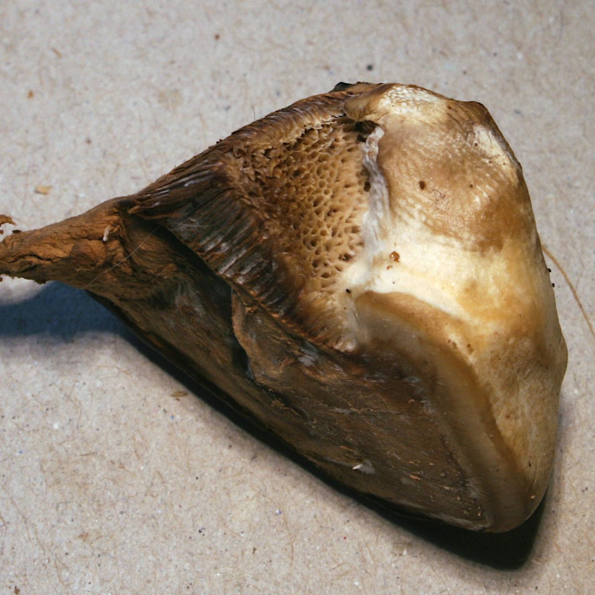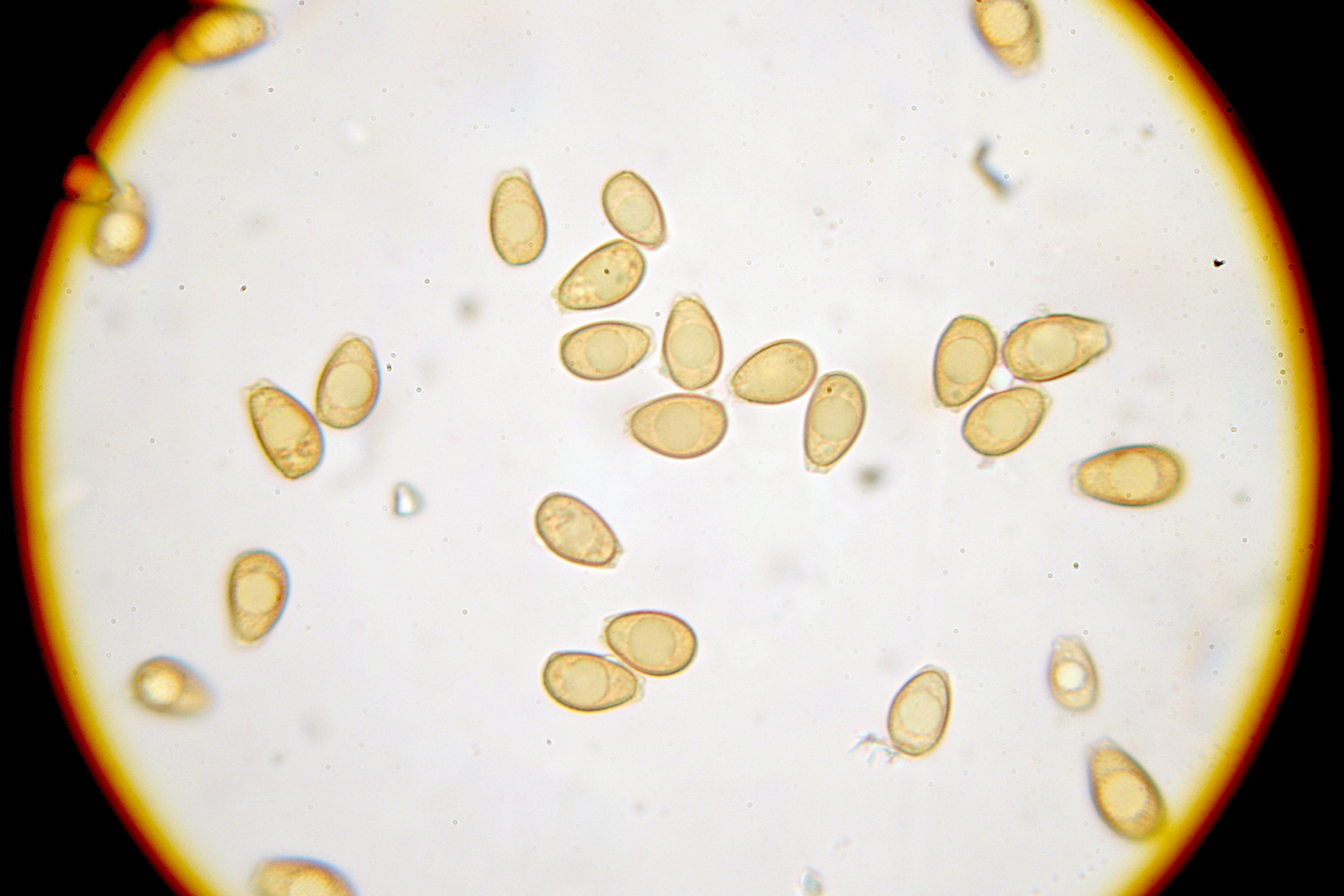 Das Blöde ist nur, dass ich weder die Oberfläche noch das Abgeschabte davon mit dem Feuerzeug zum Schmelzen bringe. Vorhin habe ich das mitgenommen Stückchen unterm Mikro gehabt, in der Hoffung über die Sporen weiterzukommen: sie liegen genau mittendrin zwischen G. resinaceum und G. adspersum (10,7) 11,2 (12,3) x (6,8) 7,1 (7,9) µm, n = 20. Allerdings habe ich ohne Exosporium gemessen, sonst kämen 1...1,5 µm vor allem in der Länge dazu. An dem Stückchen machte ich noch eine interessante Beobachtung: beim Rausschneiden hatte es wieder "geweint", und mittlerweile ist diese Träne zu einer glänzenden Schicht eingetrocknen ... die ich wieder nicht schmelzen kann. Naja, Ryvarden & Gilbertson schreiben in European Polypores, Gandoderma wäre eine der schwierigsten Arten zur Bestimmung... wie beruhigend! :D