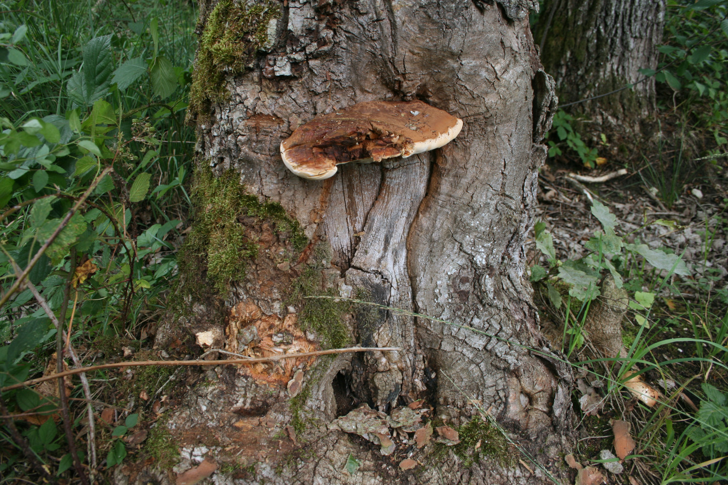 ja, ich war schon wieder dort. Aber die Waldarbeiter haben inzwischen Langholz gerückt... ohne Rücksicht auf Verluste. Auf diese Art und Weise wurde die Eiche anscheinend schon öfter verletzt, wie man an der Wunde sieht, in der nun der Lackporling fruktifiziert. Ich traue mich kaum, da jetzt noch einen größeren Schnitt zu machen – soll er sich vllt. erst mal erholen?!