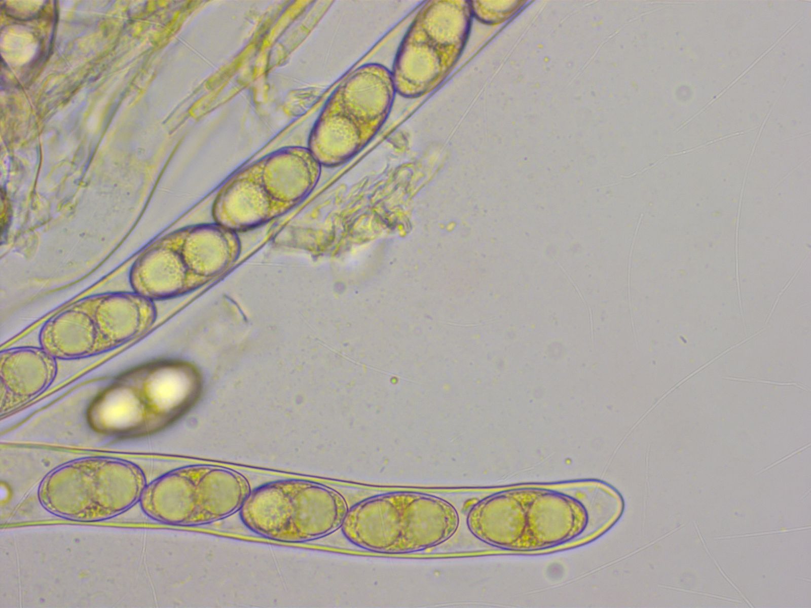 Sporen recht gross, um 25-28 x 12-13 µm, glatt, mit zwei Tropfen.
