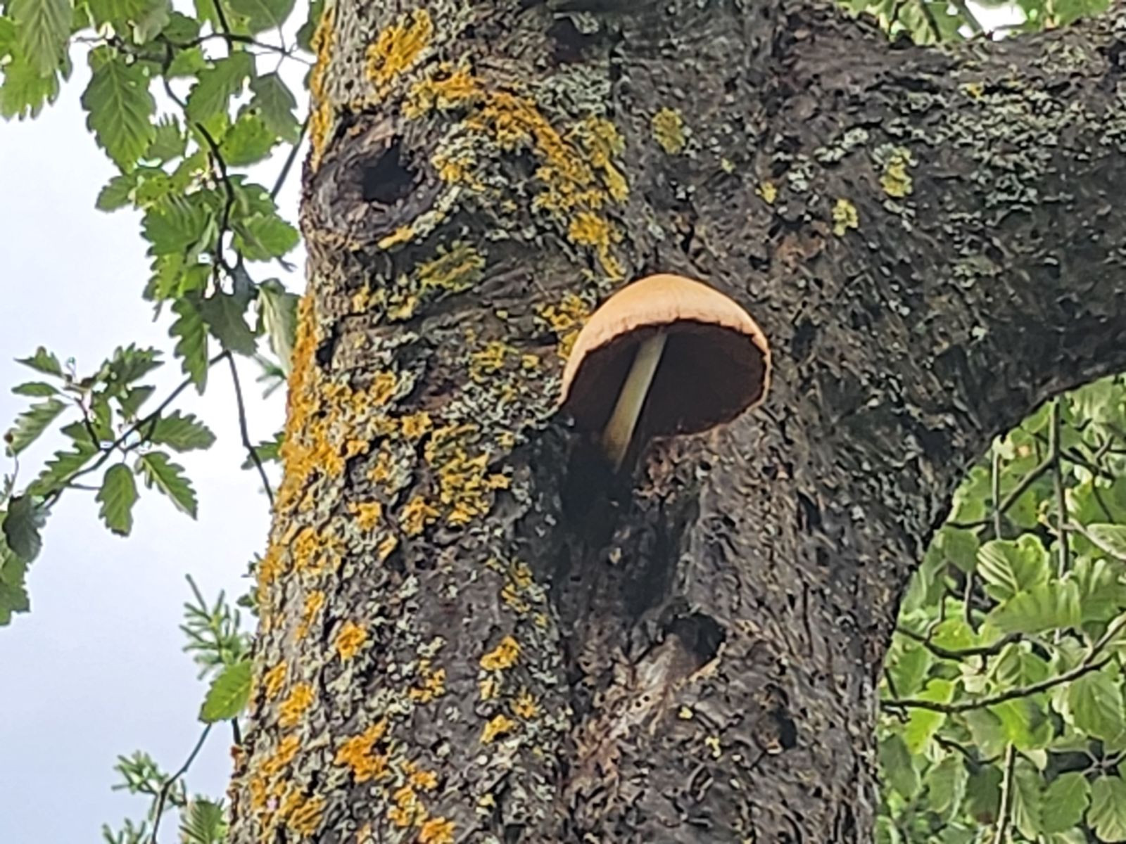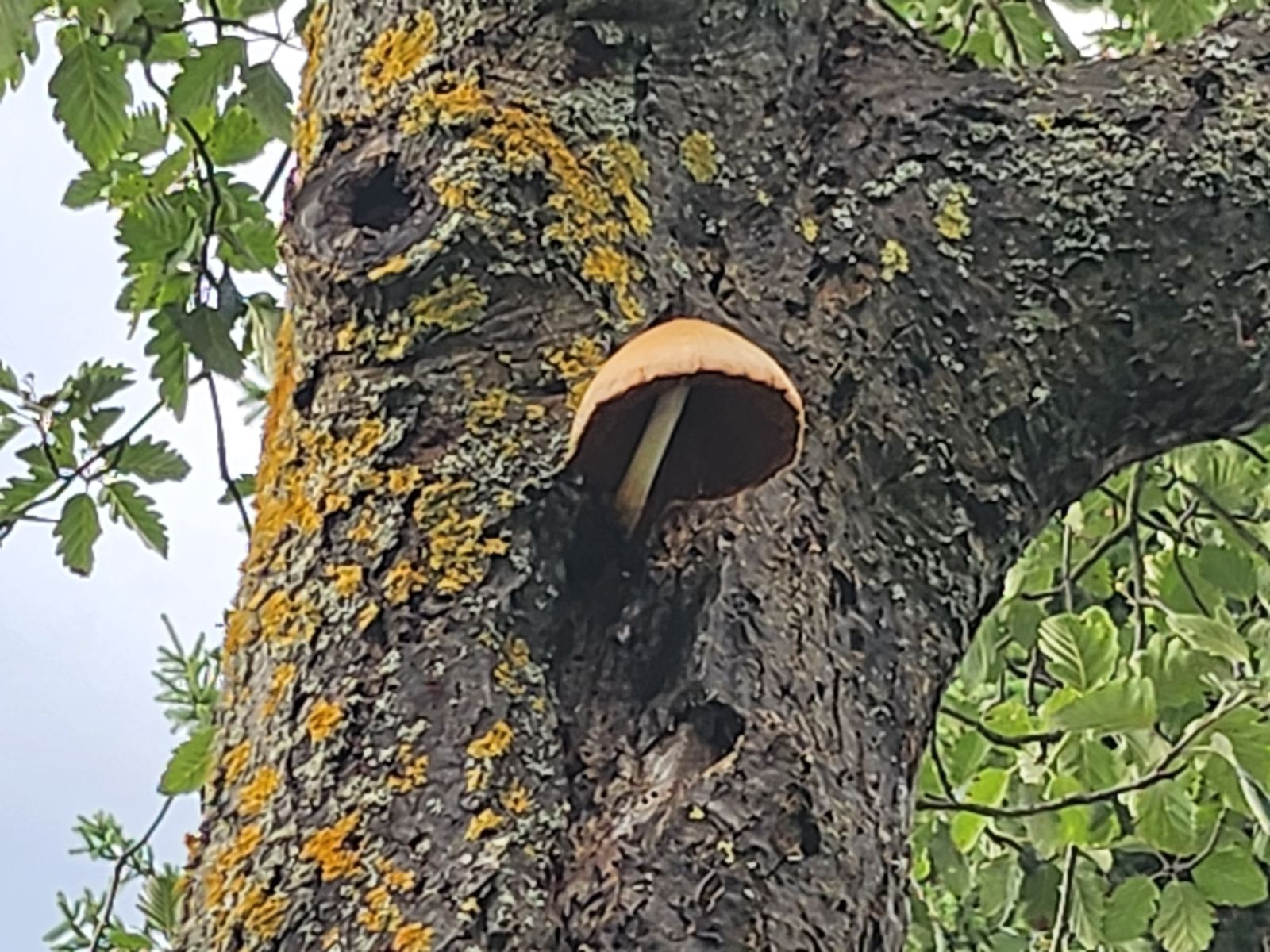 Als ich mich einem der Bäume mit grünem Punkt näherte, dachte ich zunächst auch an den Schillerporling. Doch dann sah ich, dass es ein Hutpilz ist. Siehe Fotos: